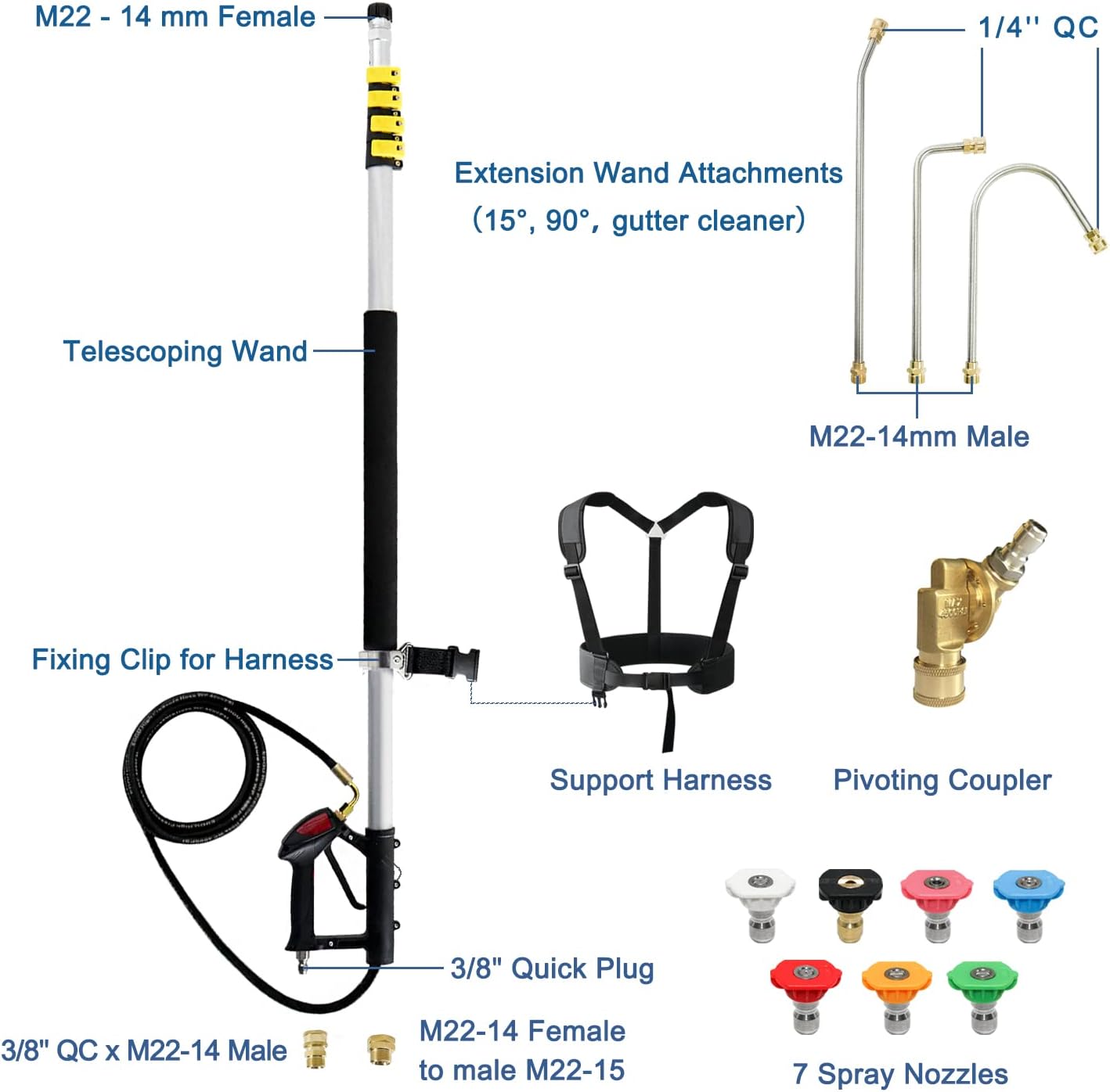 - MORE CONVENIENCE – There are 4 adjustable sections with lever locks,set up the length you need, then lock it down for even results.M22-14mm male thread outlet keeps extension wands stable.Equipped with 2 hose adapters,3/8” QC inlet fits most pressure washer hose.