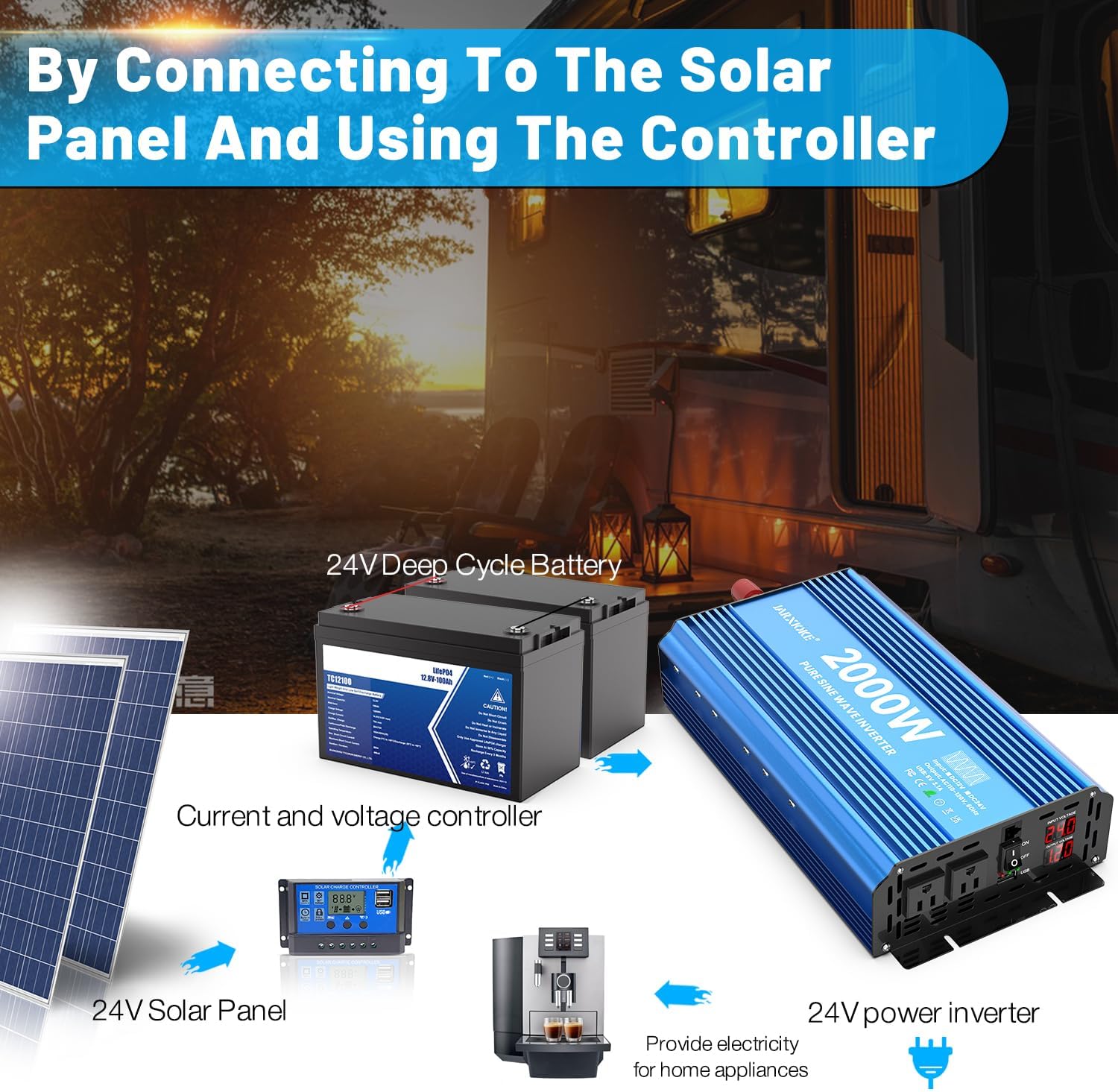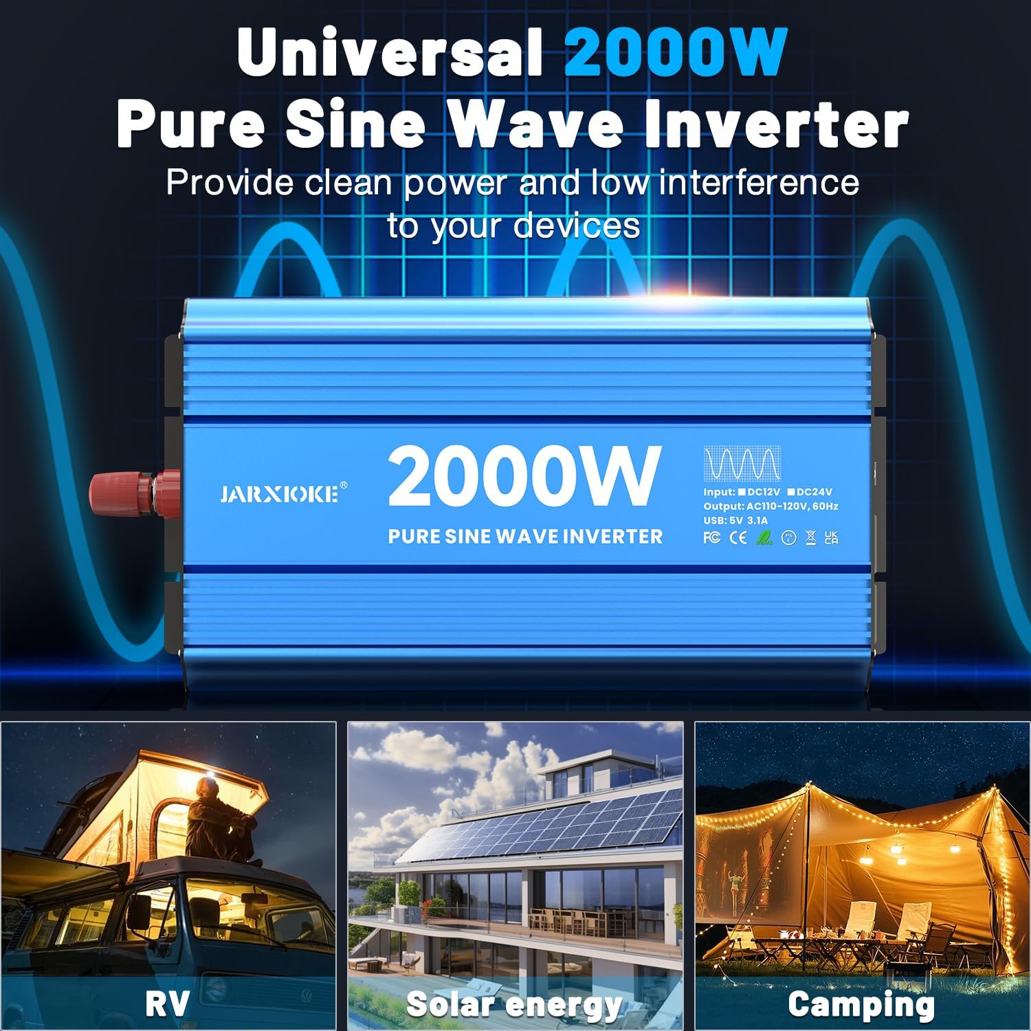 - ?[Upgraded Pure Sine Wave] The JARXIOKE inverter delivers true 2000W continuous and 4000W peak power. 12V to 110/120VAC pure sine wave technology provides high conversion efficiency (>90%) and low no-load losses for more energy savings.