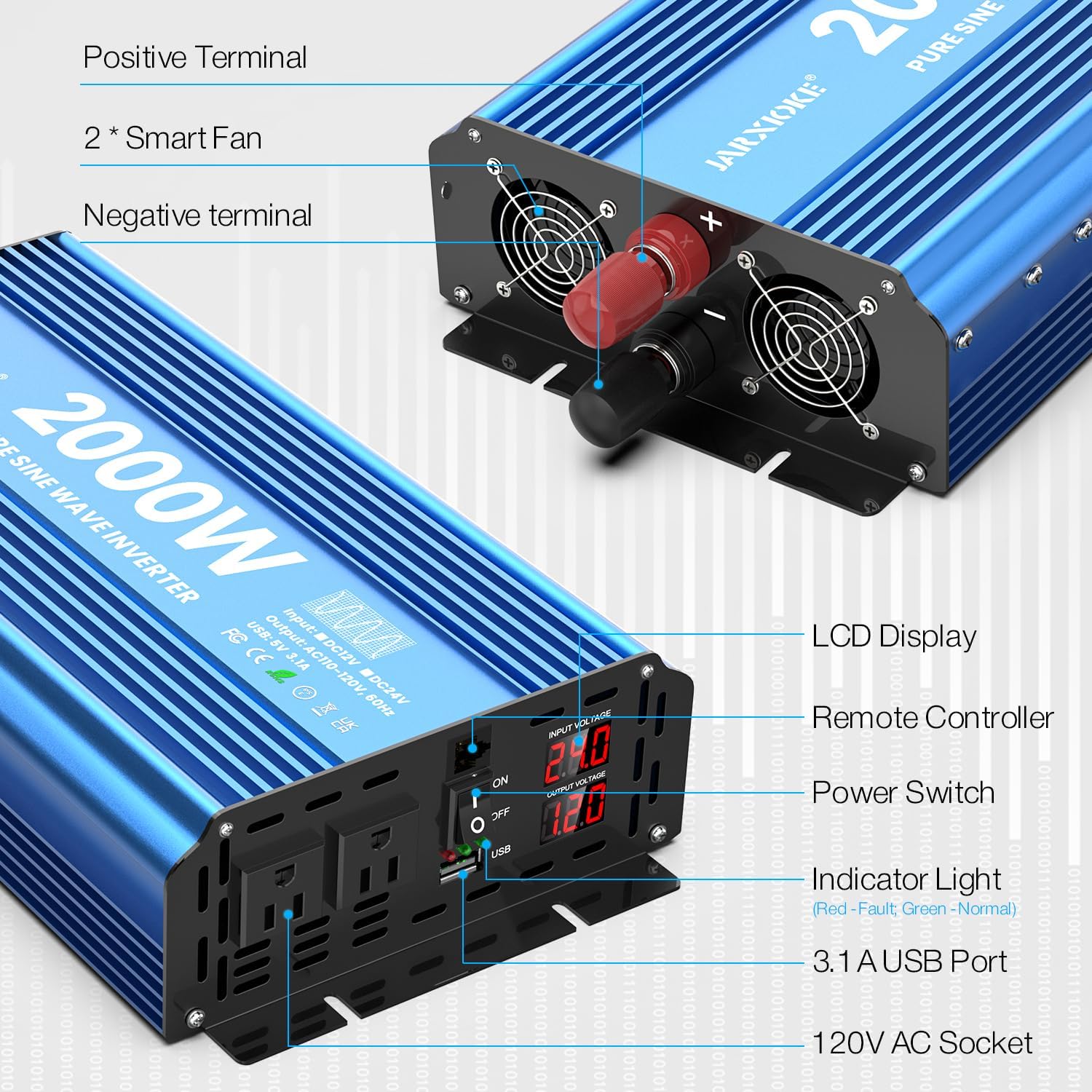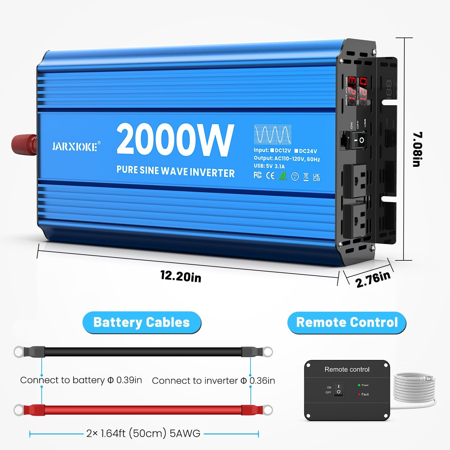 | Included Components | JARXIOKE 2000W 12V Pure Sine Wave Inverter, battery cables, 2 AC power outlets, 1 USB port |
