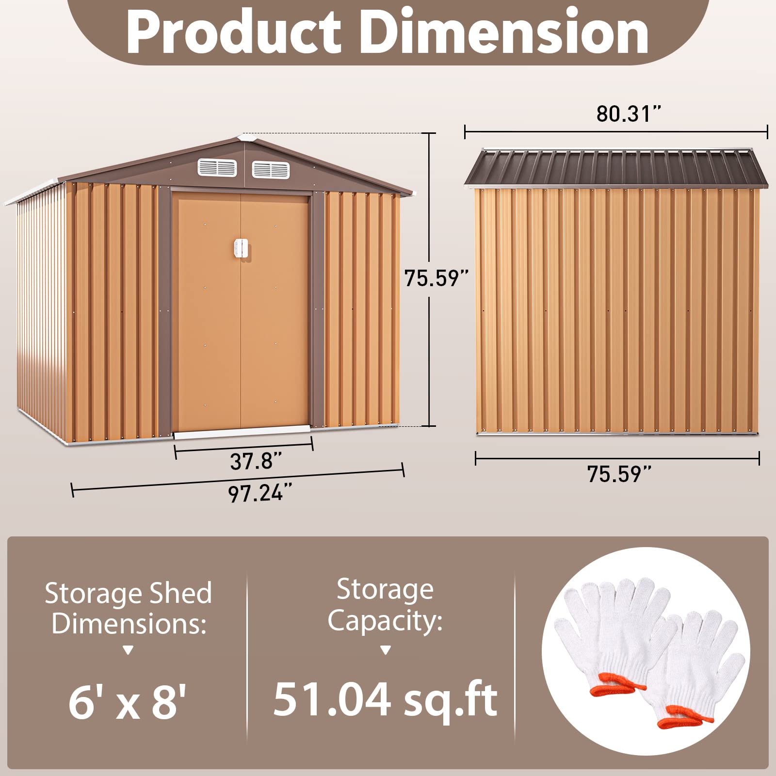 - ud83dudd27u3010Spacious Storage Shedu3011: Our outdoor shed is designed with a spacious inner measured 97.3″L x 75.61″W x 76″H, making it easier to store your large gardening tools and other backyard items, such as bike, lawn equipment, pool supplies, barbecue supplies.