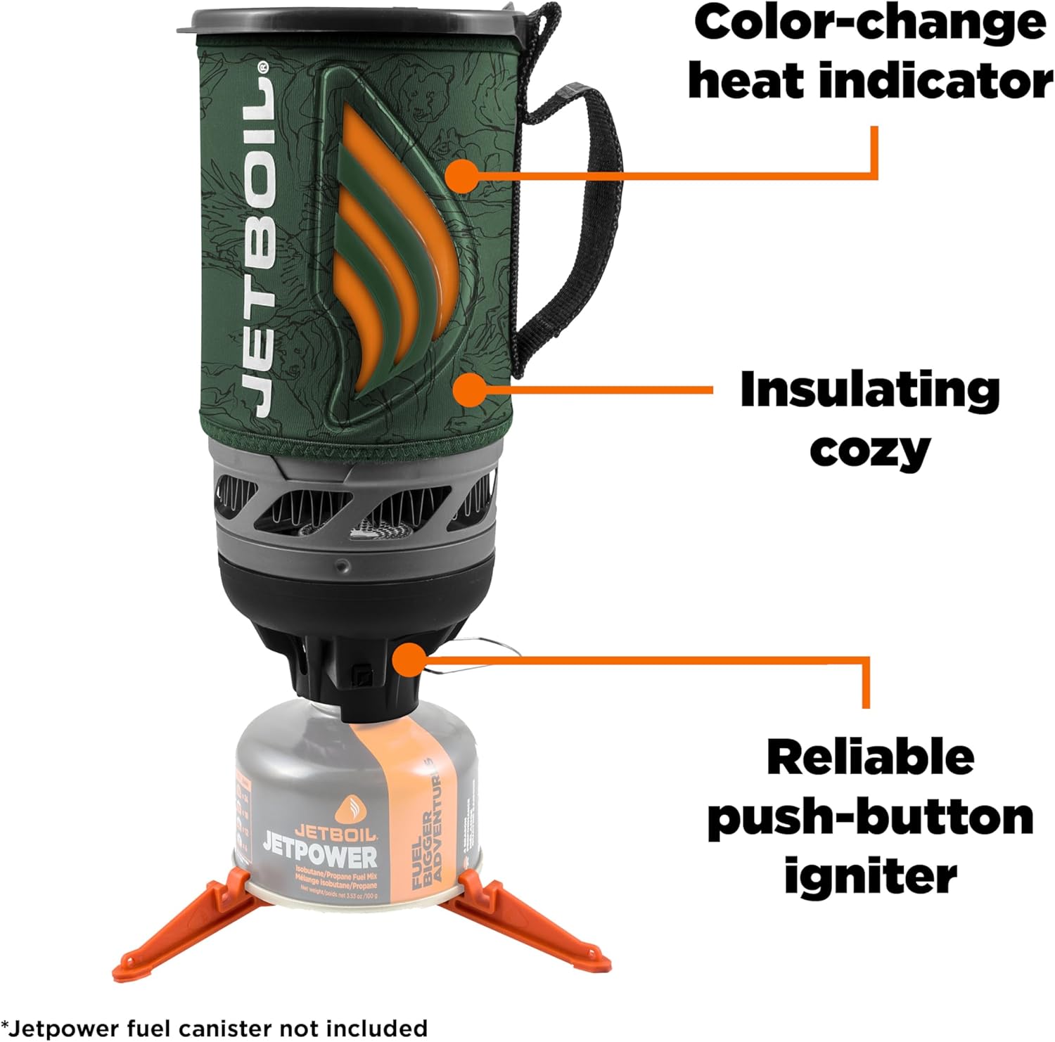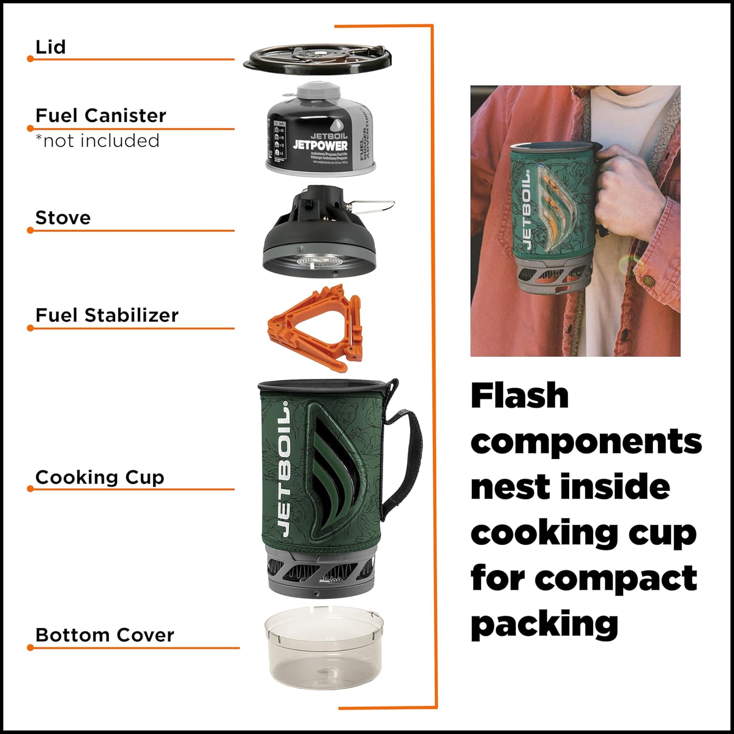 - Compatible Jetboil accessories, such as a coffee press*, hanging kit*, pot support*, skillet*, FluxRing cooking pot*, and utensils* make this a necessity for your next backpacking adventure. *Accessories sold separately.