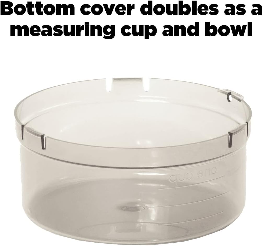 - Bottom cup doubles as a measuring cup and a bowl.