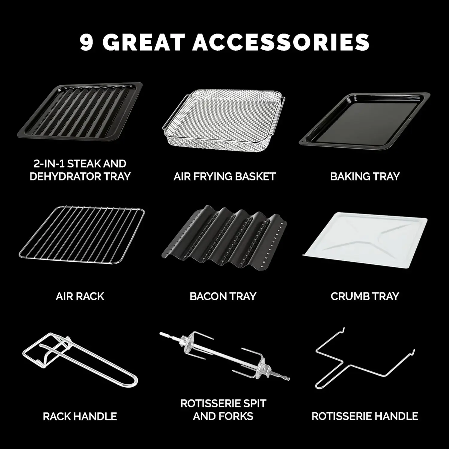 - ENJOY 9 DO-IT-ALL ACCESSORIES ?? MAXX-IMIZE your cooking possibilities! A versatile collection of accessories includes an air frying basket, baking tray, air rack, crumb tray, bacon tray, steak tray, rotisserie spit & forks, rack handle, and rotisserie handle. Plus, a bonus cookbook featuring a diverse assortment of easy-to-follow, chef-inspired recipes