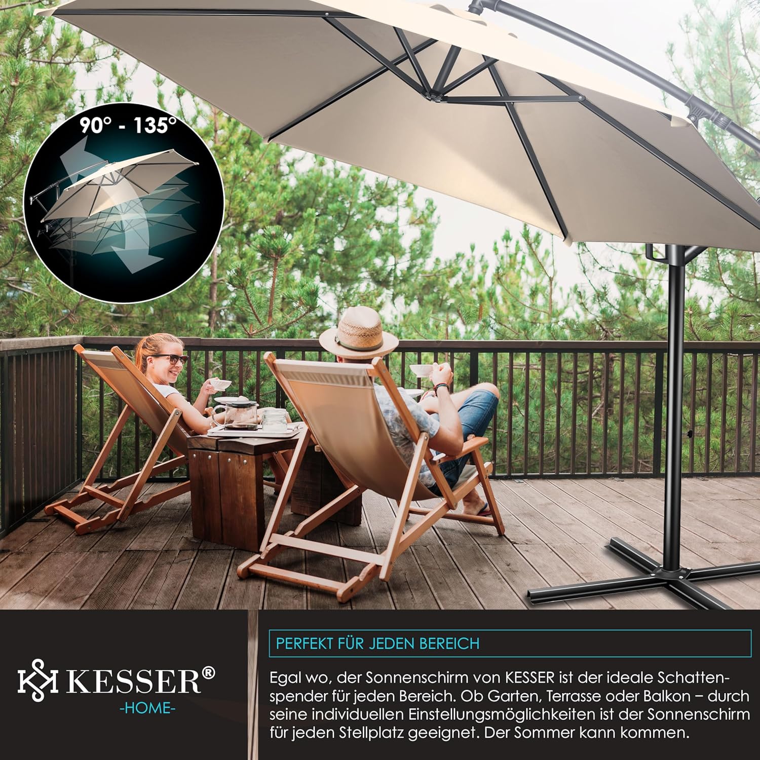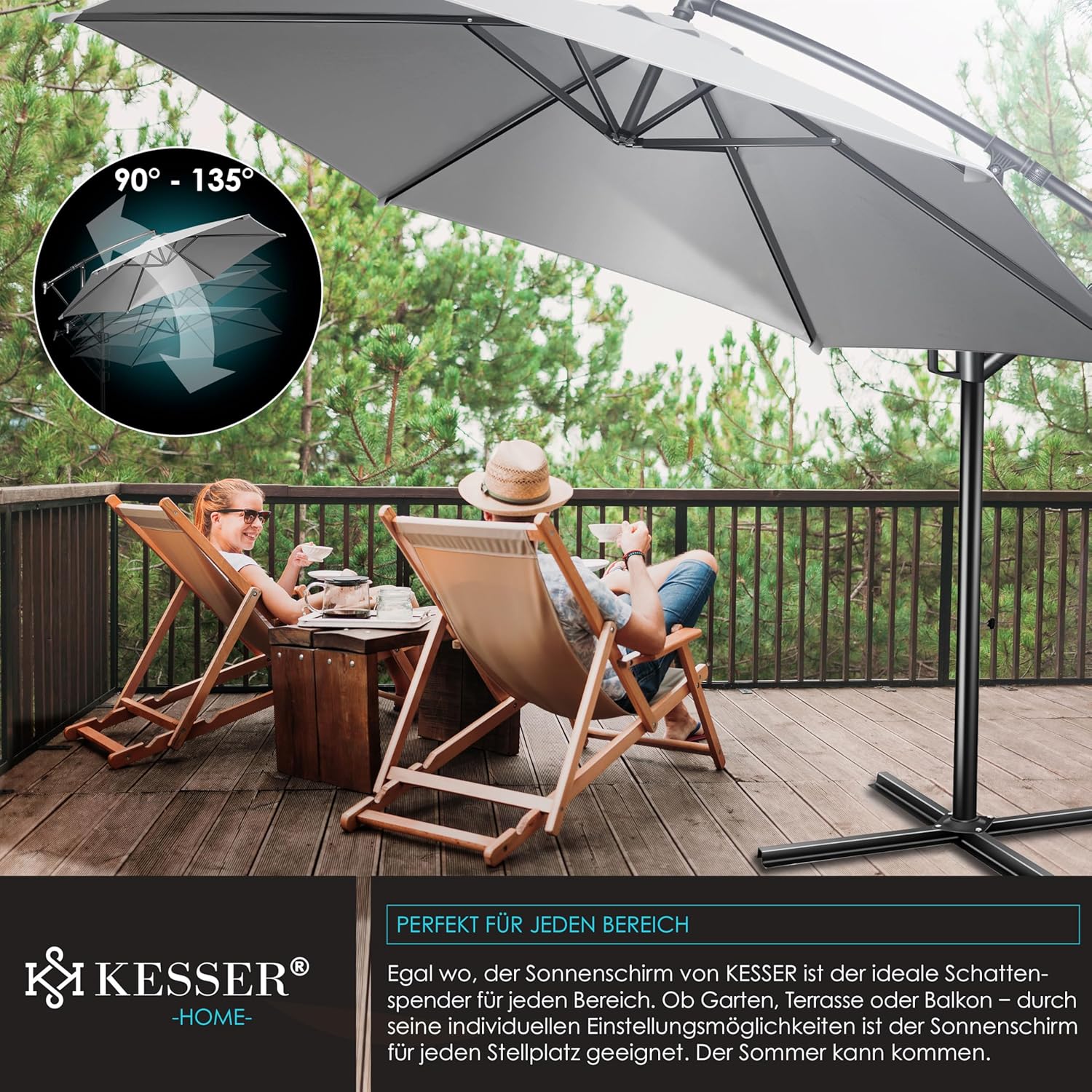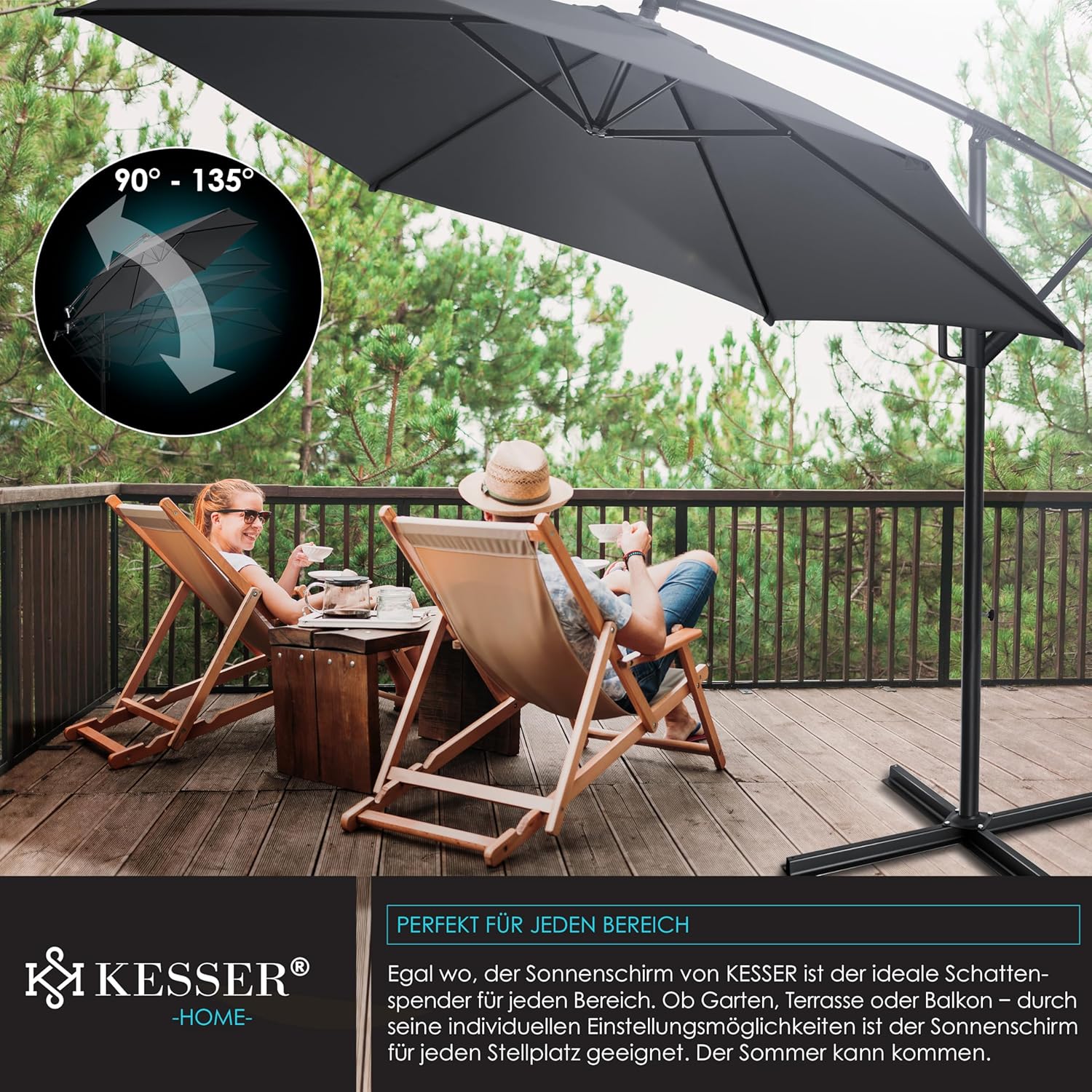 Summer is close to reach, a cloudless sky and the temperatures are fast upwards. With the Kesser cantilever parasol, you protect yourself and your guests from direct UV radiation and at the same time create a shady spot on your balcony, terrace or in the garden. Grab a cool drink, a good book and enjoy the day carefree with our great shade dispenser.
