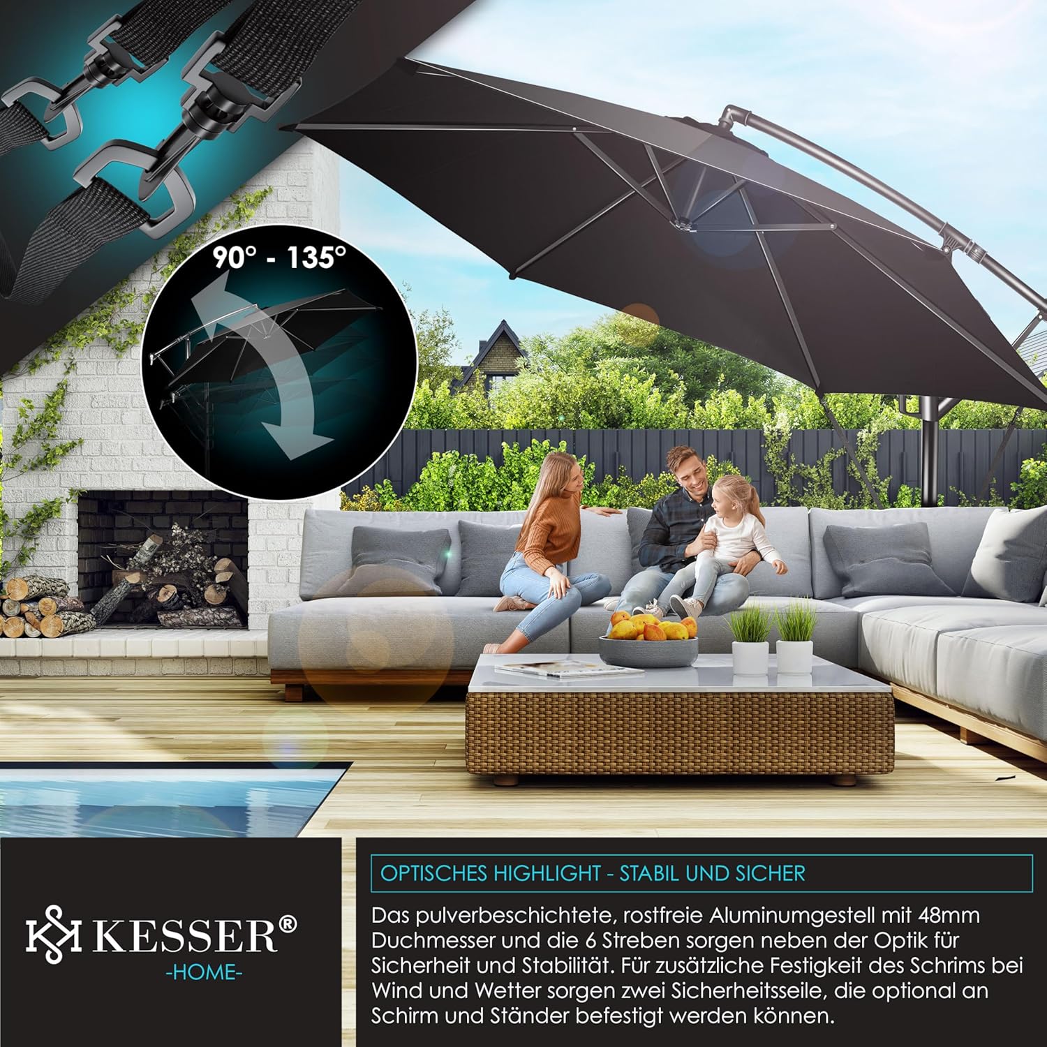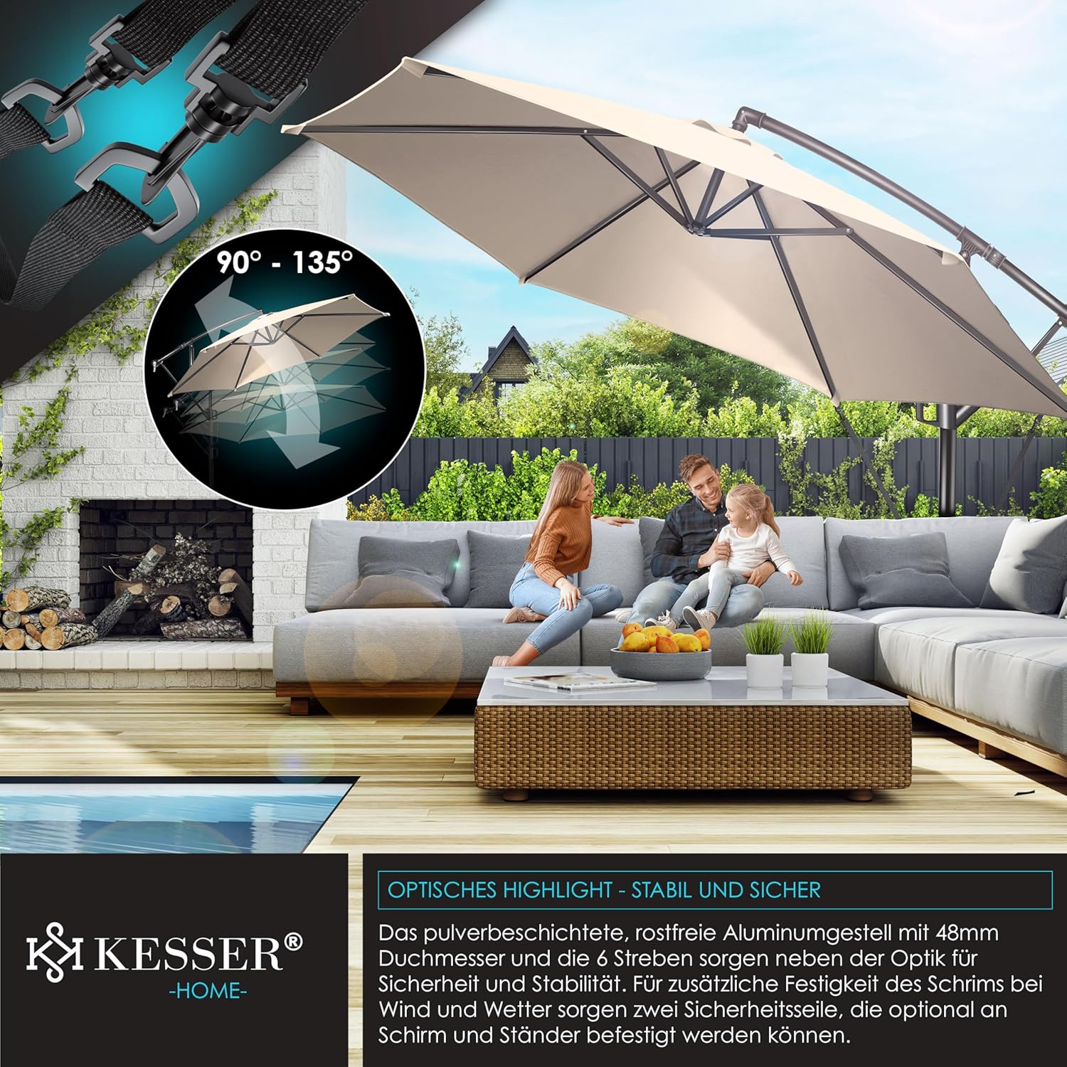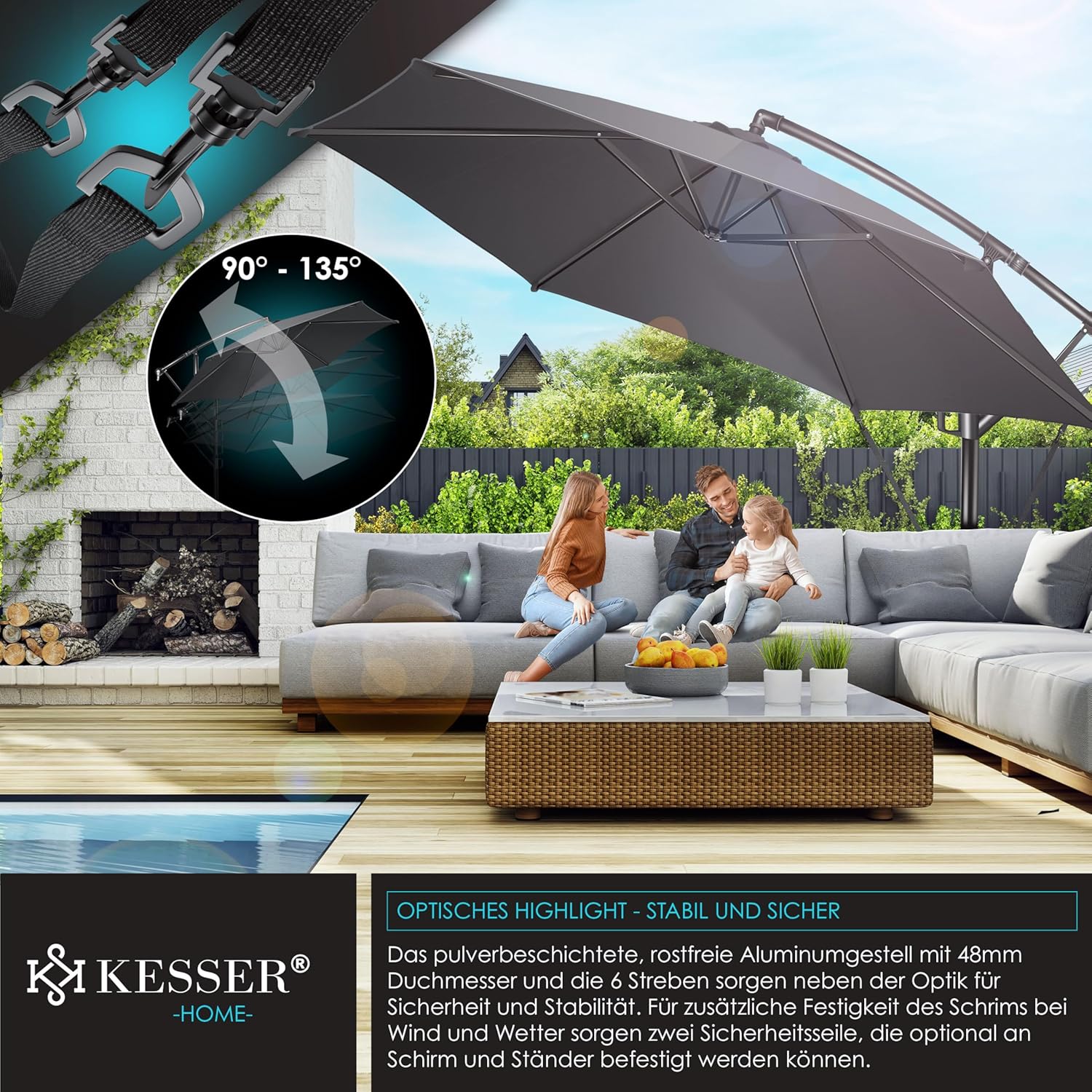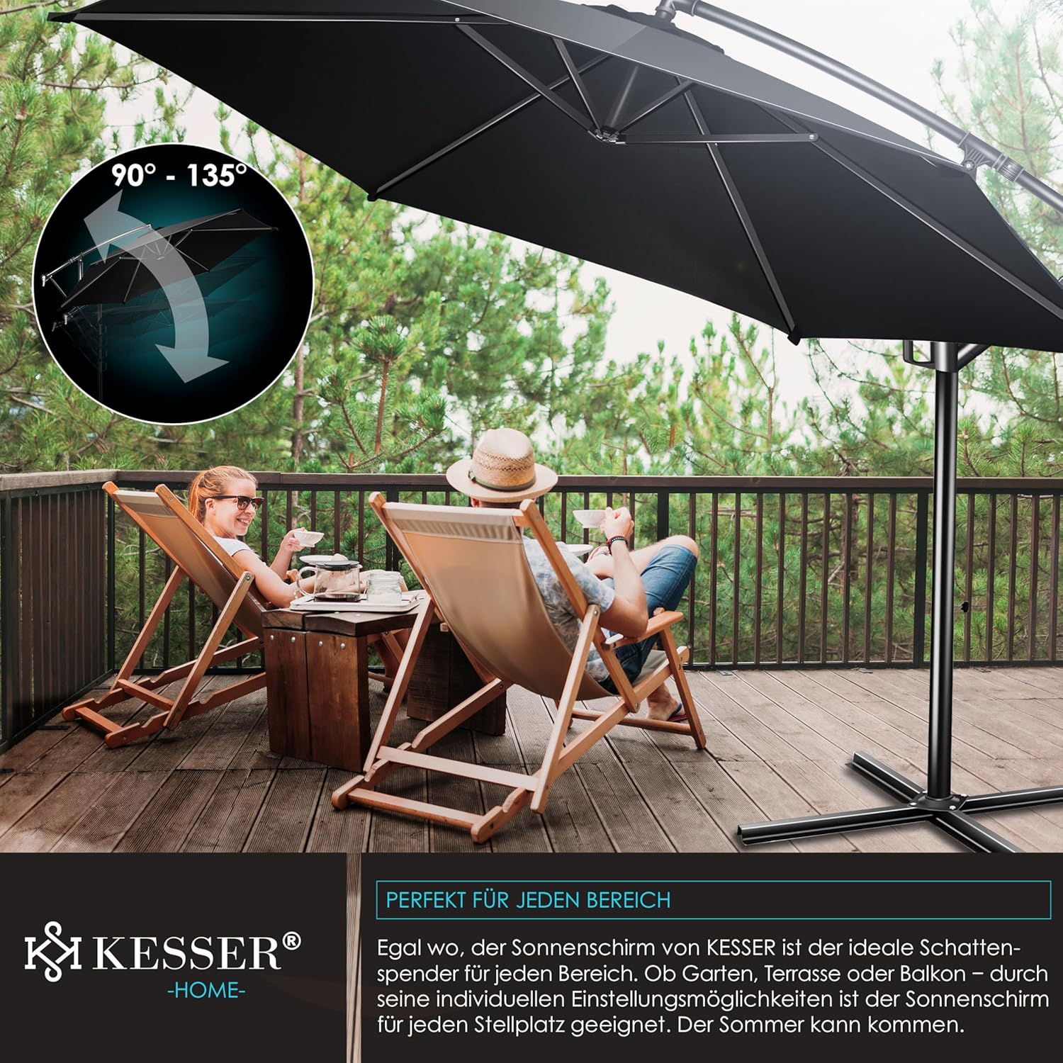 Summer is close to reach, a cloudless sky and the temperatures are fast upwards. With the Kesser cantilever parasol, you protect yourself and your guests from direct UV radiation and at the same time create a shady spot on your balcony, terrace or in the garden. Grab a cool drink, a good book and enjoy the day carefree with our great shade dispenser.