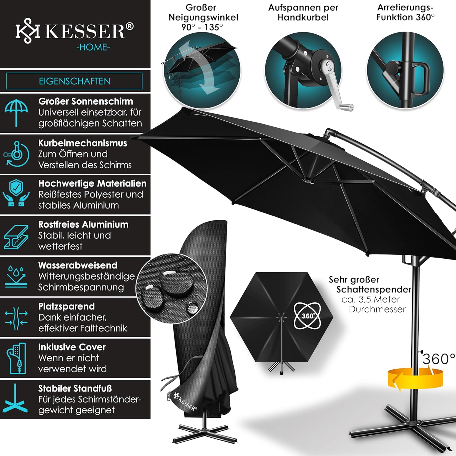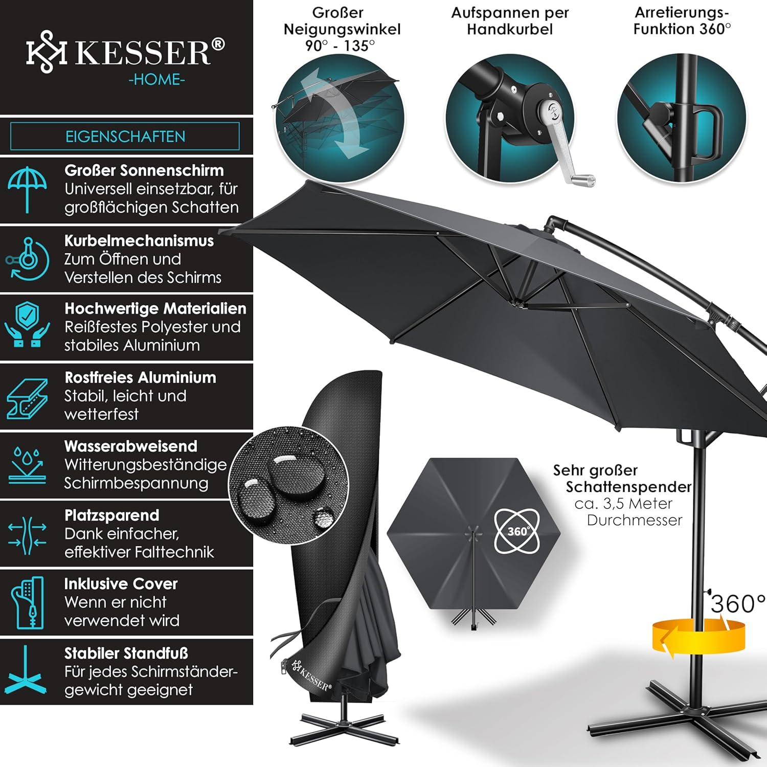 KESSER? Aluminium Cantilever Parasol + Cover Diameter 350 cm and Crank Device Crank Umbrella with Stand UV Protection Aluminium Water-Repellent Canopy 360?? Function Garden Umbrella Market Umbrella