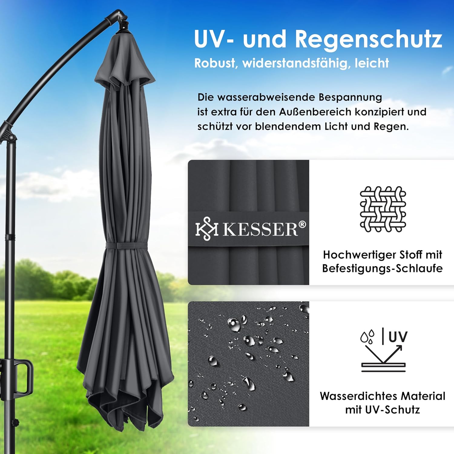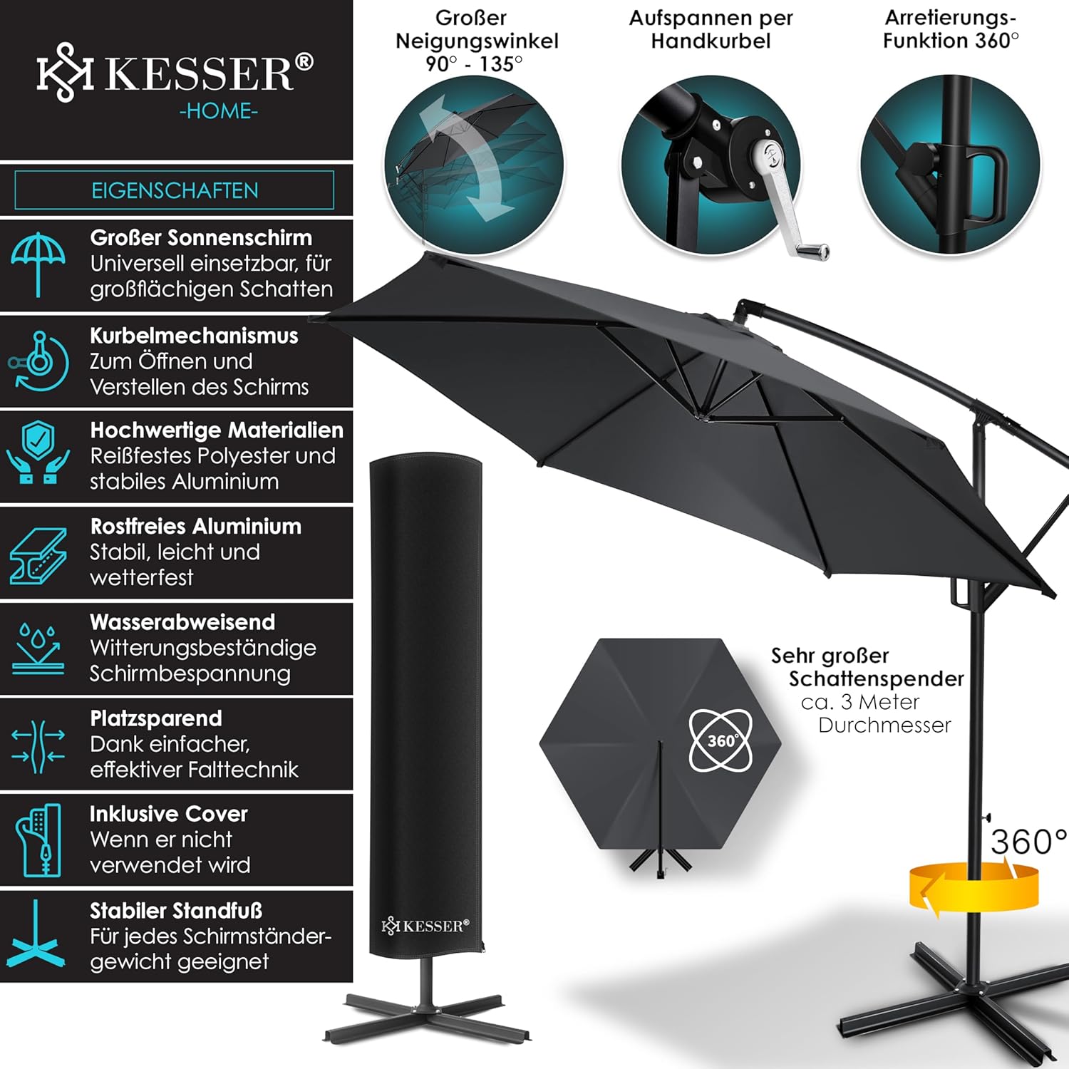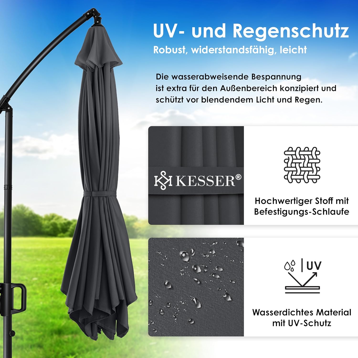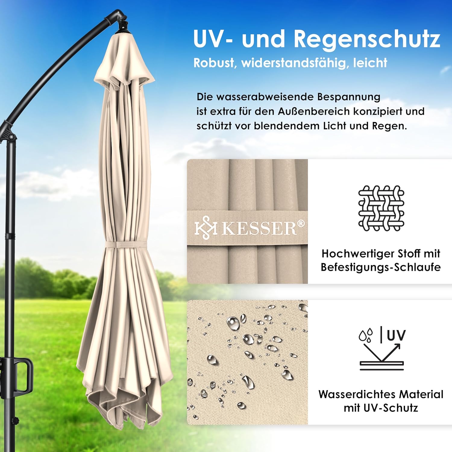 • Optimal protection: summer is within reach, a cloudless sky and the temperatures are fast up. With the KESSER parasol, you protect yourself and your guests from direct UV radiation and at the same time create a shady spot on your balcony, terrace or in the garden. Grab a cool drink, a good book and enjoy the day carefree with our great shade dispenser.