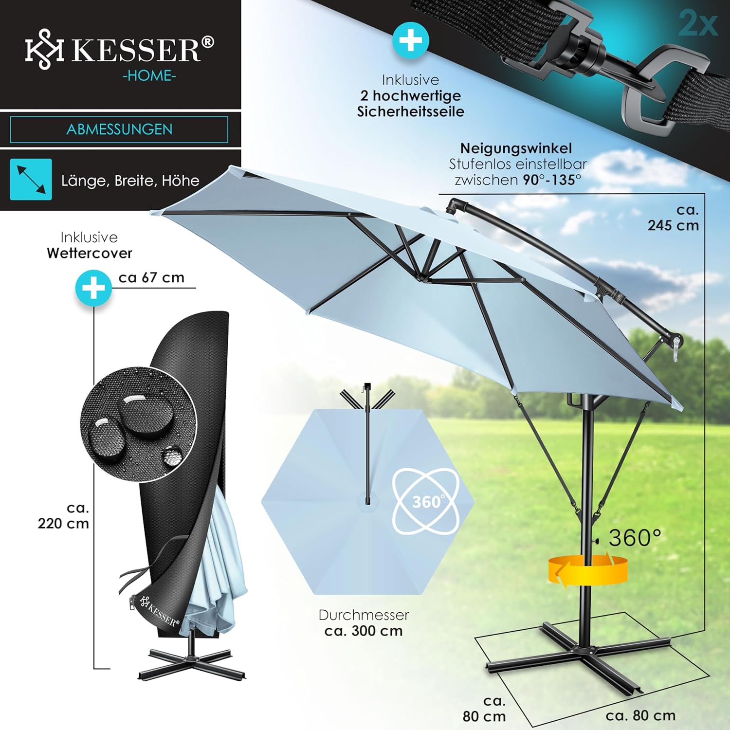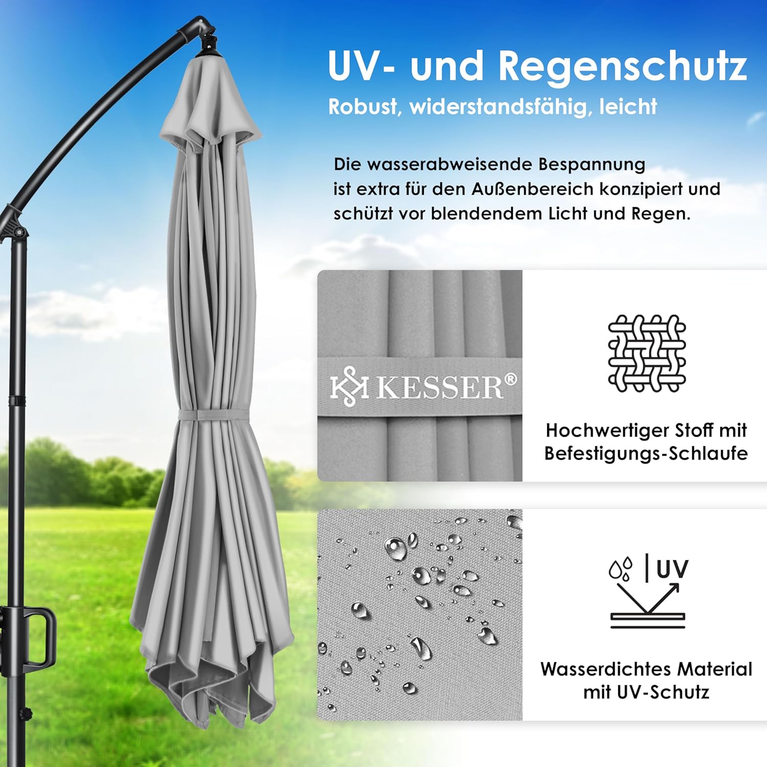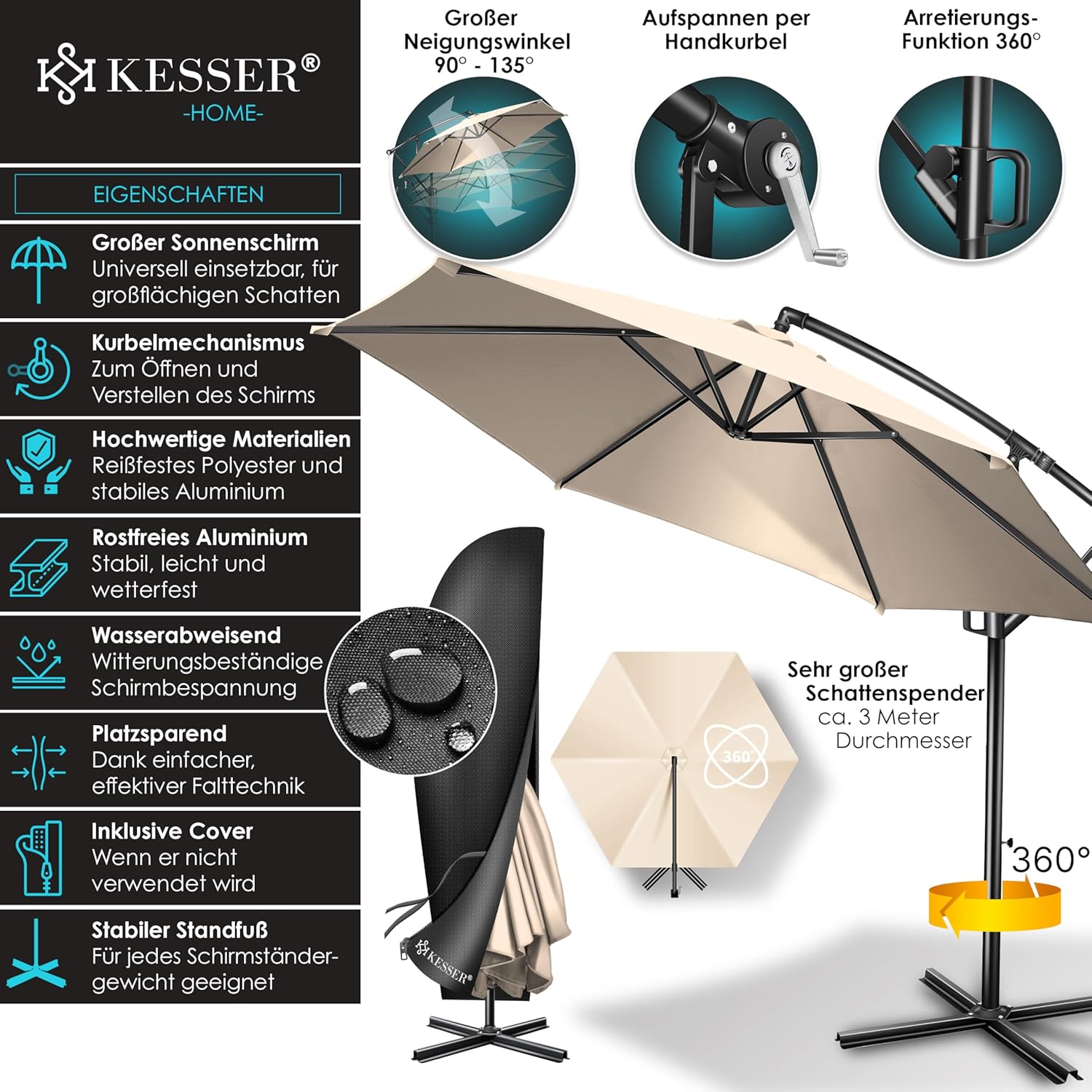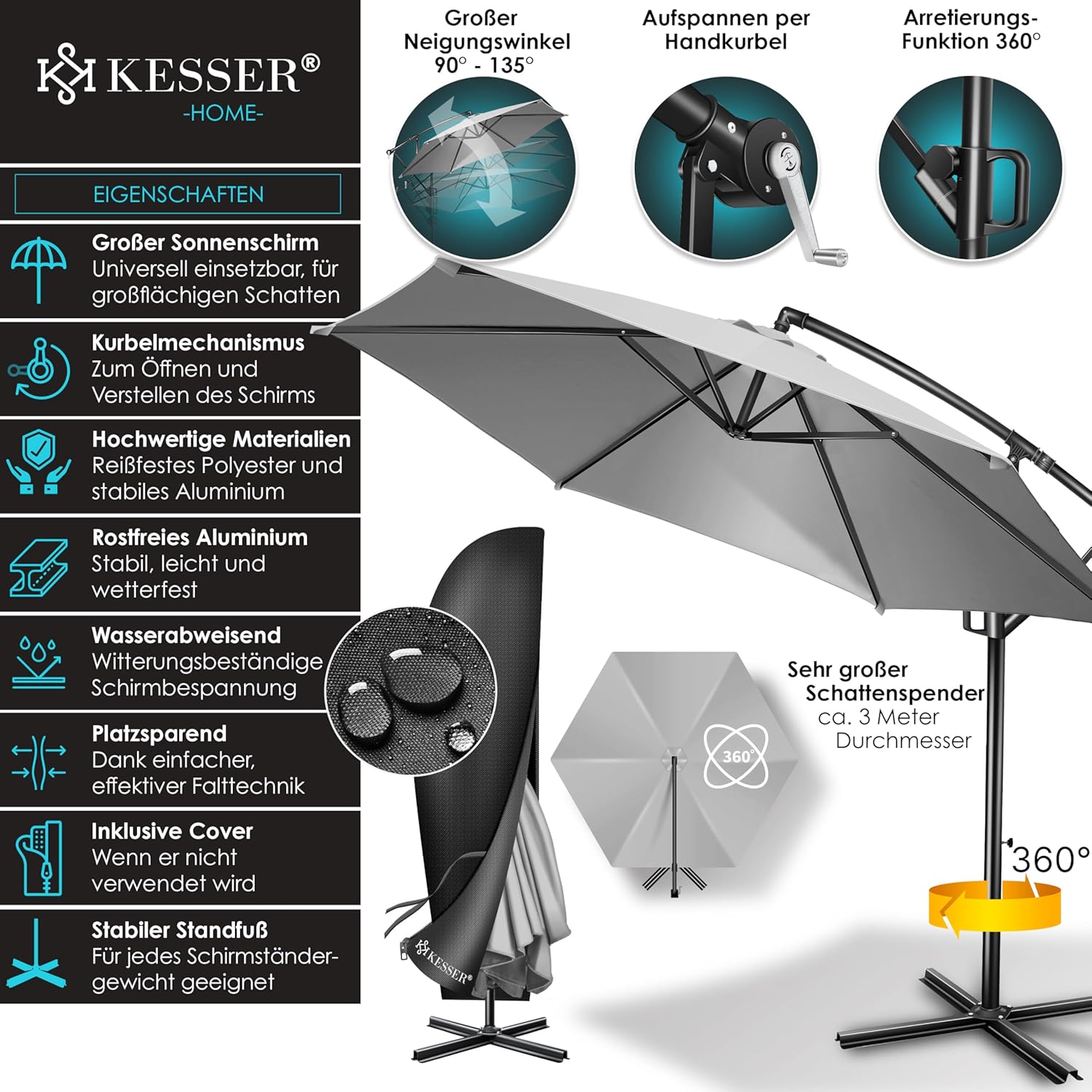 • Optimal protection: summer is within reach, a cloudless sky and the temperatures are fast up. With the KESSER parasol, you protect yourself and your guests from direct UV radiation and at the same time create a shady spot on your balcony, terrace or in the garden. Grab a cool drink, a good book and enjoy the day carefree with our great shade dispenser.