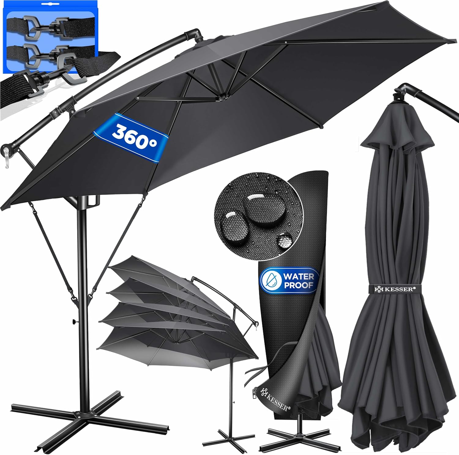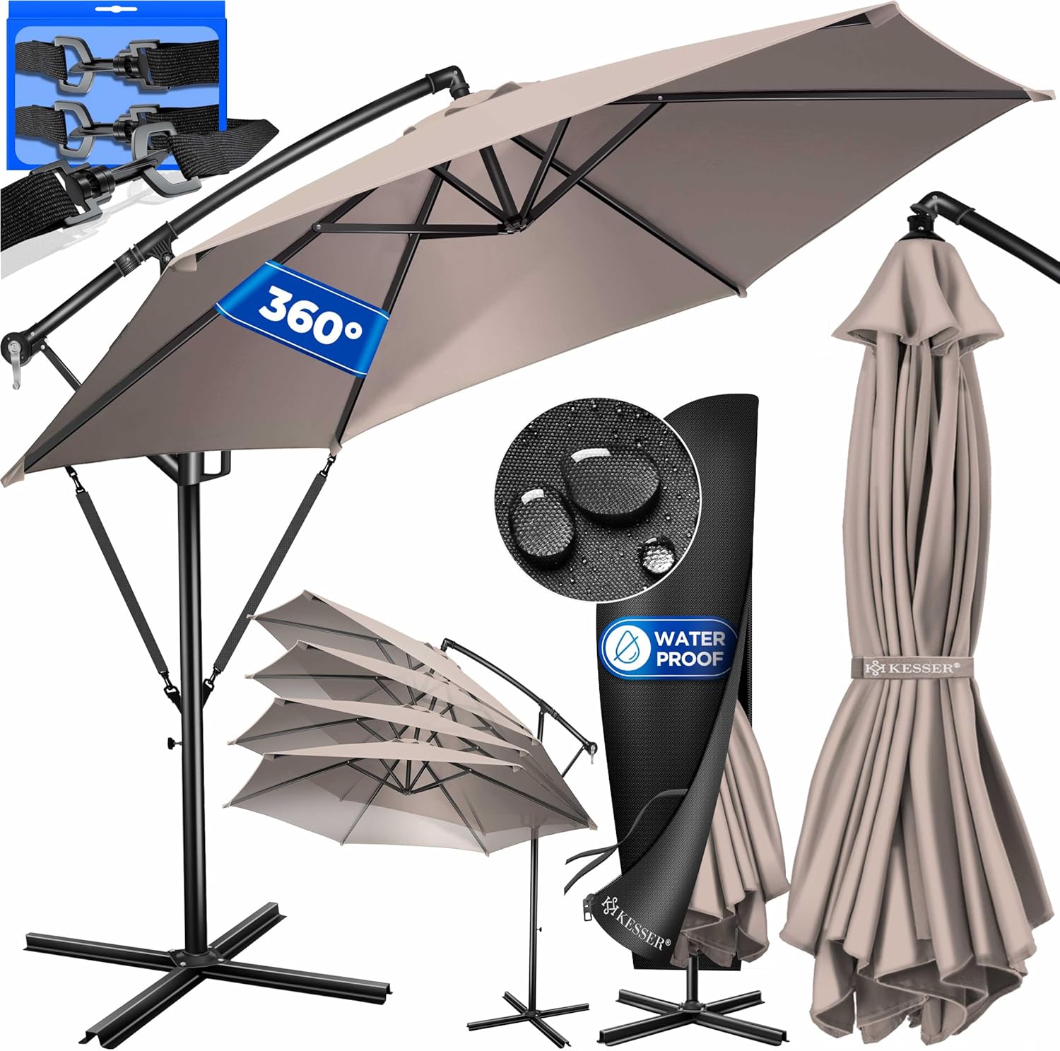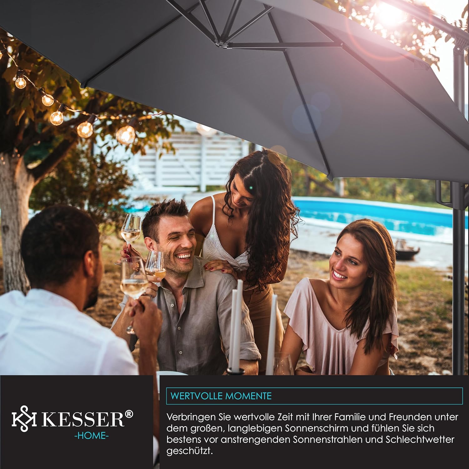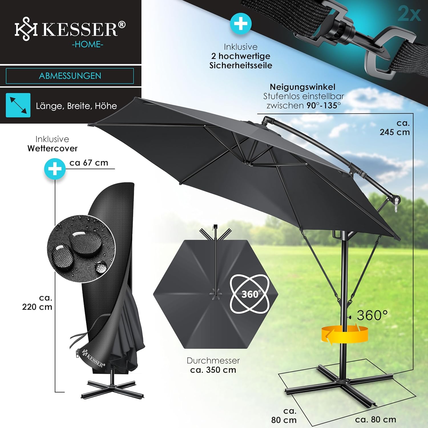 • Optimal protection: summer is within reach, a cloudless sky and the temperatures are fast up. With the KESSER parasol, you protect yourself and your guests from direct UV radiation and at the same time create a shady spot on your balcony, terrace or in the garden. Grab a cool drink, a good book and enjoy the day carefree with our great shade dispenser.