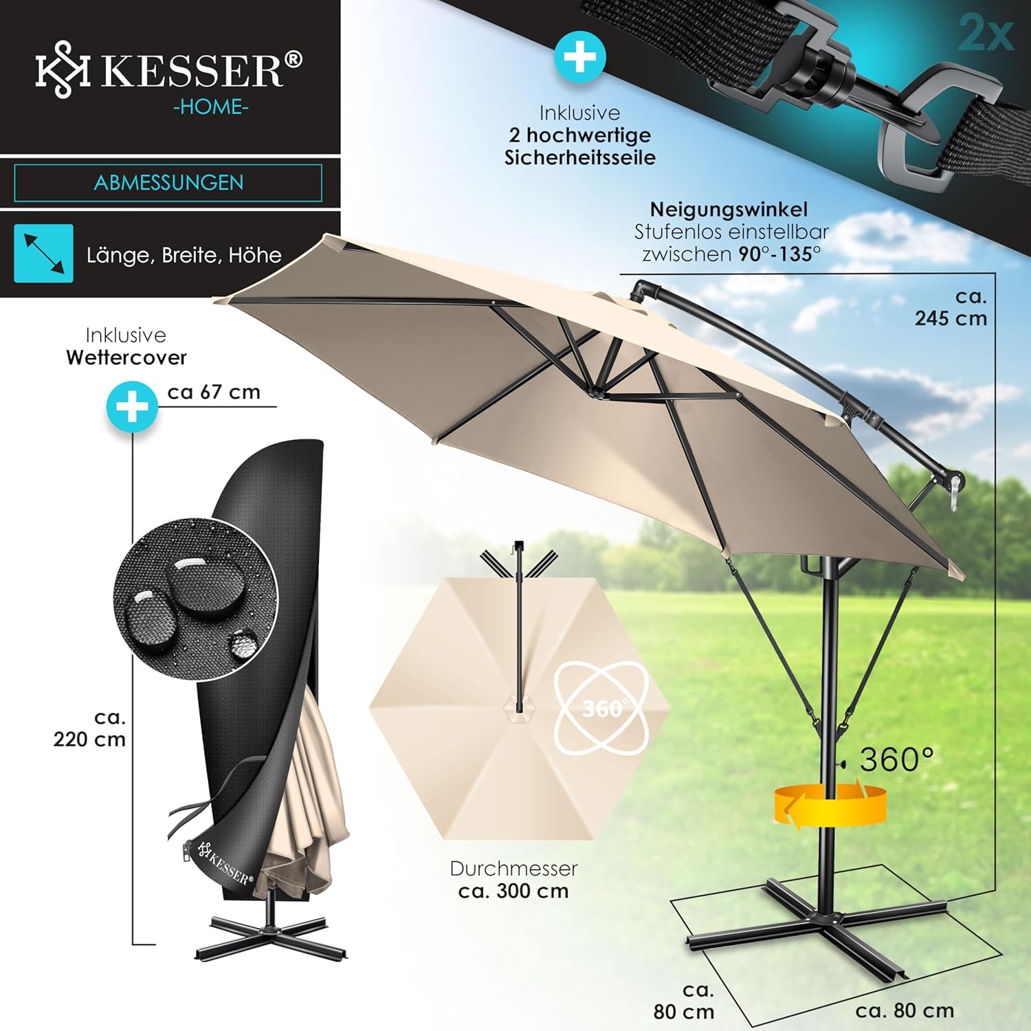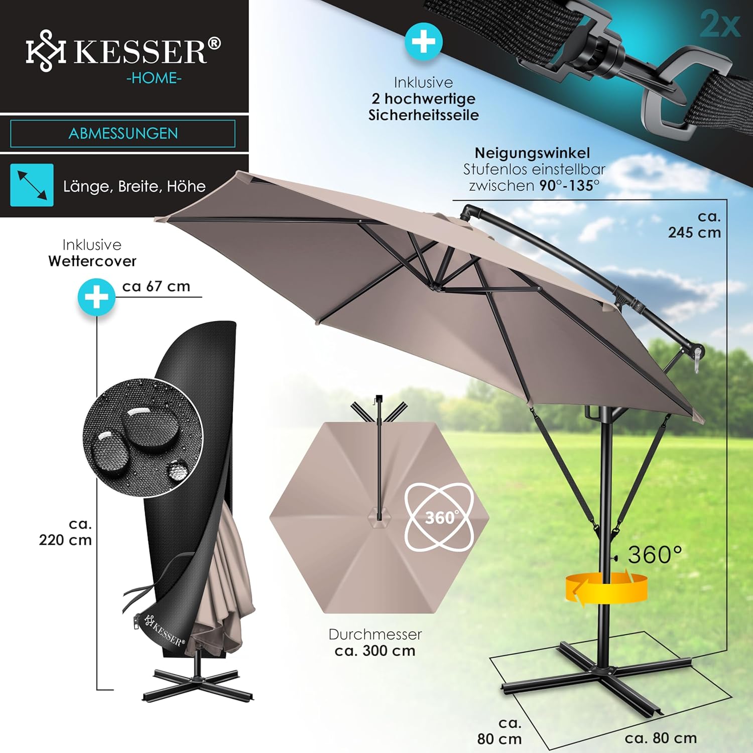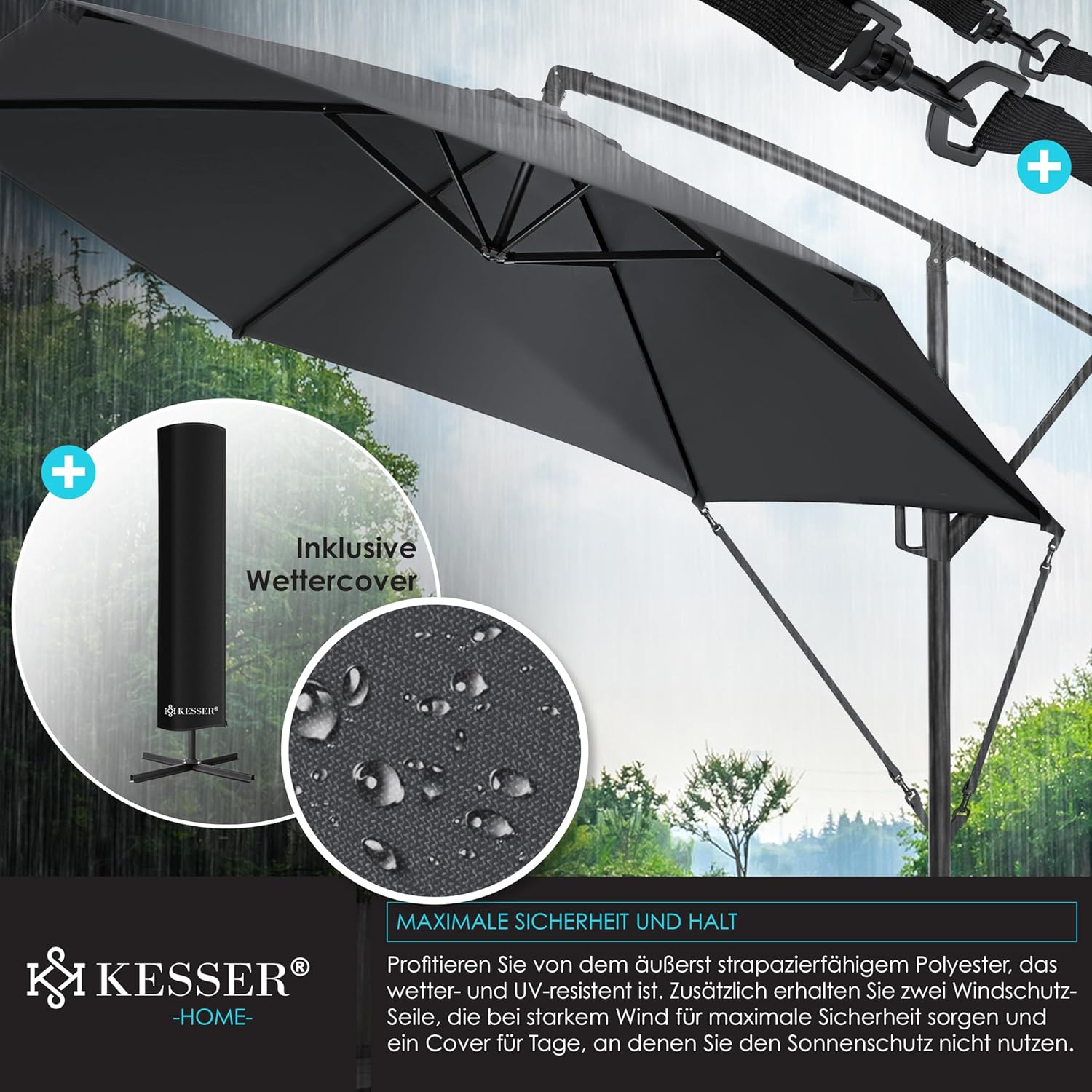 • Robust and safe: a robust mast made of lightweight and rust-proof aluminium with 48 mm diameter ensures a stable hold and also 6 struts and 2 safety ropes give extra stability. In addition, the parasol can be weighted at the base with the matching KESSER parasol stand to withstand wind and weather. The umbrella canopy is made from 100% polyester and is water-repellent, so you can use the umbrella even in the rain.