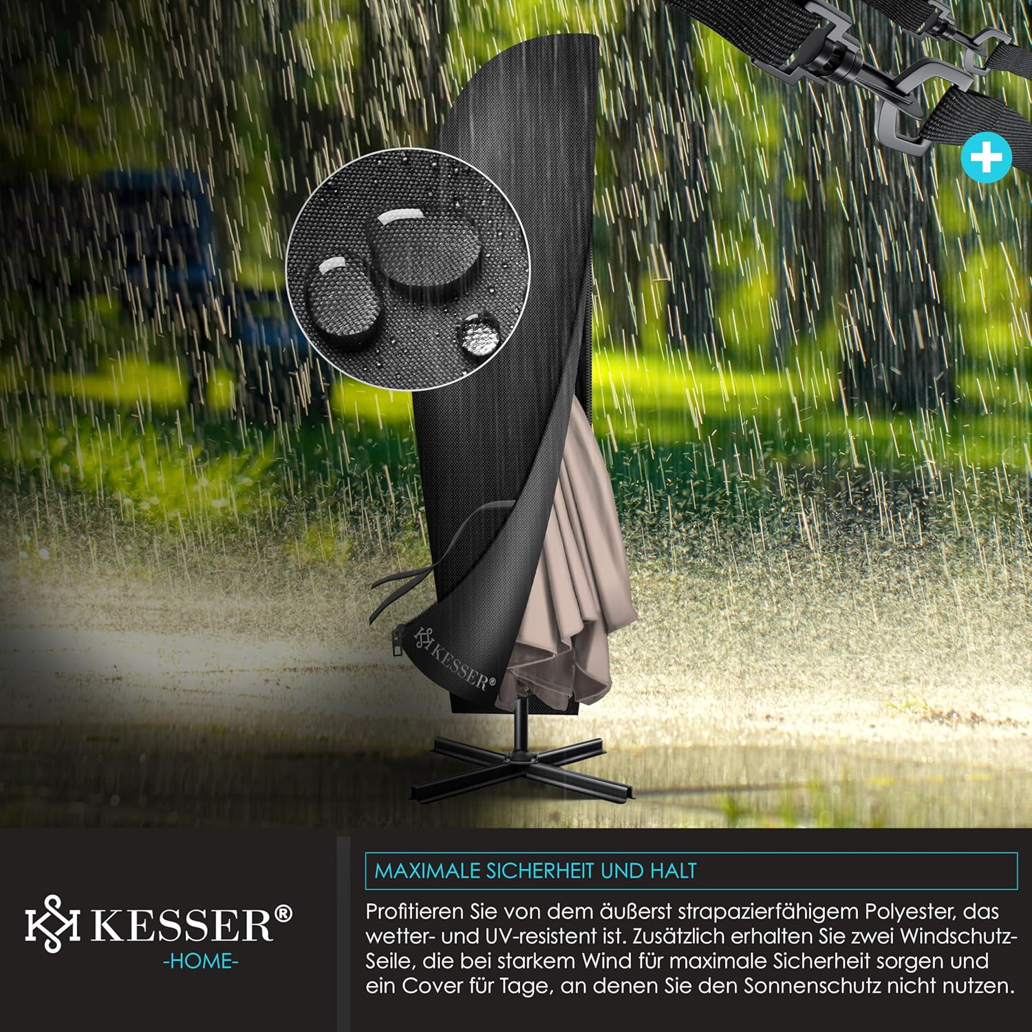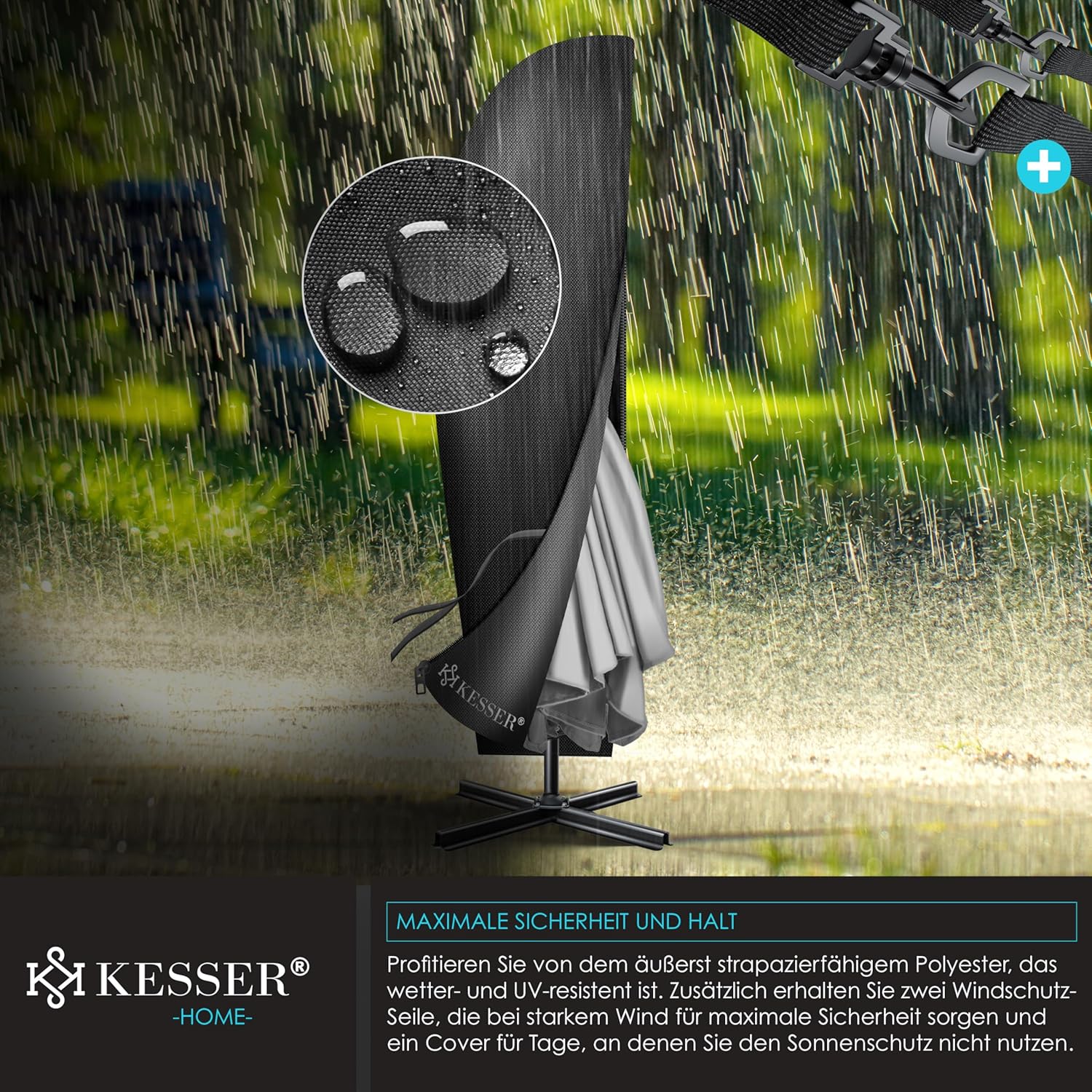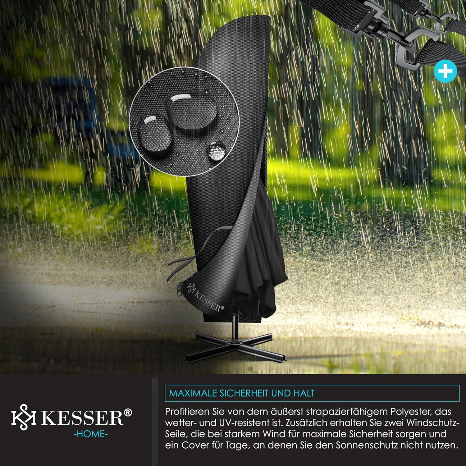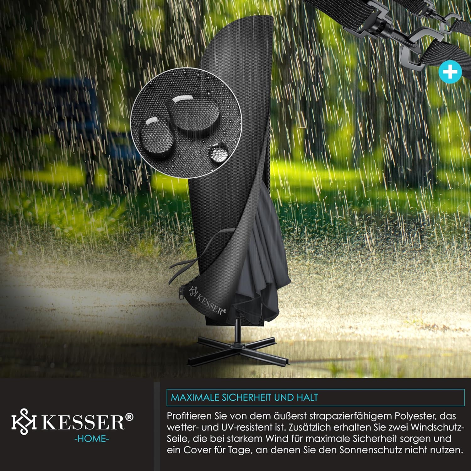 • Robust and safe: a robust mast made of lightweight and rust-proof aluminium with 48 mm diameter ensures a stable hold and also 6 struts and 2 safety ropes give extra stability. In addition, the parasol can be weighted at the base with the matching KESSER parasol stand to withstand wind and weather. The umbrella canopy is made from 100% polyester and is water-repellent, so you can use the umbrella even in the rain.
