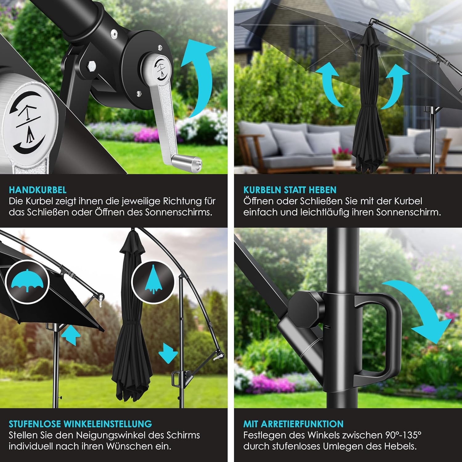 With the integrated crank system, you can easily open and close the umbrella with the smooth-running hand winch. So you can stretch your parasol in seconds and enjoy the summer – cranks instead of lifting heavy.