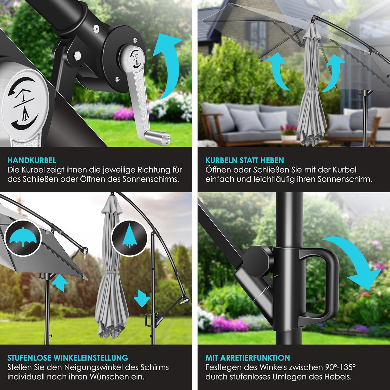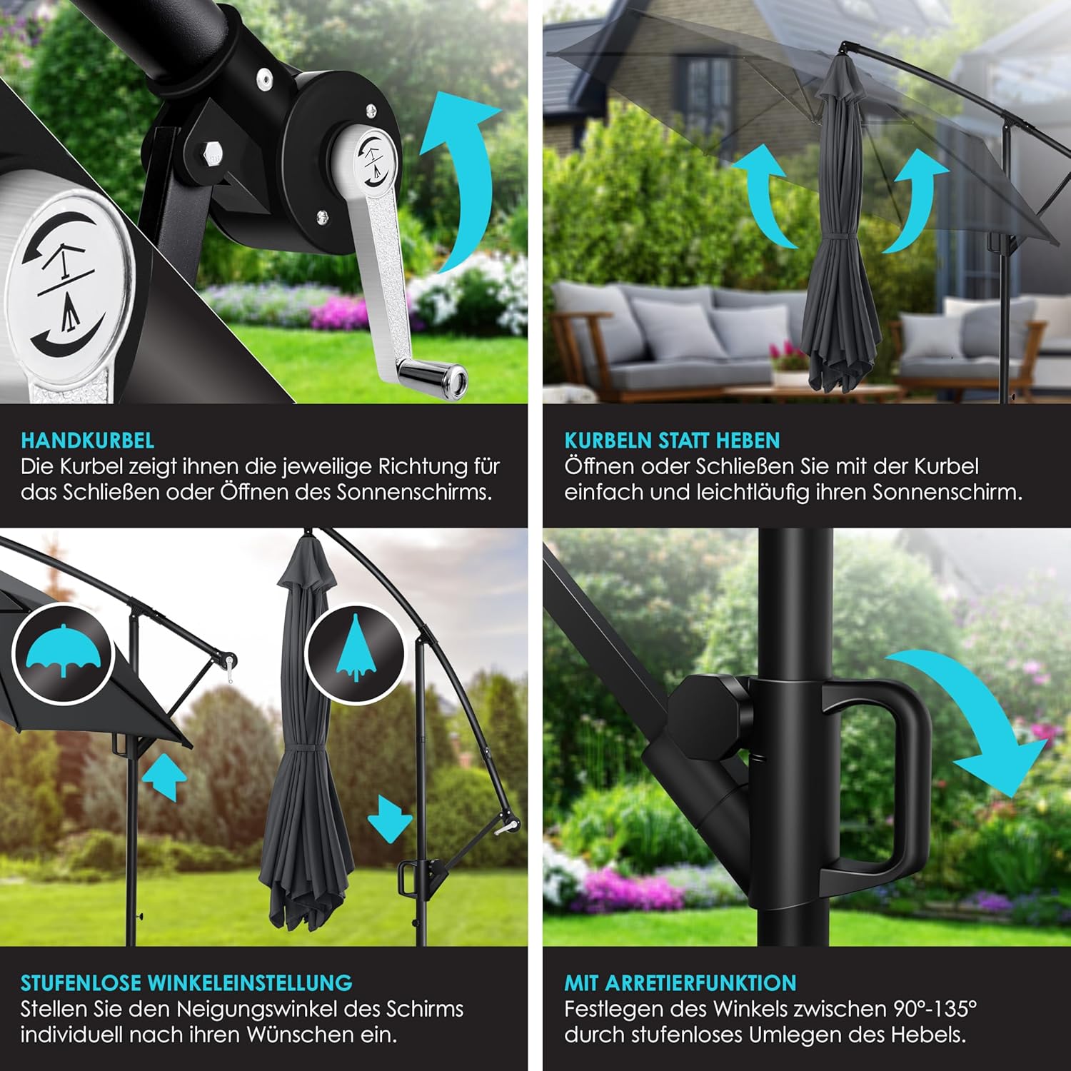 • With the integrated crank system, you can easily open and close the umbrella with the smooth-running hand winch. So you can stretch your parasol in seconds and enjoy the summer – cranking instead of lifting heavy.