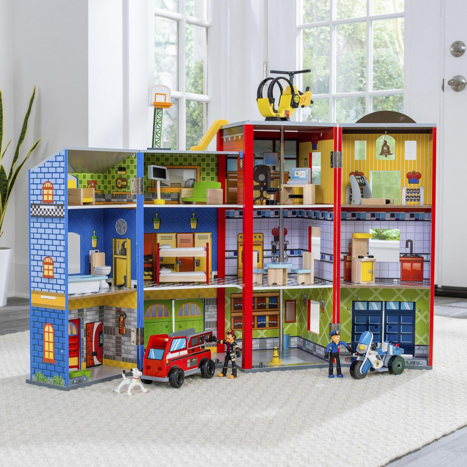 Help is on the way with the KidKraft Everyday Heroes Wooden Playset. Kids will have five-alarm fun with this three-level wooden fire house that opens up for expanded play. A total of 12 themed rooms and a roof-to-floor fire pole are guaranteed to boost children’s imaginations as they explore what it means to be a real-life hero. The included 35-piece accessory kit features a police motorcycle, fire truck, fire dog and more. Land the helicopter on the helipad on the rooftop. A firefighter and police officer have bendable arms and legs, so they more easily fit on the vehicles and add action to the play. When playtime is done, the set folds closed on sturdy hinges to make cleanup easy.