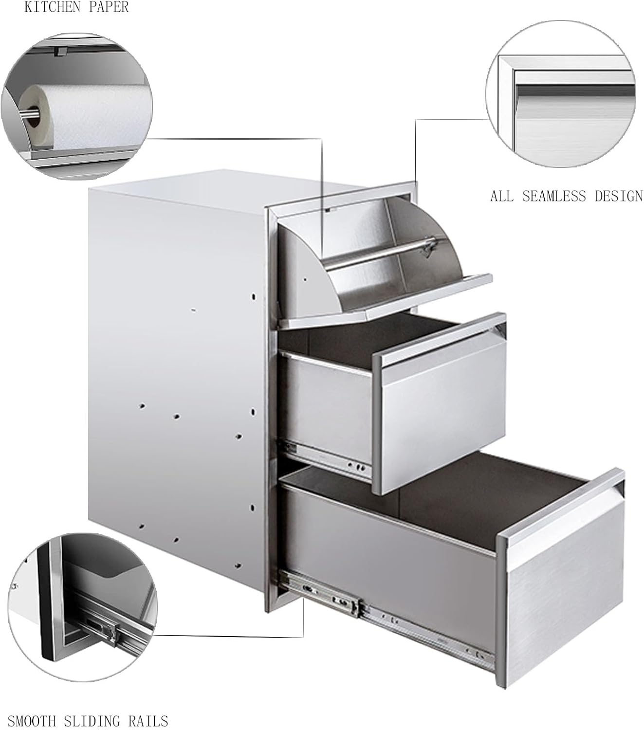- Tilt-Out Paper Towel Holder will receive Full-Sized Roll and Two large drawers fits any amount of BBQ Tools or Spices/Sauces for all your Grilling needs
