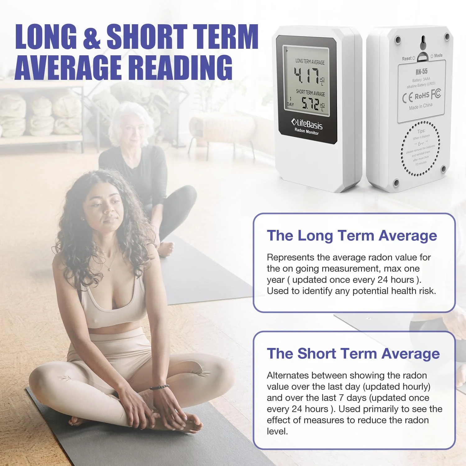 ??Importance of Radon Measurement??Radon is the second cause of lung cancer, accurate detection of your surroundings environment daily is essential so that you can make small adjustments to improve the quality of your air. Life Basis radon detector is help you easily monitor your air quality, protect you and family health. ??Long & Short Term Average Reading??The long term average represents the average radon value for the on going measurement, max one year;The short term average alternates between showing the average radon value for last-day or the last-7-day. The longer the test time, the more accurate the data. The tests should be conducted for at least 7 days, 60 days for more accurate measurements. ??No Lab Fees & Time??No need to spend a lot of money and make appointments for lab personnel to come to your home to take measurements. Simply turn on the radon meter and you can easily monitor your radon level continuously in real time without spending extra your time and money. ??Battery Powered??The radon tester is battery-operated (3 AAA batteries (including) and with low consumption, no need to worry about charging at all. Note: For the first use, pls remove the transparent plastic spacer to power on the machine??When the battery power is too low, a low battery prompt will appear on the screen??All datas will be deleted after restarting the detector. ??Large Screen??Large screen digital radon detector for home easy reading the radon monitoring dates for a quick overview the radon levels of your surrounding environment. If you are in an environment with high levels of radon gas, please take action immediately, such as increasing the ventilation. ??Guarantee??Life Basis provide 60 days no reason to refund and 12 months product replacement support, please rest assured to buy. Please let us know if you encounter any questions or confusions during use. ( Please Note: The measurement data will be displayed after 24 hours of operation.)