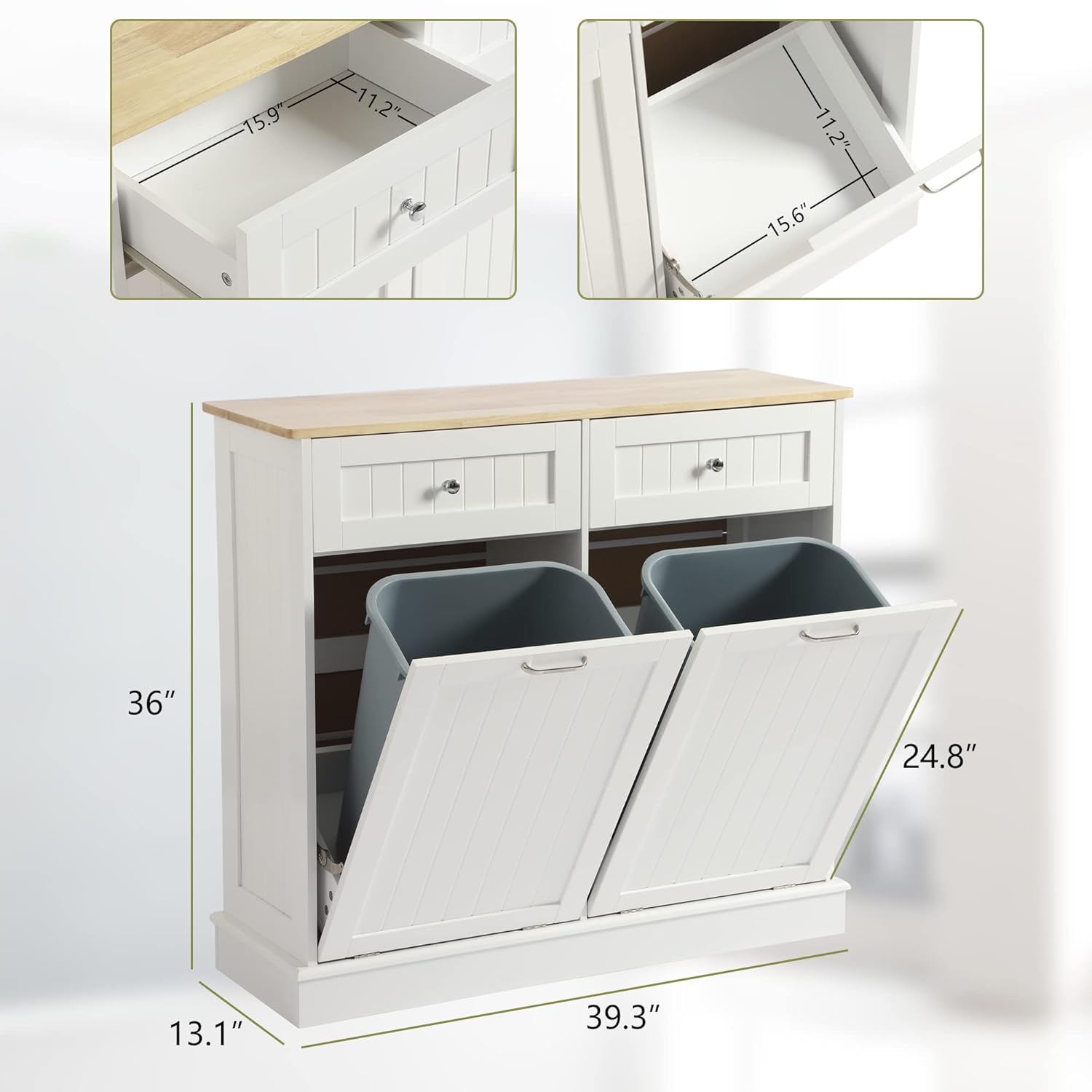- Dimension and Details??Overall dimensions of the trash bin cabinet: 39.3″L x 13.1″W x 36″H, trash can is not included, we suggest 10 gallon trash can for this tilt out trash bin