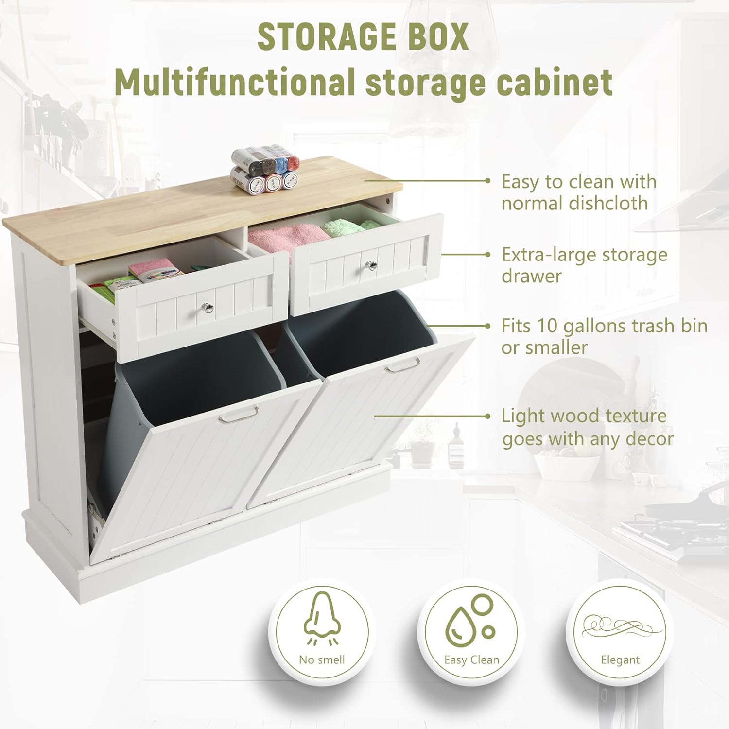- Decoration and Multifunction: This trash can holder with extra-large drawer is fit for kitchen, but also can be used in your bathroom, laundry, living room, corridor and so on, simple color and design make it can match well with furniture in your house