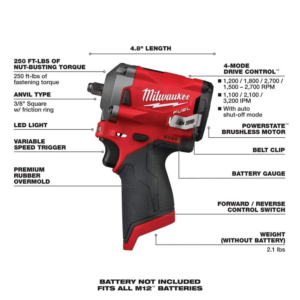 The M12 FUEL Cordless Brushless 3/8 in. Stubby Impact Wrench is the industries most compact impact wrench on the market place. Measuring only 4.8 in. in length??? this tool fits in tighter spaces??? making users more productive. Increased torque delivers an industry leading 250 ft.-lbs. of breakaway torque??? removing even the most stubborn bolts and fasteners. 4-Mode Drive Control??? will allow unmatched control in various fastening applications. 1-3 RPM allows for precision control??? and Auto-Shut Off Mode in the 4th setting will prevent over fastening of bolts while doing reassembly work.