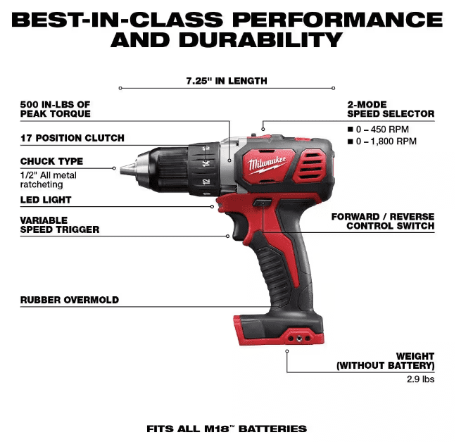 M18 cordless drill/driver with Milwaukee 4-pole frameless motor delivers 525 in. lbs. of peak torque, 0-550/0-1,700 RPM and 29,000 BPM