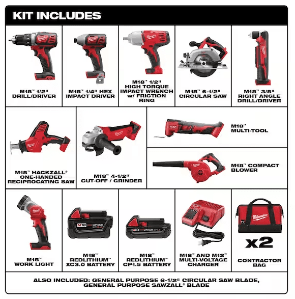 Includes: (1) 2606-20 M18 brushed drill/driver; (1) 2656-20 M18 1/4 in. impact driver; (1) 2625-20 M18 Hackzall; (1) M18 circular saw; (1) M18 4-1/2 in. cut-off/grinder; (1) 2615-20 M18 RAD; (1) 2626-20 M18 multi-tool; (1) 2663-20 1/2 in. square drive impact wrench; (1) 2735-30 M18 LED work light; (1) 0884-20 M18 compact blower; (1) 48-11-1828 M18 XC Redlithium battery pack; (1) 48-11-1815 M18 compact Redlithium battery pack; (1) 48-59-1812 M12-M18 multi-voltage charger