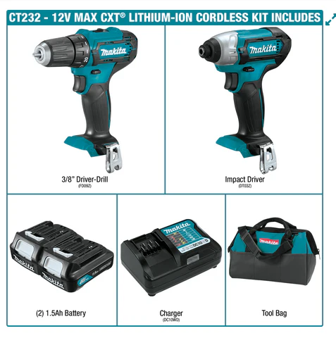 • The 12V max CXT? Lithium-Ion Cordless 2 Pc. Combo Kit includes a 3/8?? Driver-Drill (FD09Z), ??? Impact Driver (DT03Z), two 12V max CXT Lithium-Ion 1.5Ah batteries, and a Contractor Tool Bag. The 3/8″ Driver-Drill delivers power and speed in an ultra-compact size for efficient drilling, driving, and fastening. It has two speeds (0-450 & 0-1,700 RPM) and delivers up to 250 in. lbs. of Max Torque.