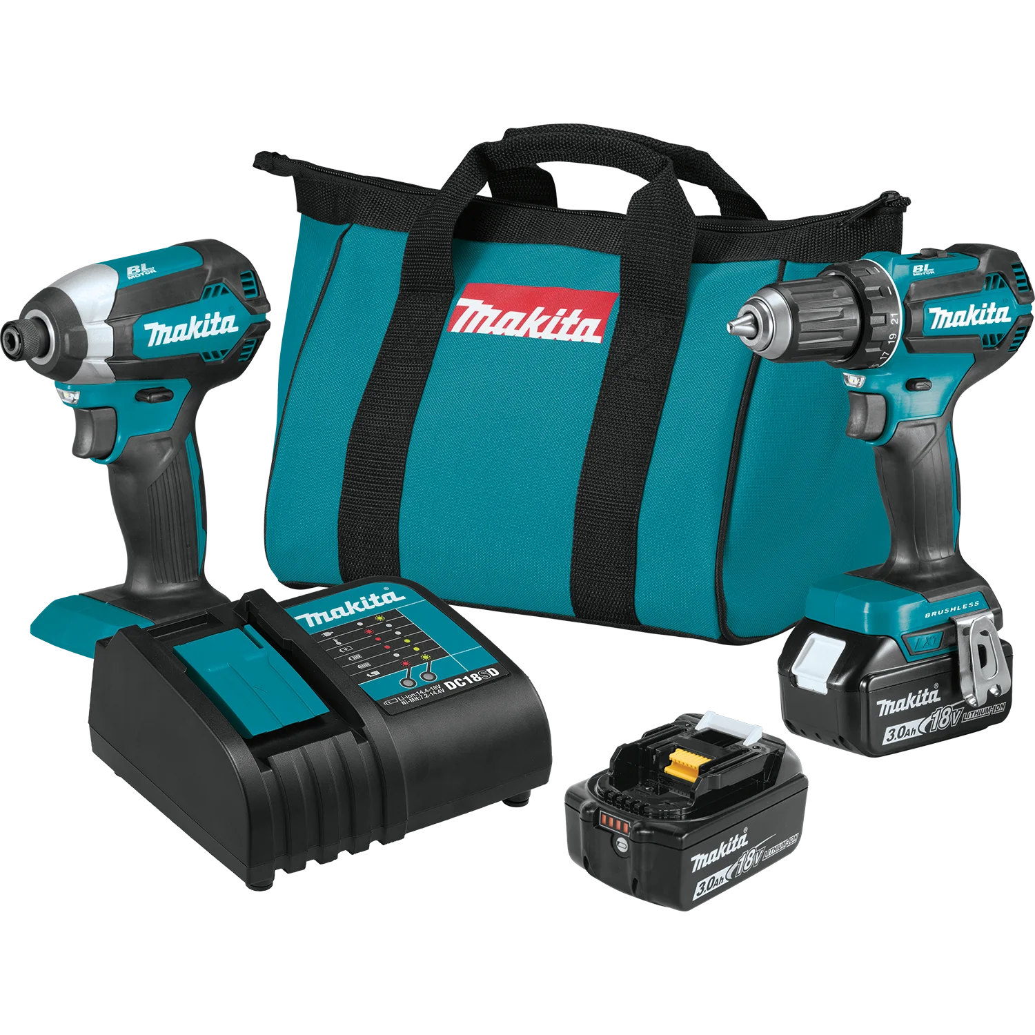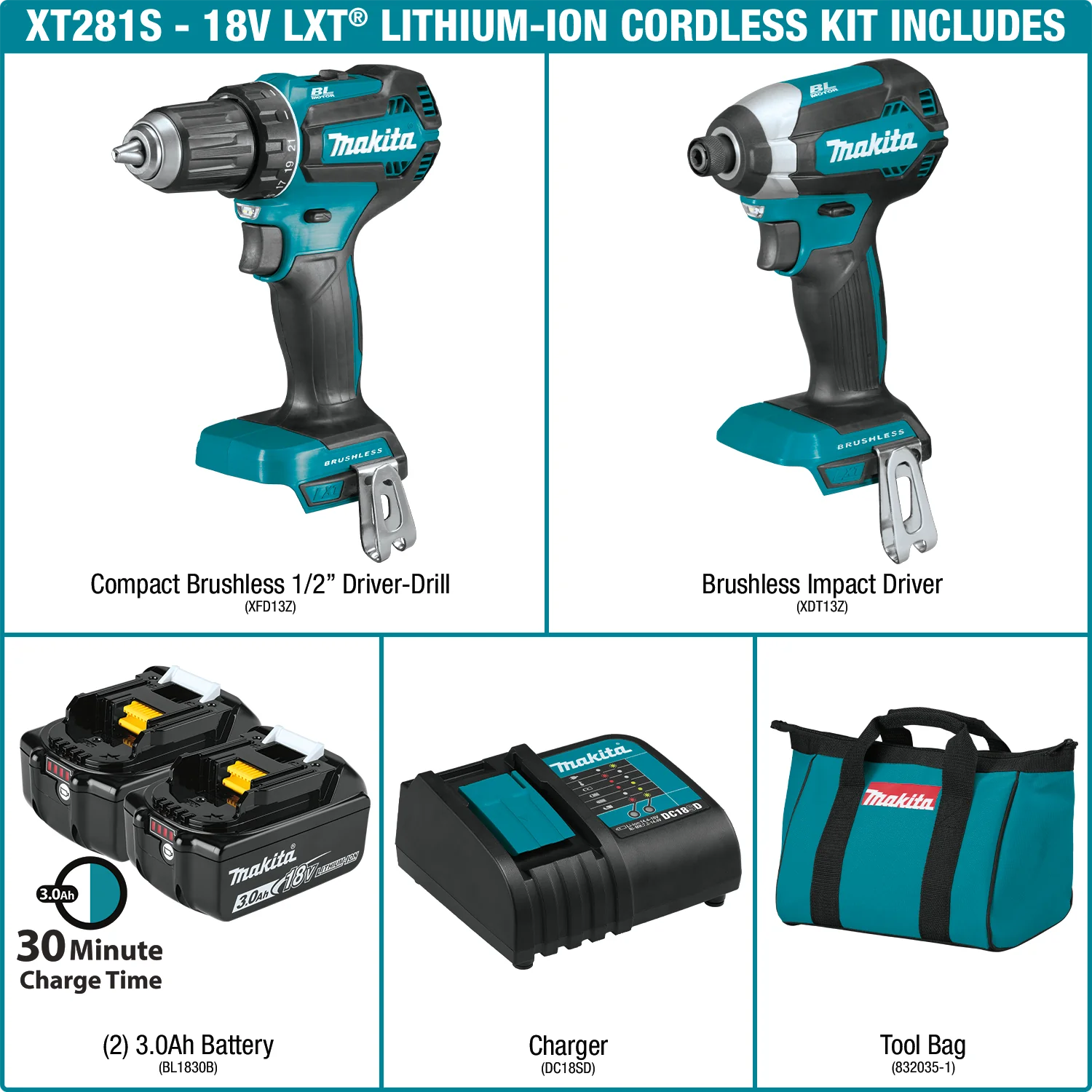 The Makita 18V LXT? Lithium-Ion Brushless 2-Piece Combo Kit (model XT281S) gives you two efficient brushless tools for drilling, driving, and fastening. The Kit includes the category’s fastest-charging 3.0Ah batteries and the breadth-of-line of the Makita 18V LXT? system, so your batteries will power the expanding range of Makita tools and accessories.