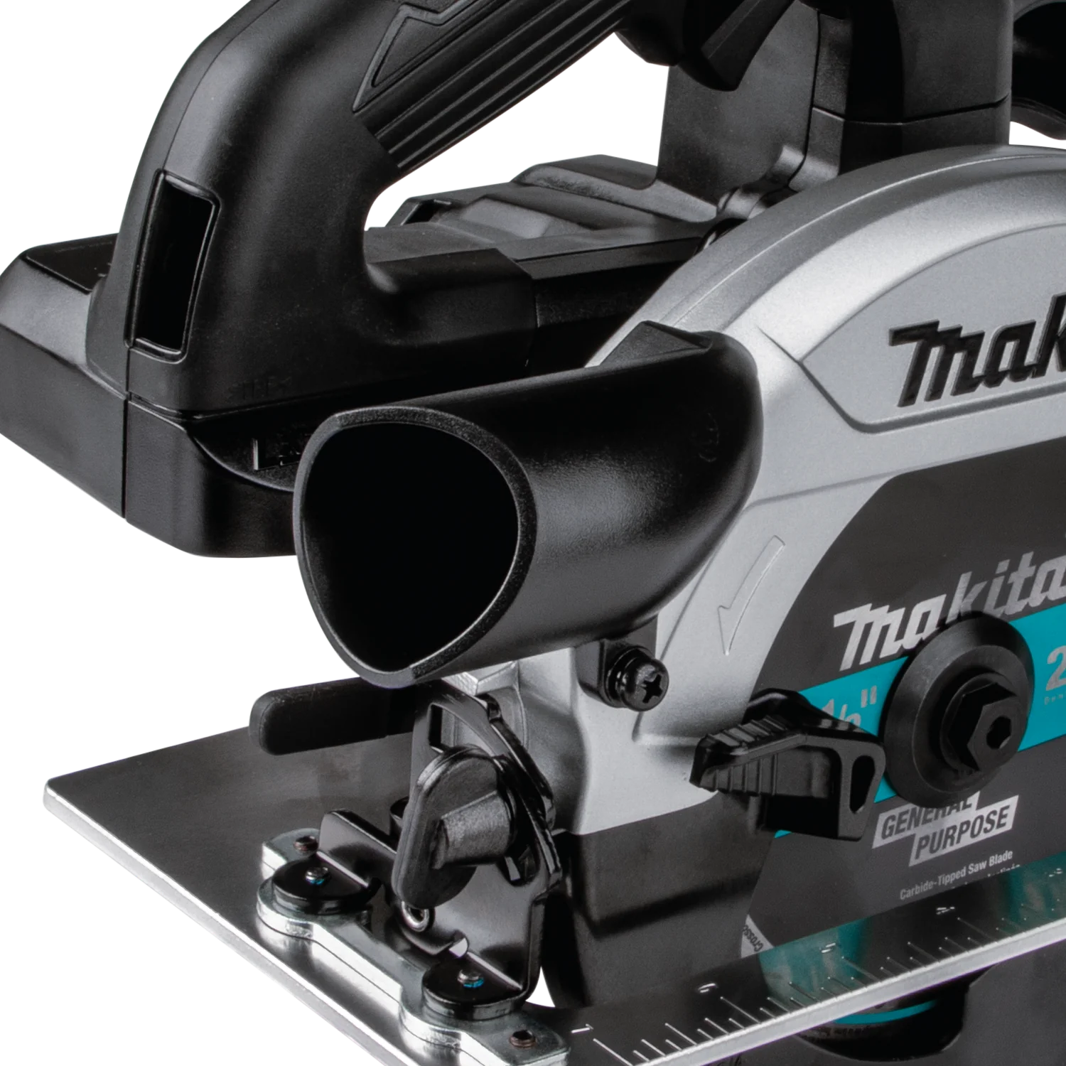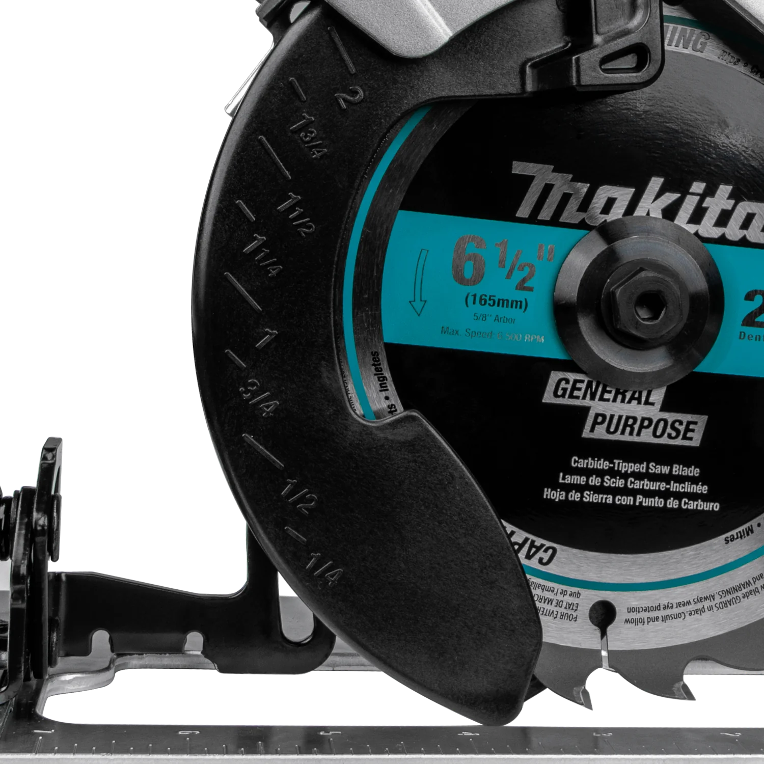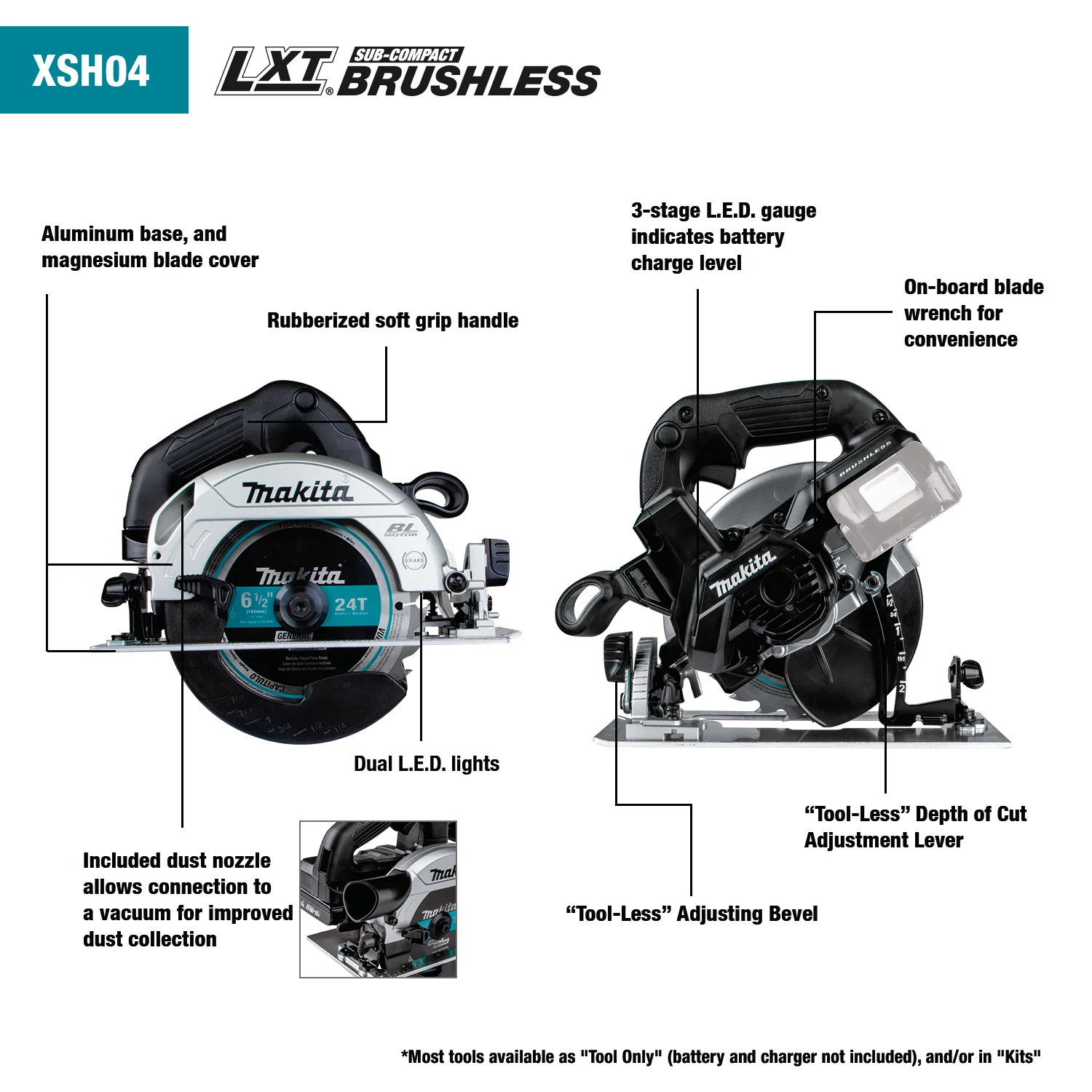 The Sub-Compact 6-1/2?? Circular Saw has a compact and ergonomic design at only 10-5/8?? and 6.4 lbs. (with 18V LXT? Compact 2.0Ah battery, battery and charger sold separately). The compact size combined with the Makita-built brushless motor delivers up to 5,000 RPM and a superior power-to-weight ratio. The saw is equipped with Makita’s Automatic Speed Change? technology, which adjusts cutting speed and torque under load for optimum cutting performance. The efficient brushless motor is electronically controlled to provide up to 50% longer run time than non-brushless motors, and in run-time testing the XSH04 made up to 174 cross-cuts per charge in 2×10 SPF lumber using one 5.0Ah battery (sold separately). For extended run time users can load up a high amp-hour 18V LXT? battery (all sold separately) including 2.0Ah (BL1820B), 3.0Ah (BL1830B), 4.0Ah (BL1840B), 5.0Ah (BL1850B) or 6.0Ah (BL1860B).