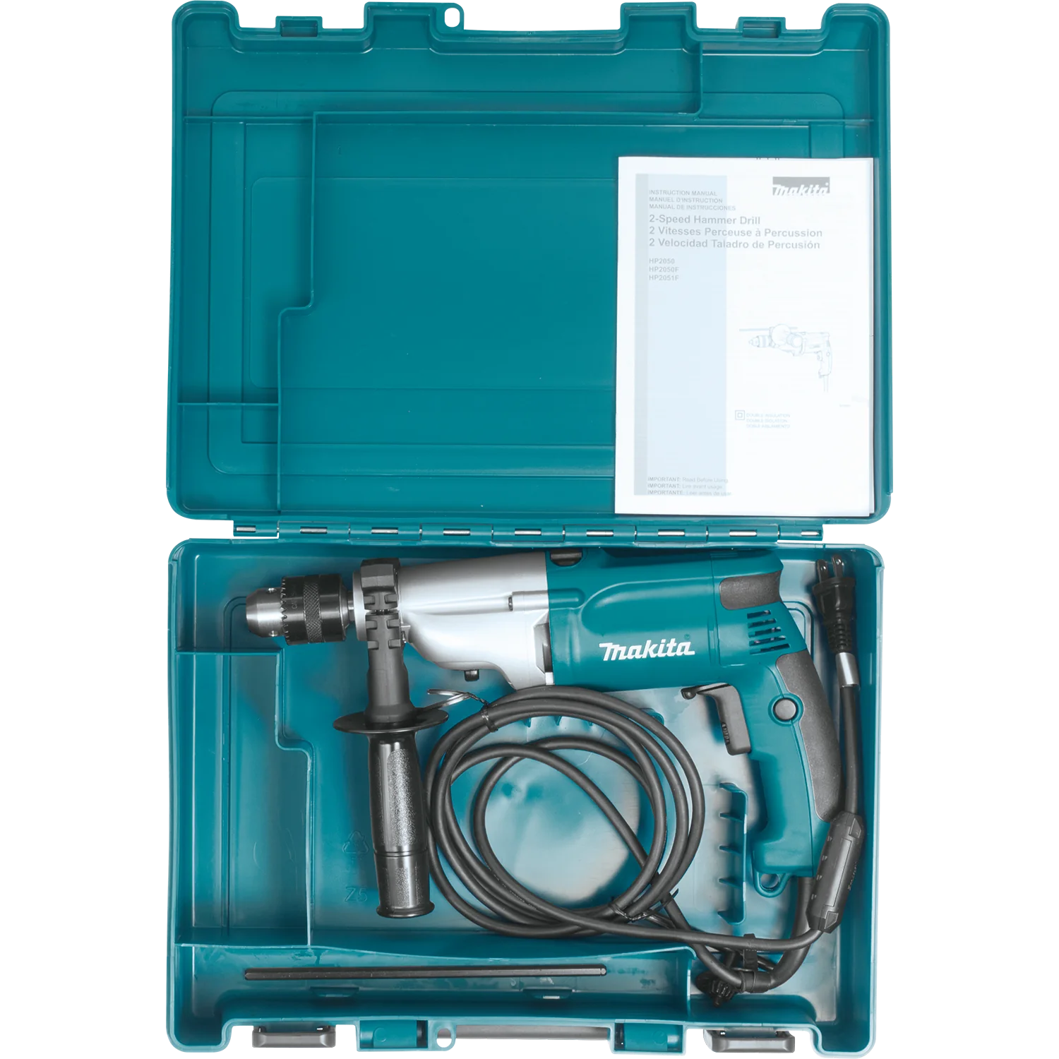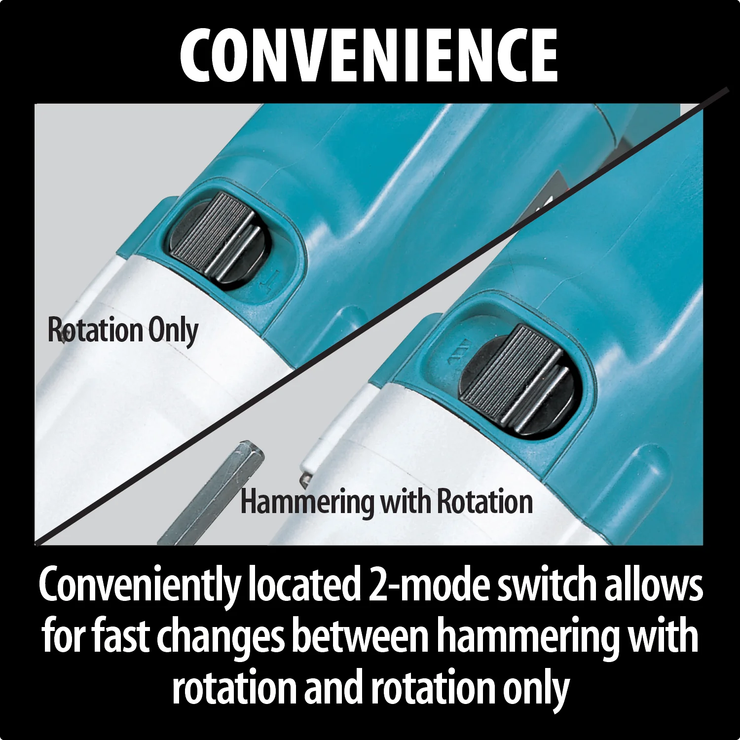• The Makita 3/4 in. Hammer Drill is powered by a 6.6 AMP motor that is engineered for the most demanding applications. The HP2050 features a torque-limiting clutch that disengages automatically if the bit binds, and a positive-stop mode selector that helps prevent accidental mode disengagement. Additional features include less weight (only 5.6 lbs.), a large trigger switch, and an ergonomic rubberized grip for increased comfort.