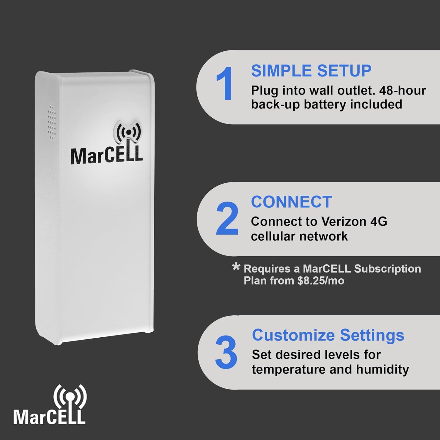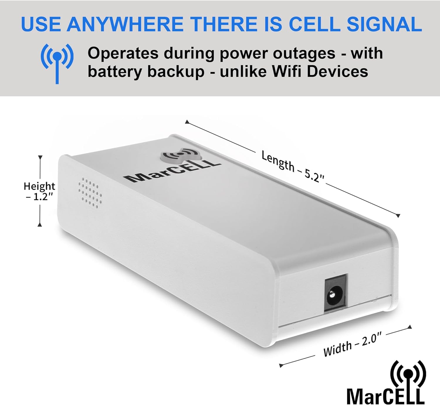 - Cellular Advantage – MarCELL can be used anywhere there is a Cellular Signal and continues to operate in power outages, unlike Wifi Devices