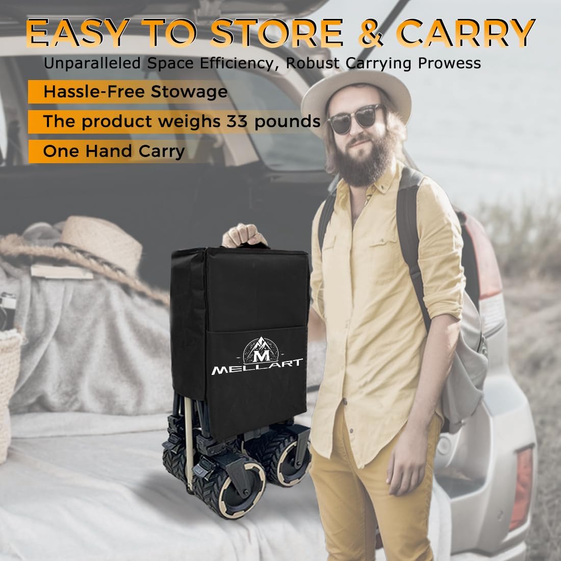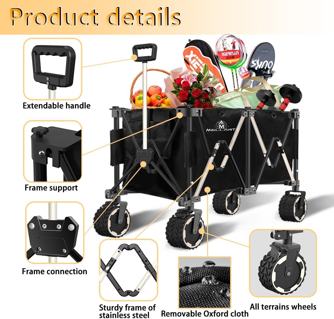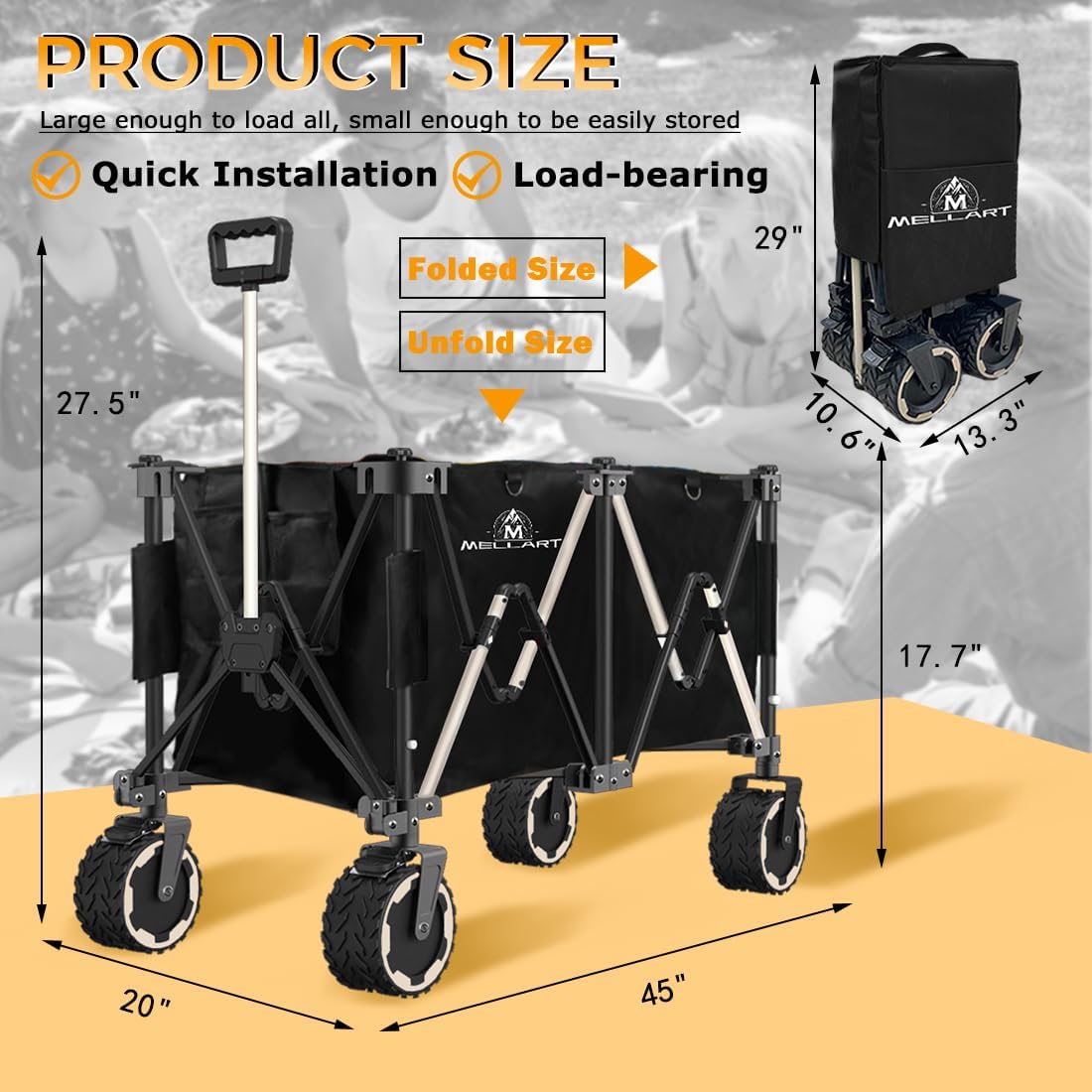 - Mellart Wagon Cart – Elevate Your Camping Experience! Upgrade your camping trips with our foldable wagon, designed for both convenience and style. Its spacious capacity of 200L allows you to carry all your camping gear effortlessly. Enjoy easy handling with the adjustable handle, perfect for users of all sizes.