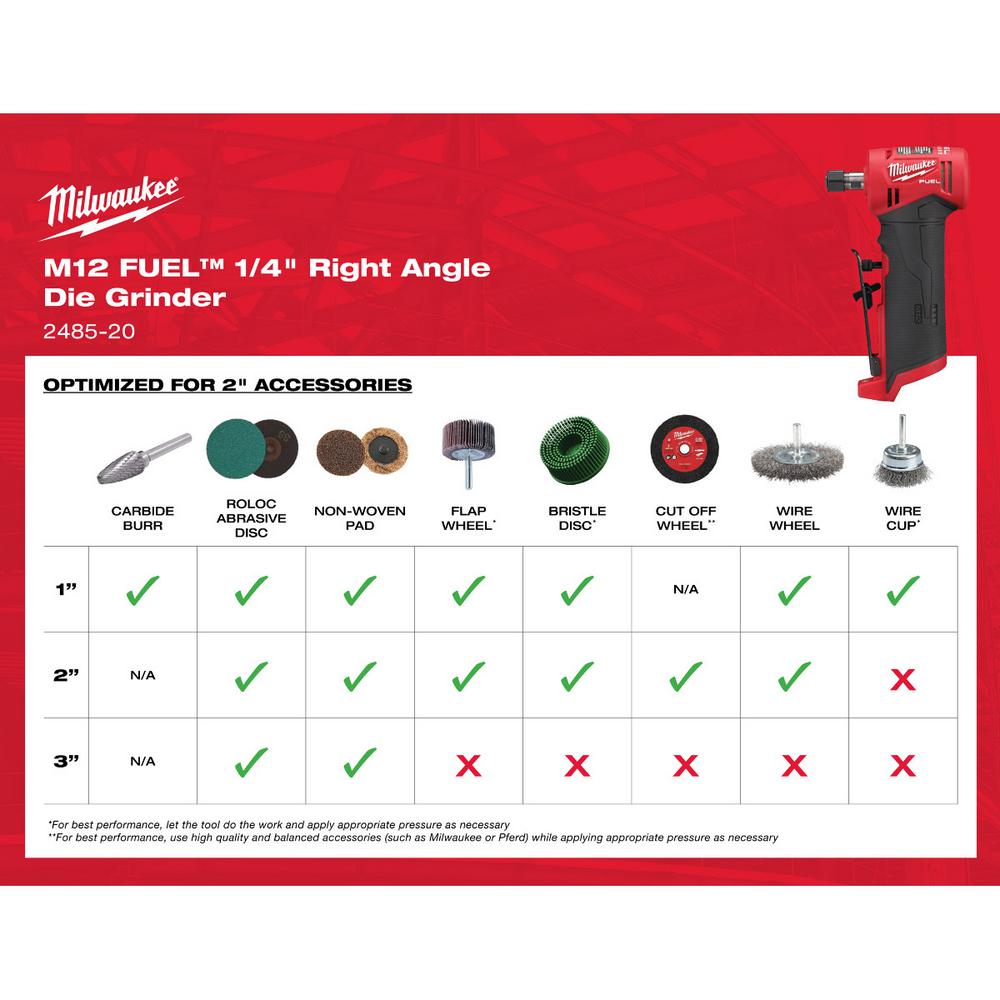 The Milwaukee 1/4 in. M12 FUEL Right & Straight Angle Die Grinder is the first cordless right angle die grinder that delivers the performance and size and speed professional service mechanics demand. The die grinder delivers 20% more power than pneumatic competition and features the Milwaukee POWERSTATE Brushless Motor Technology. The cordless die grinder provides users with up to 0.3 HP performance. best-in-class size to help fit in tight places and offers users greater mobility and access. The M12 die grinder features a 4-Mode speed control and responsive variable-speed trigger giving users unmatched control. The Milwaukee M12 FUEL 1/4 in. Straight Die Grinder is designed to replace pneumatic die grinders. The die grinder provides users with up to 0.3 HP performance to outperform pneumatic die grinders by 20%. The M12 inline die grinder features 3-Mode RPM control and a responsive variable-speed trigger providing users with unmatched control with their most common accessories. The cordless die grinder gives users greater access and mobility. eliminating the frustrations of hoses and compressors.