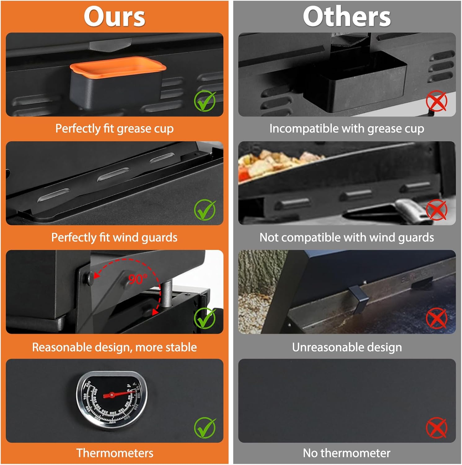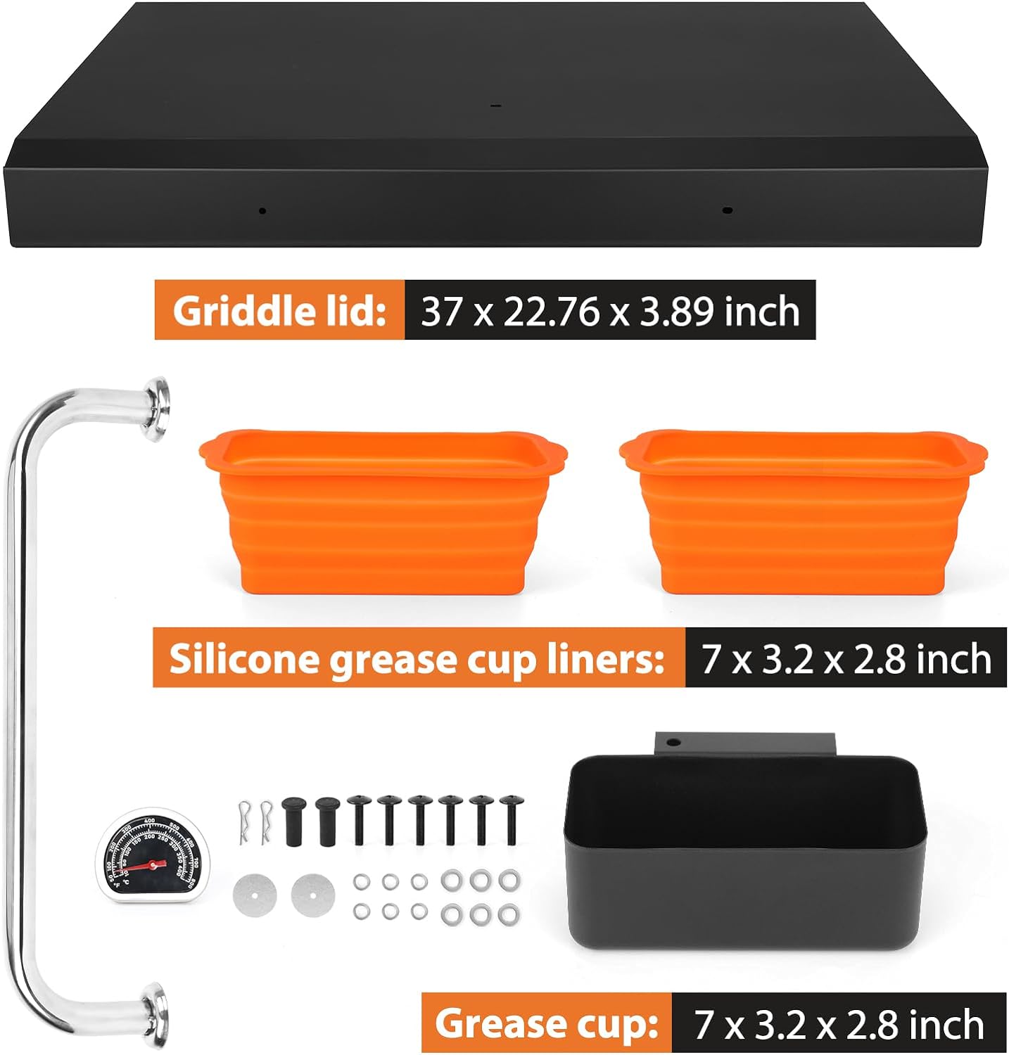 - Comes with 1 grease cup and 2 silicone grease cup liners, screws and other parts placed in the grease cup. Compatible with wind guards and griddle mats, it’s a versatile accessory for your blackstone 36 inch griddle setup