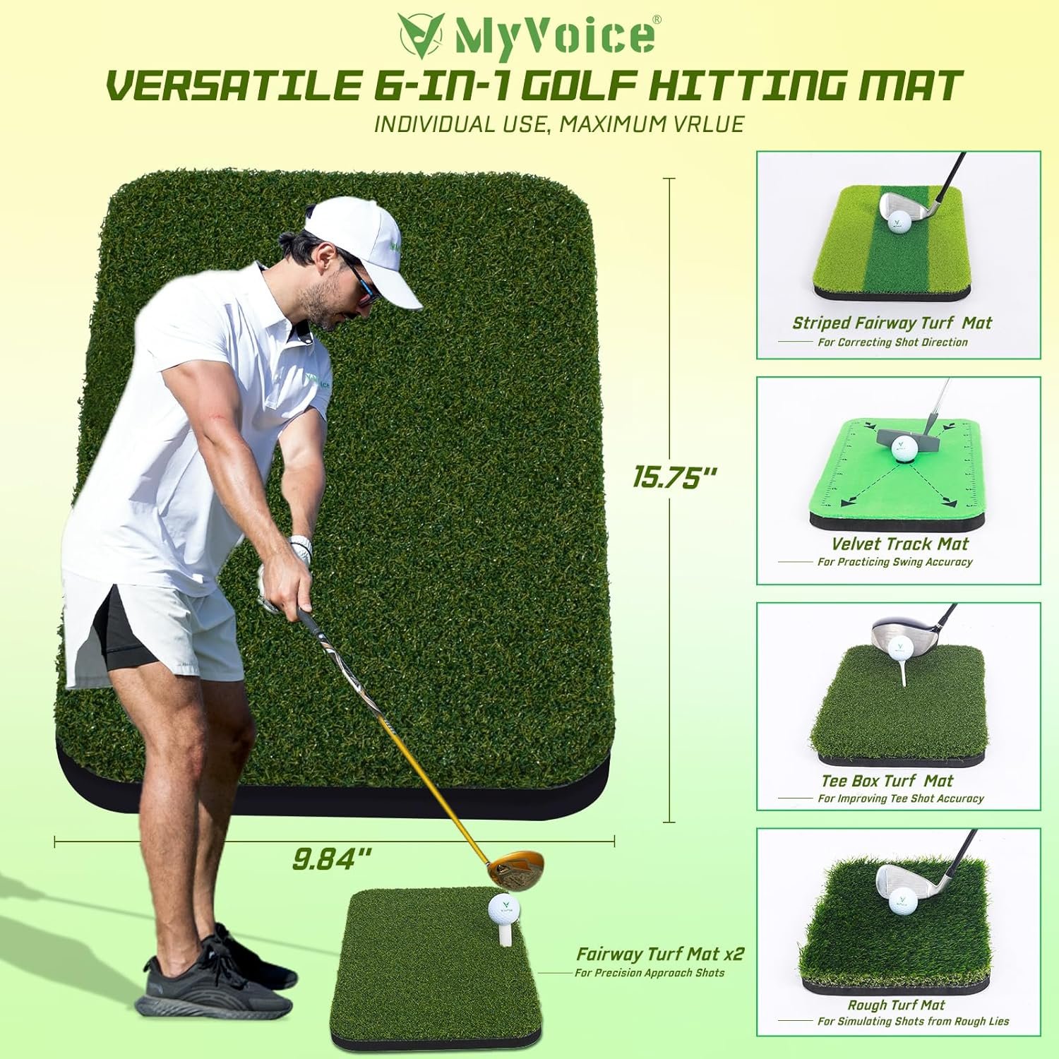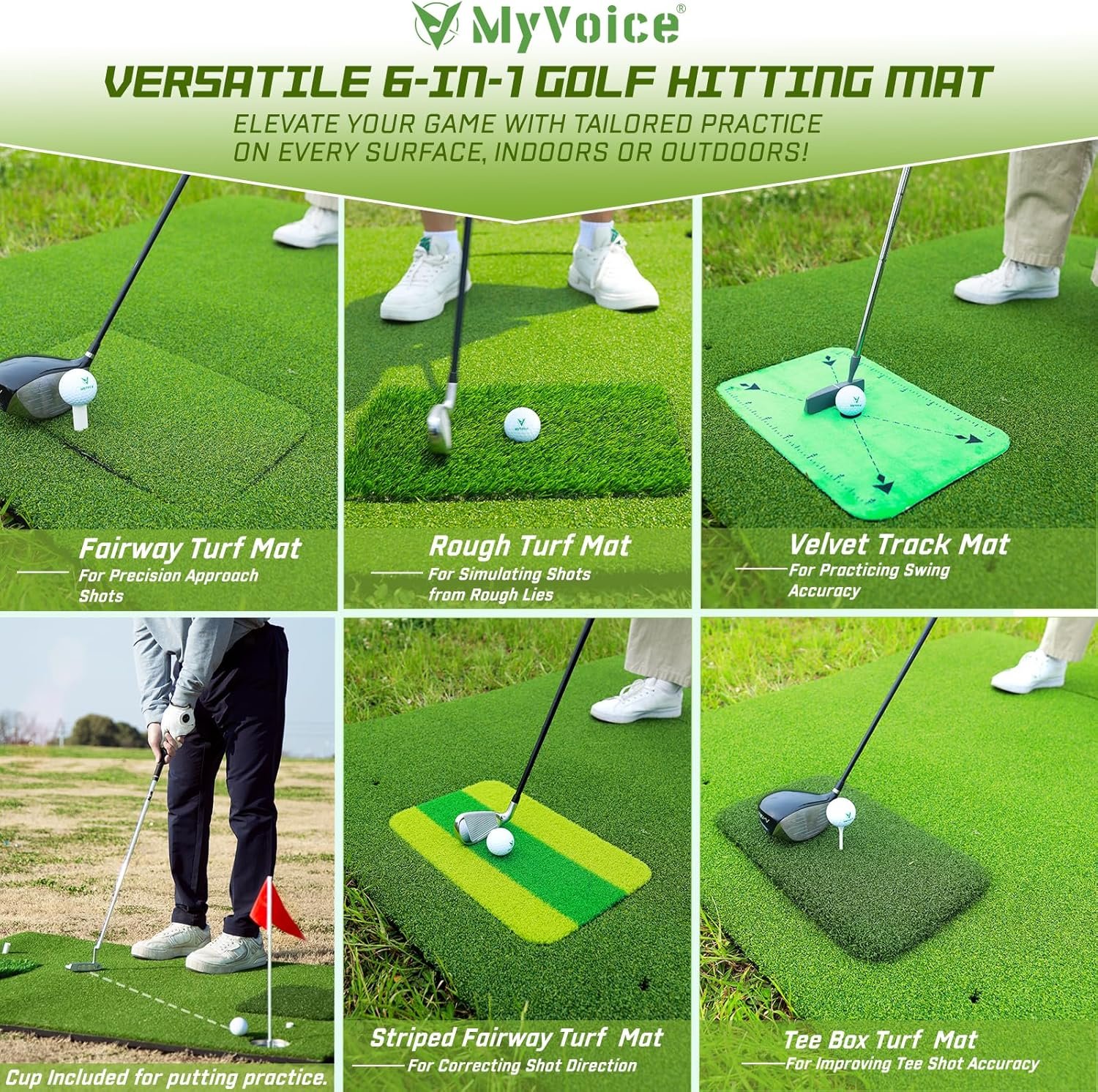 - Master & Improve Your Swing: MyVoice 6-in-1 Golf Hitting Mat is your ultimate golf training mat for swing training; With interchangeable turfs, it offers a comprehensive solution for refining your swing skills; Whether you’re a beginner, seasoned pro, or elite player, this mat ensures diverse training options; Elevate your golf swing techniques with MyVoice golf mat that cater to every skill level; It also includes a putting cup and a cup hole on the mat for putting practice, adding versatility