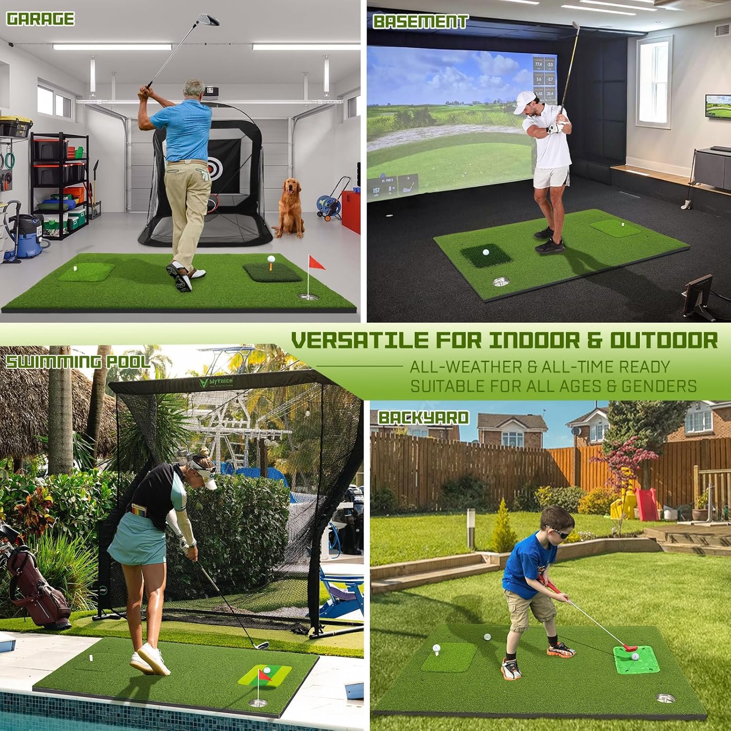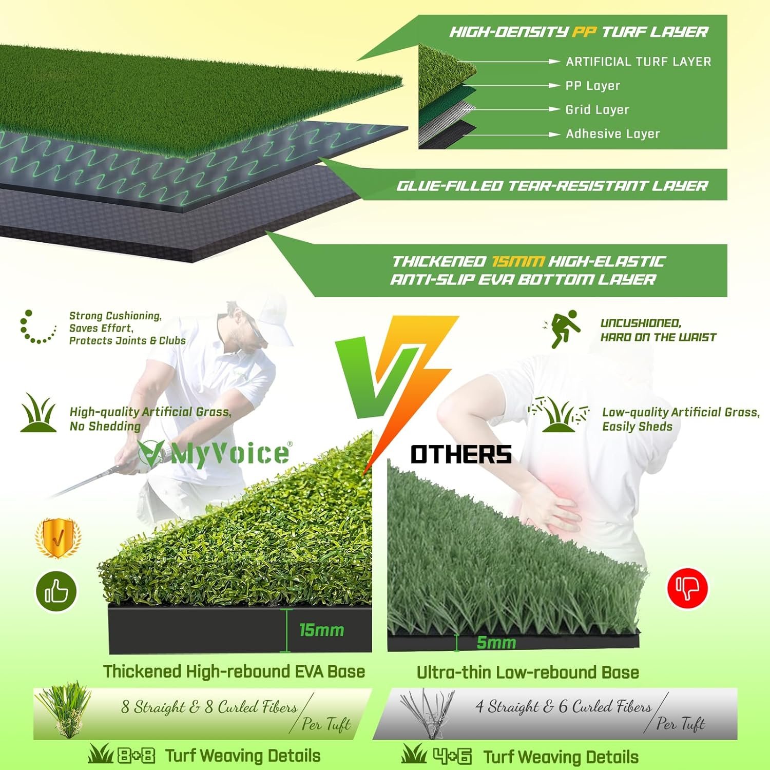 - Versatile Indoor/Outdoor Golf Practice: MyVoice’s golf mat is your ultimate solution for convenient and effective golf practice; Tailored for both indoor and outdoor use, it allows you to refine your skills in various settings, be it the backyard, garage, or any available space; This versatile mat, with features like golf divot mat, golf green mat, and upgraded golf turf, provides a comprehensive training experience; A nice tool for golf enthusiasts of all ages