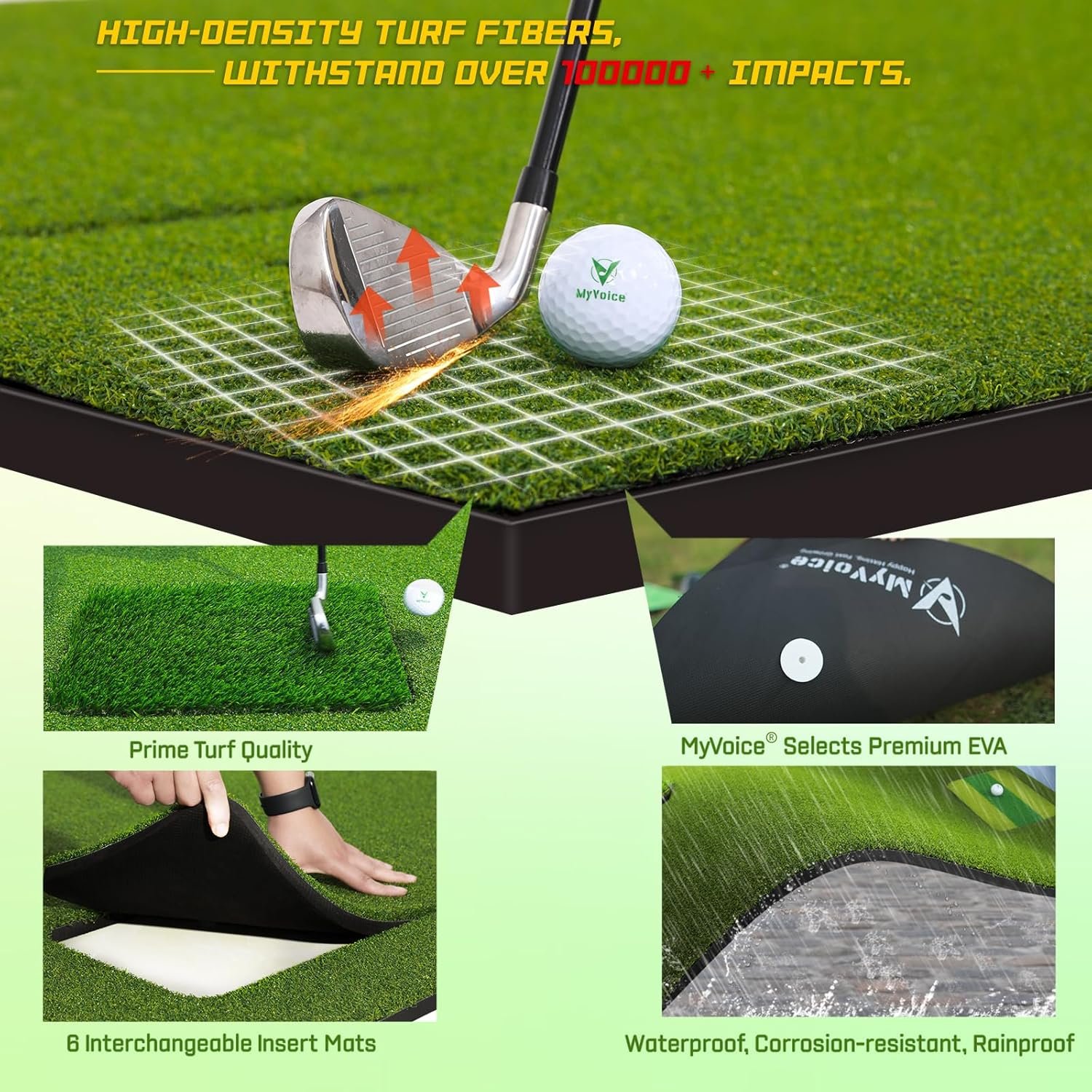 - Dynamic Golf Hitting Mats Solution With Independent Functionality: Elevate your skills with MyVoice’s 5×4 ft golf mat – 1.2″ total thick turf mat and uniquely independent interchangeable mats; Whether for golf mats practice indoor or outdoor, each insert mat serves as a standalone golf hitting mat; Tailored for both left and right-handed golfers, this golf turf practice mat offers a comprehensive solution for mastering swings