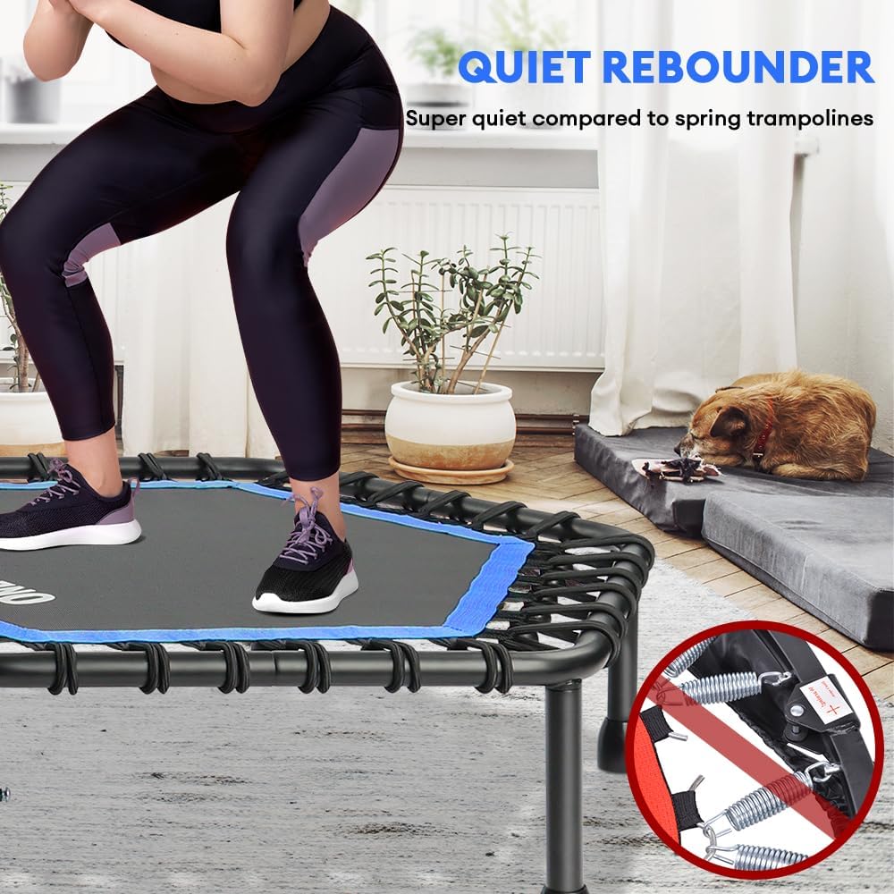 - QUIET DESIGN – bungee trampoline 95% less noise compared to spring trampoline. Perfect for indoor outdoor exercise, jumping on a mini trampoline for 10 Minutes equals 1 hour jogging, 30 minutes cycling, or 20 minutes swimming, a fun way to increase movement.