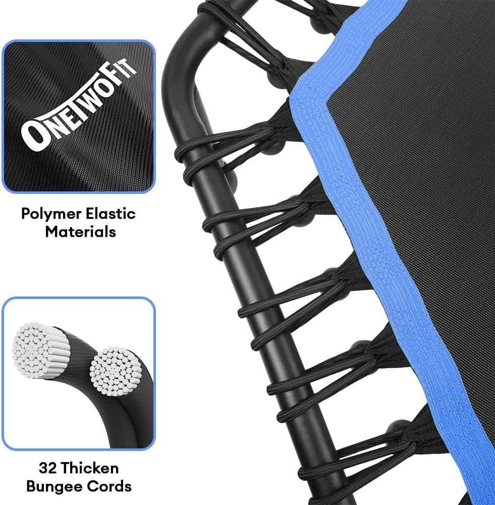 - EXCELLENT JUMPING SYSTEM – Anti-wear and tear-resistant rebounding surface matches with 32 polymer cord bungees, offering a powerful elastics recovery system to jump efficiently and safely. The low-impact bungee workout also puts minimal stress on your joints