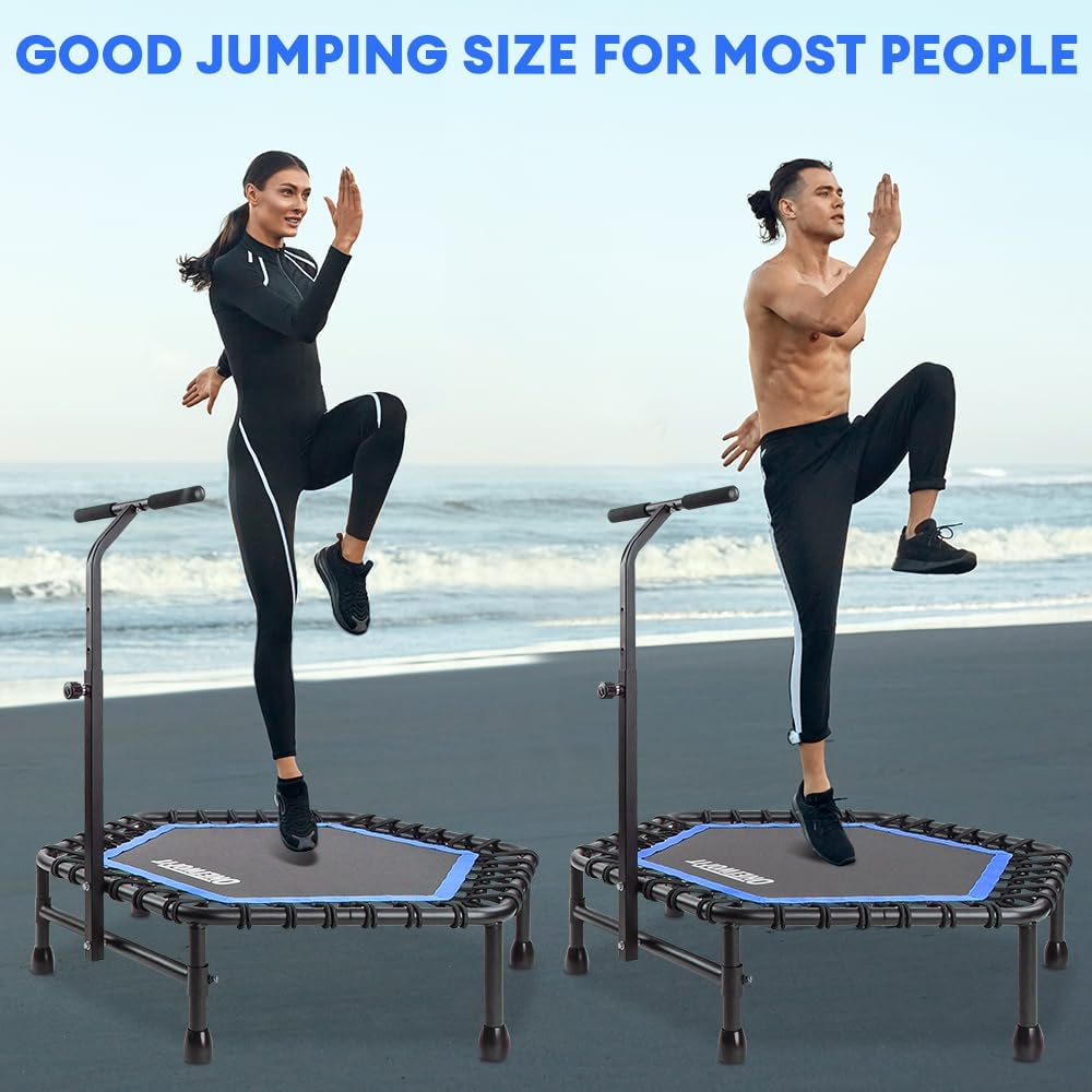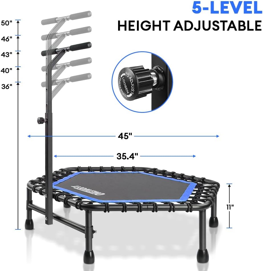 - HEAVY DUTY CONSTRUCTION – ONETWOFIT Fitness trampoline made of heavy steel, passes 3000 continuous jump experiments. Make sure you can jump for the long term. 42″ frame size gives you jumping more freedom.