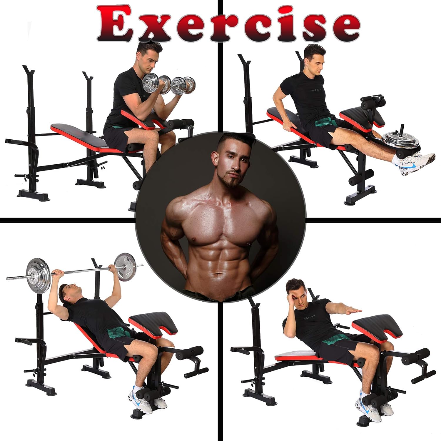 - [Foldable & Adjustable]: You can make different adjustments according to your different needs. Backrest adjusts for flat/incline positions. Adjustable uprights can be adjusted to 5 levels. Height adjustable and folded design brings more convenience to your exercising.