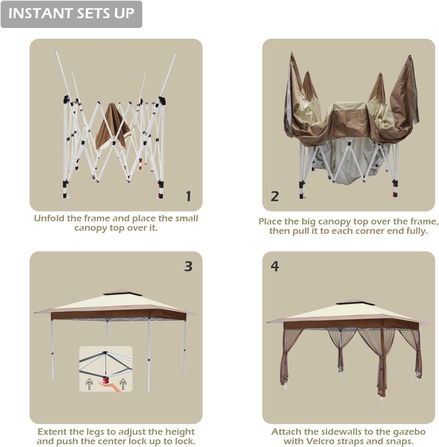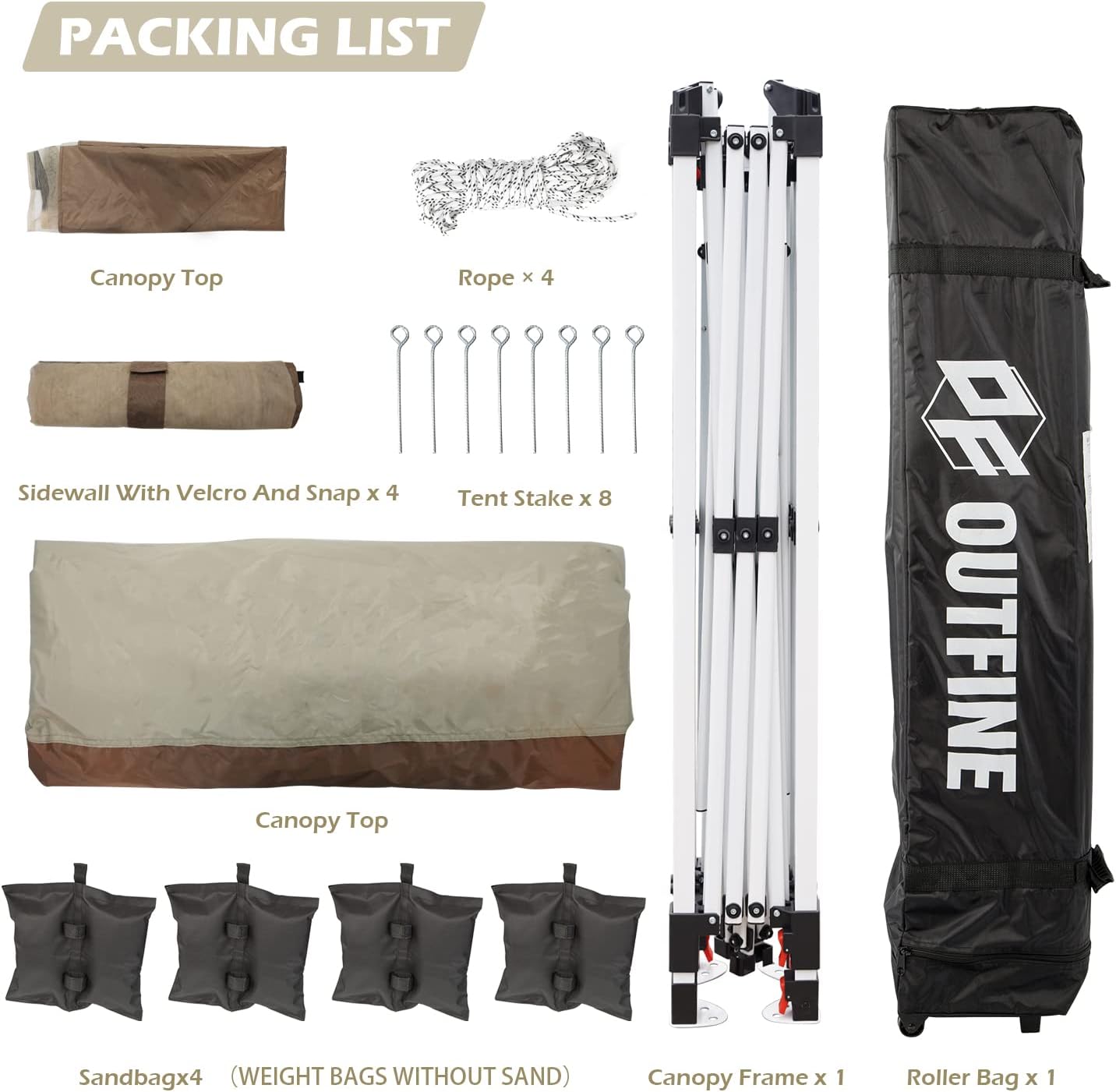 - FULL SET OF SUPPORT PARTS AND EASY INSTALLATION-A set: 12 x 12 Ft pop up canopy frame, canopy top x 2, sidewall with Velcro and snaps x 4, tent stake x 8, sandbag x 4, roller Bag x 1.The roller bag is made of 600D coated PVC fabric. Only two people can set up in a few minutes: 1. Open the frame 2. Fix the canopy top 3. Adjust the height 4. Install the sidewalls 5. Tie sandbags or tent stakes for fixation. Three different height settings allow you to choose, 73 inches, 77 inches and 81 inches.