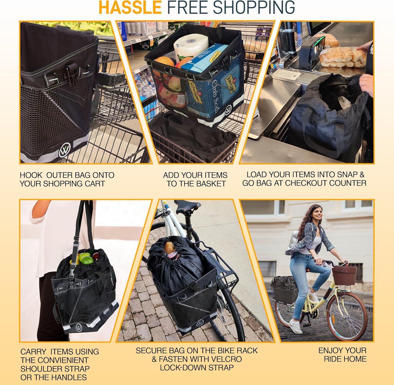 - DUAL STURDY HANDLES – Effortlessly carry and help protect the environment! Our bike grocery carrier features reinforced handles on the outside and inside, ensuring maximum stability and convenience of pannier bag bike while reducing carbon emissions.