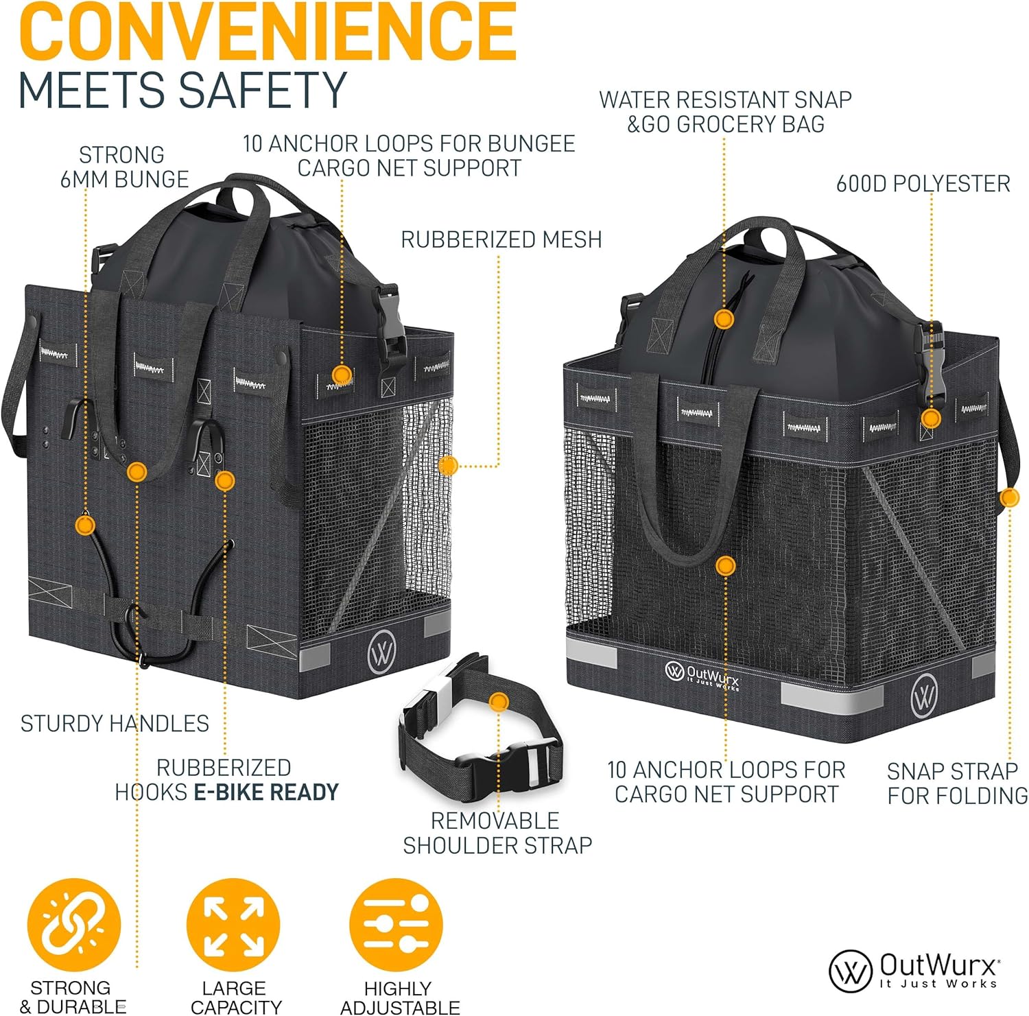 - SHOULDER STRAP INCLUDED – Experience unparalleled ease while transporting your groceries with the included shoulder strap in our bicycle panniers, allowing for comfortable carrying on and off the bike.