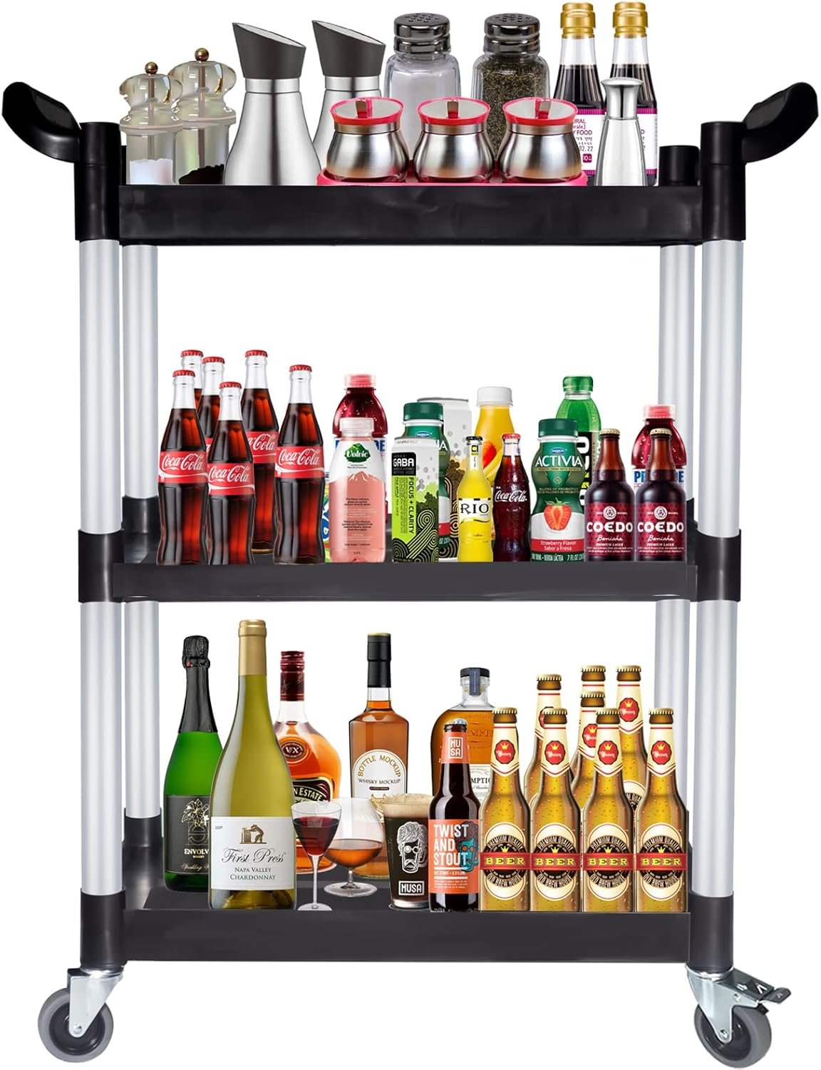 - EASY TO MOVE & LOAD – Our restaurant food cart features four swiveling roller wheels for easy operating. Two of the wheels have brakes. The 1″ plastic side on the tray’s back and both sides keep items safe and secure, while the flat front between trays allows you to slide items on and off the cart easily.