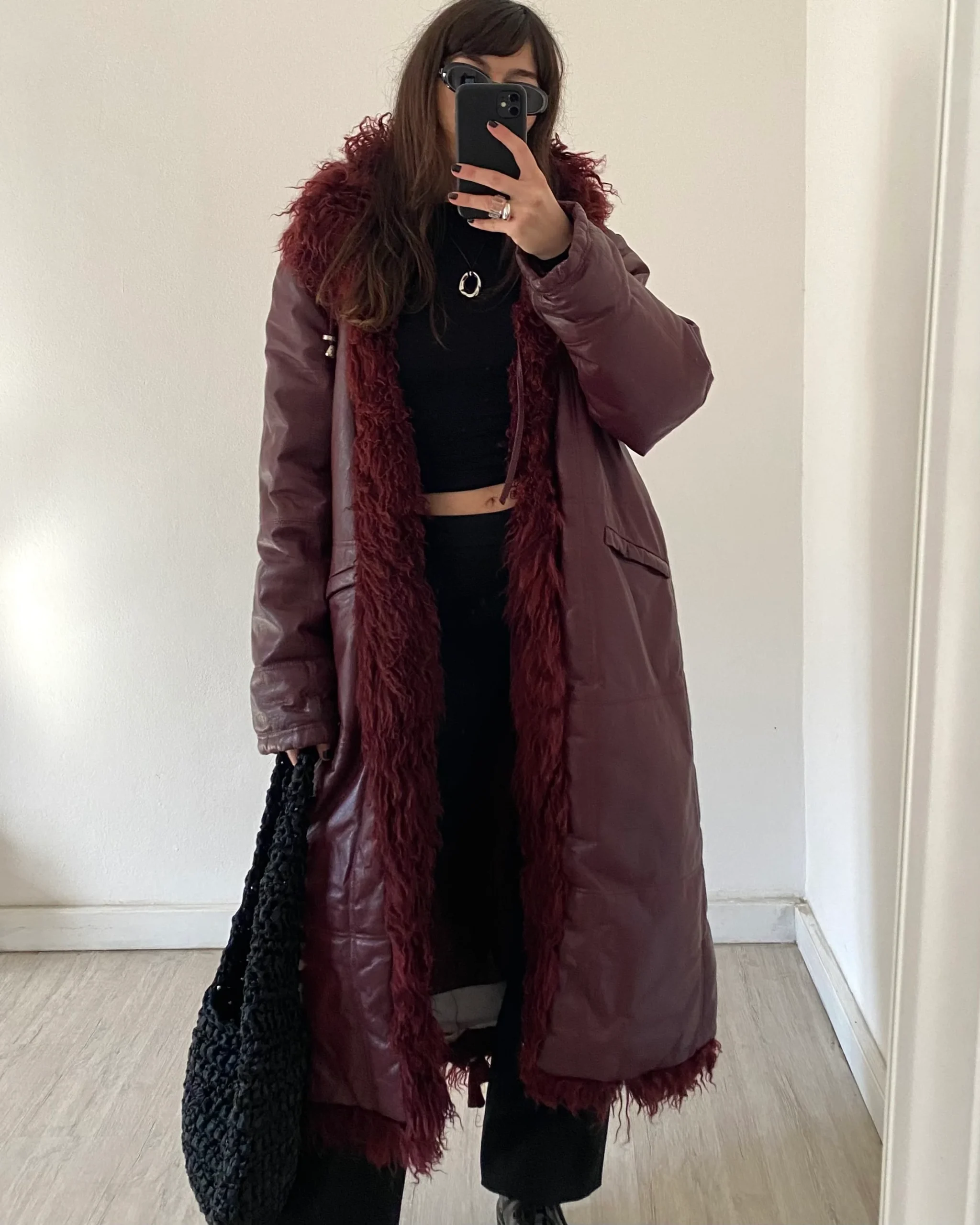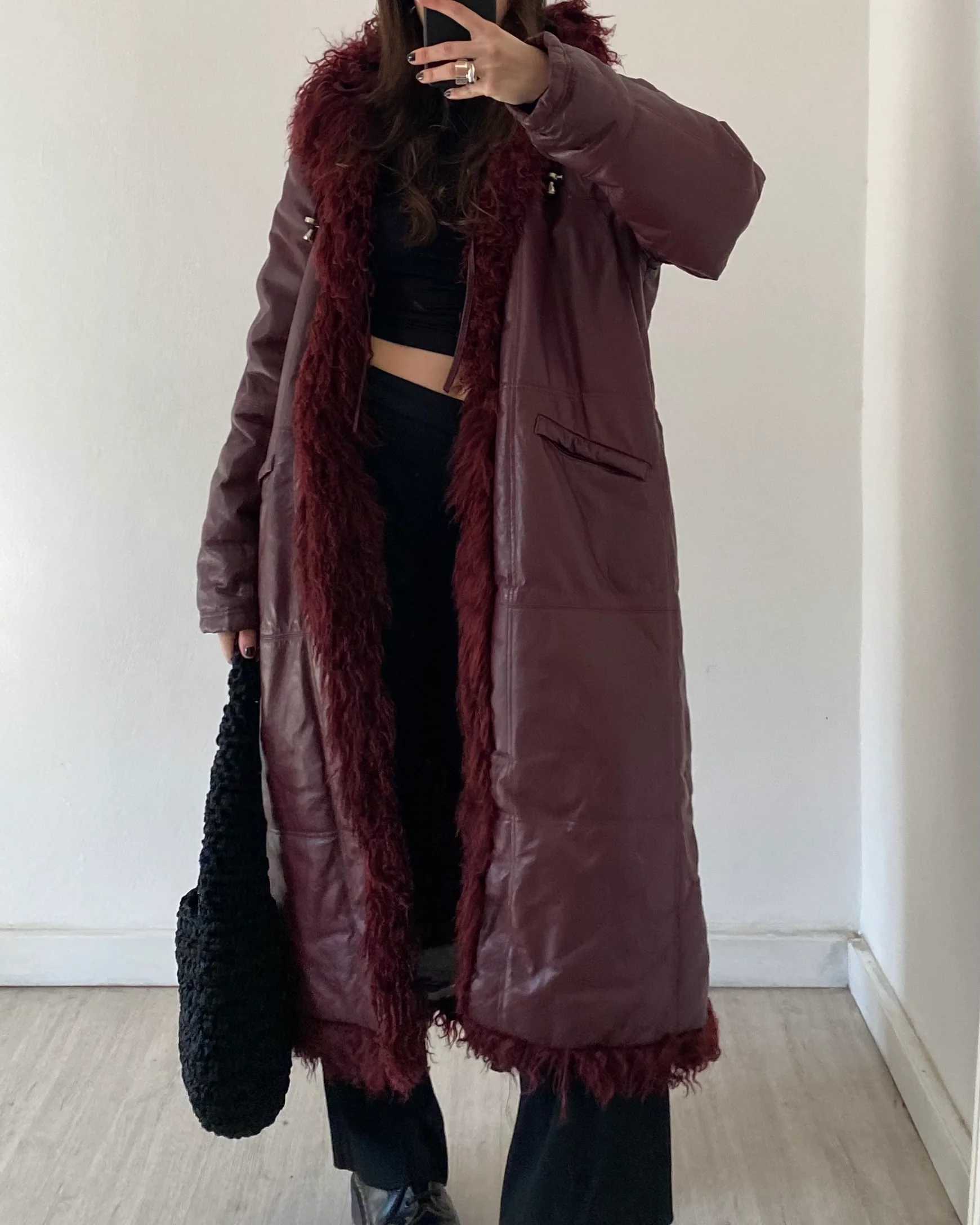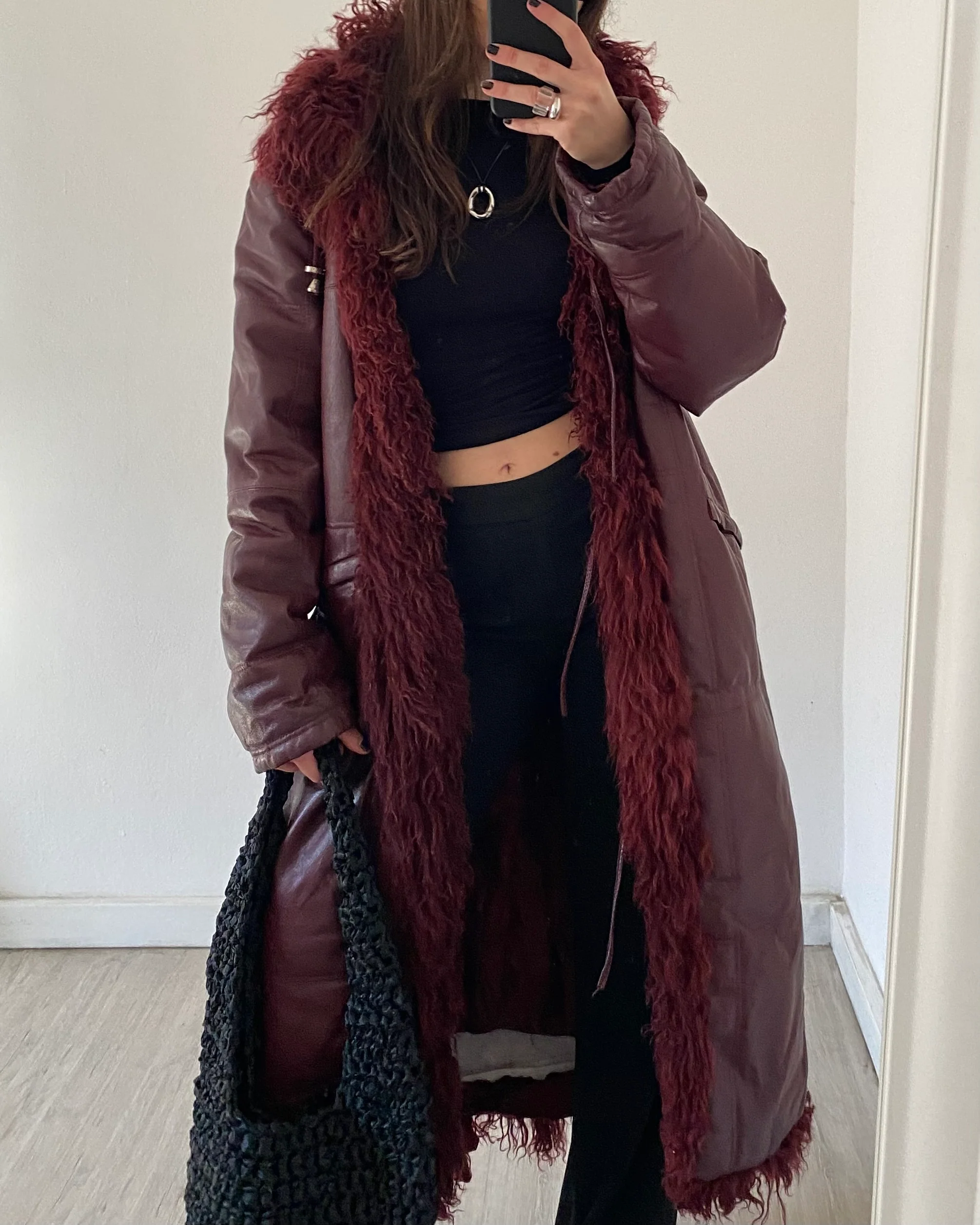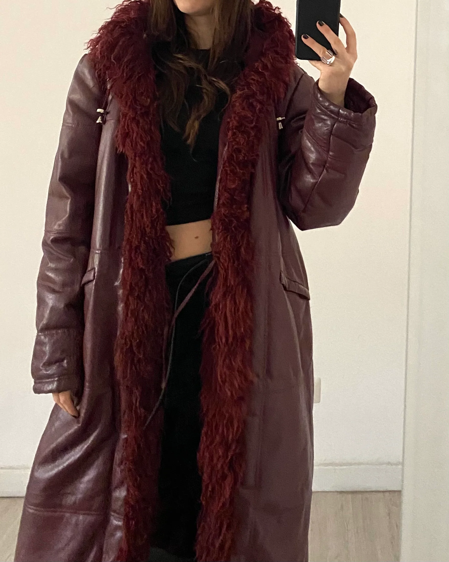Meraviglioso cappotto lungo in pelle vintage anni 2000 con inserti in pelliccetta e cappuccio, chiusura frontale con laccetti, fodera interna. Imbottitura in polyester che lo rende perfetto anche d'inverno.