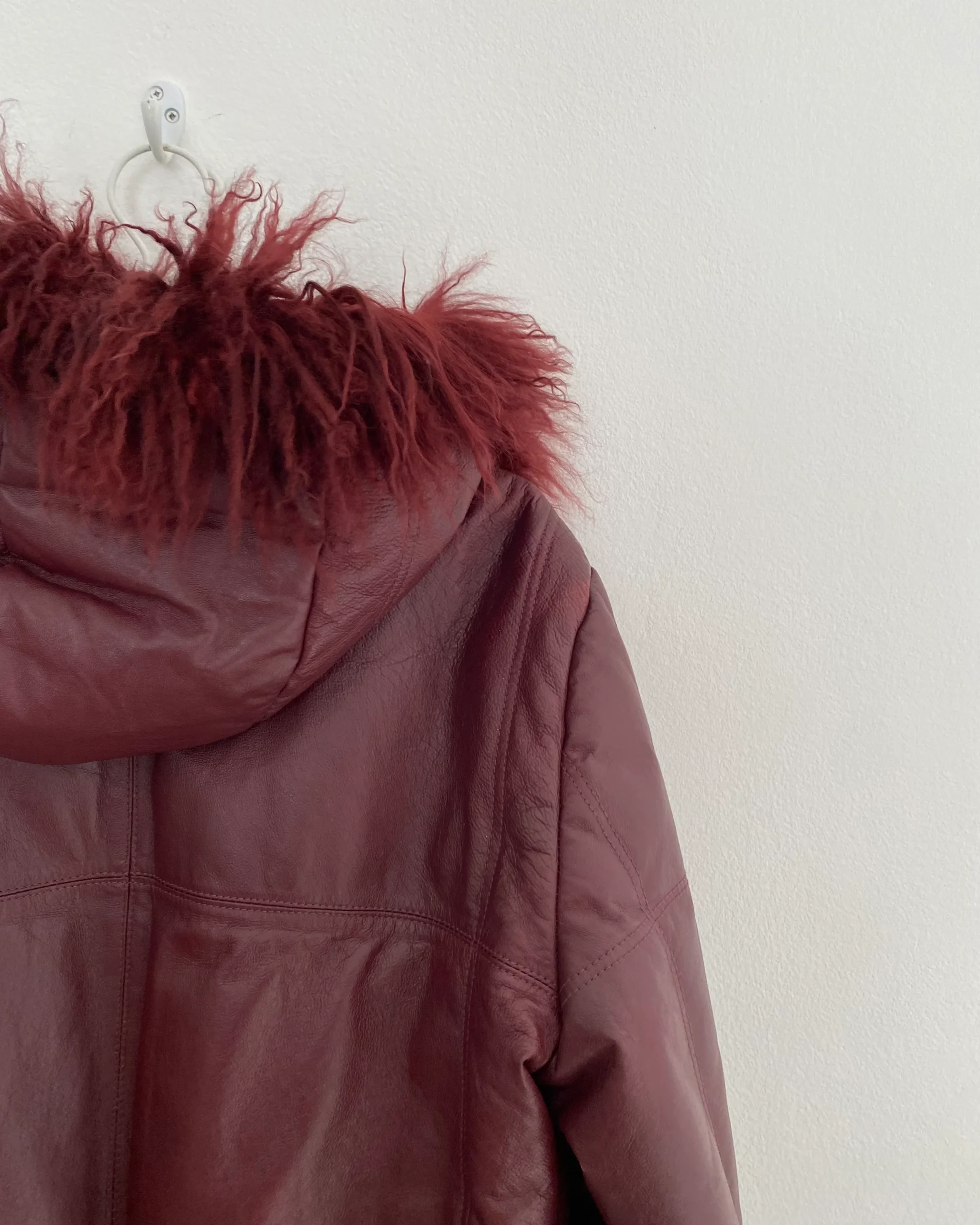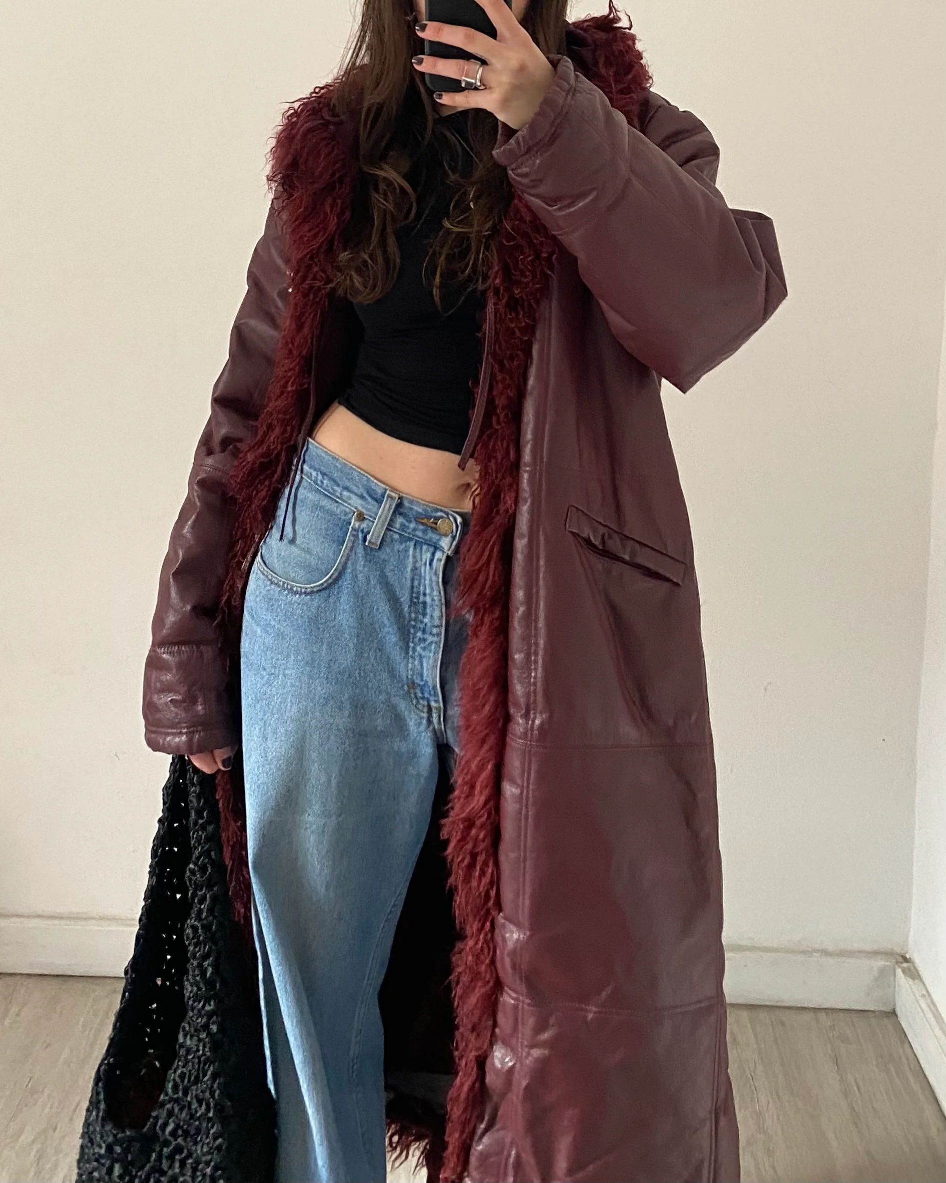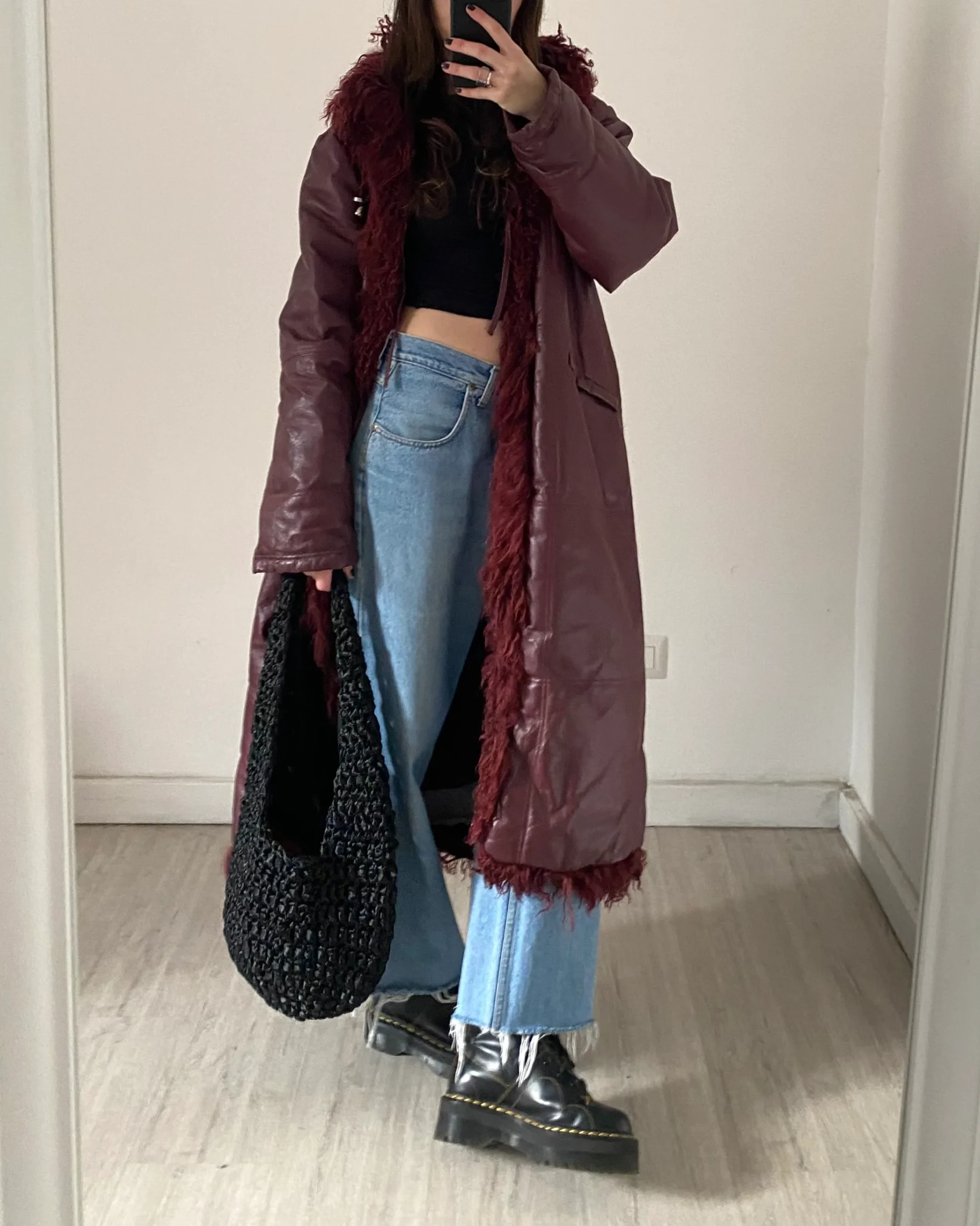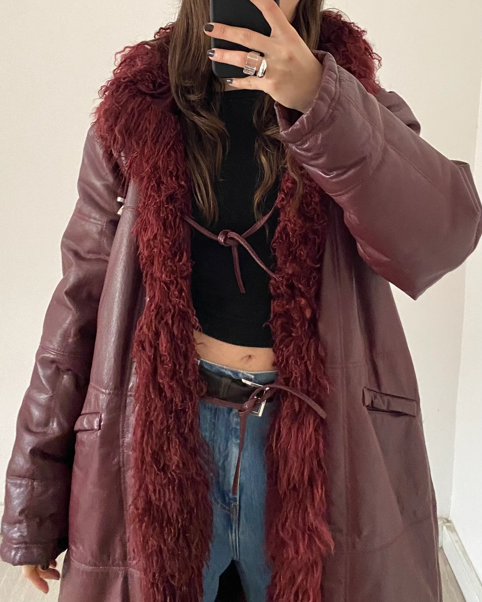 Meraviglioso cappotto lungo in pelle vintage anni 2000 con inserti in pelliccetta e cappuccio, chiusura frontale con laccetti, fodera interna. Imbottitura in polyester che lo rende perfetto anche d'inverno.