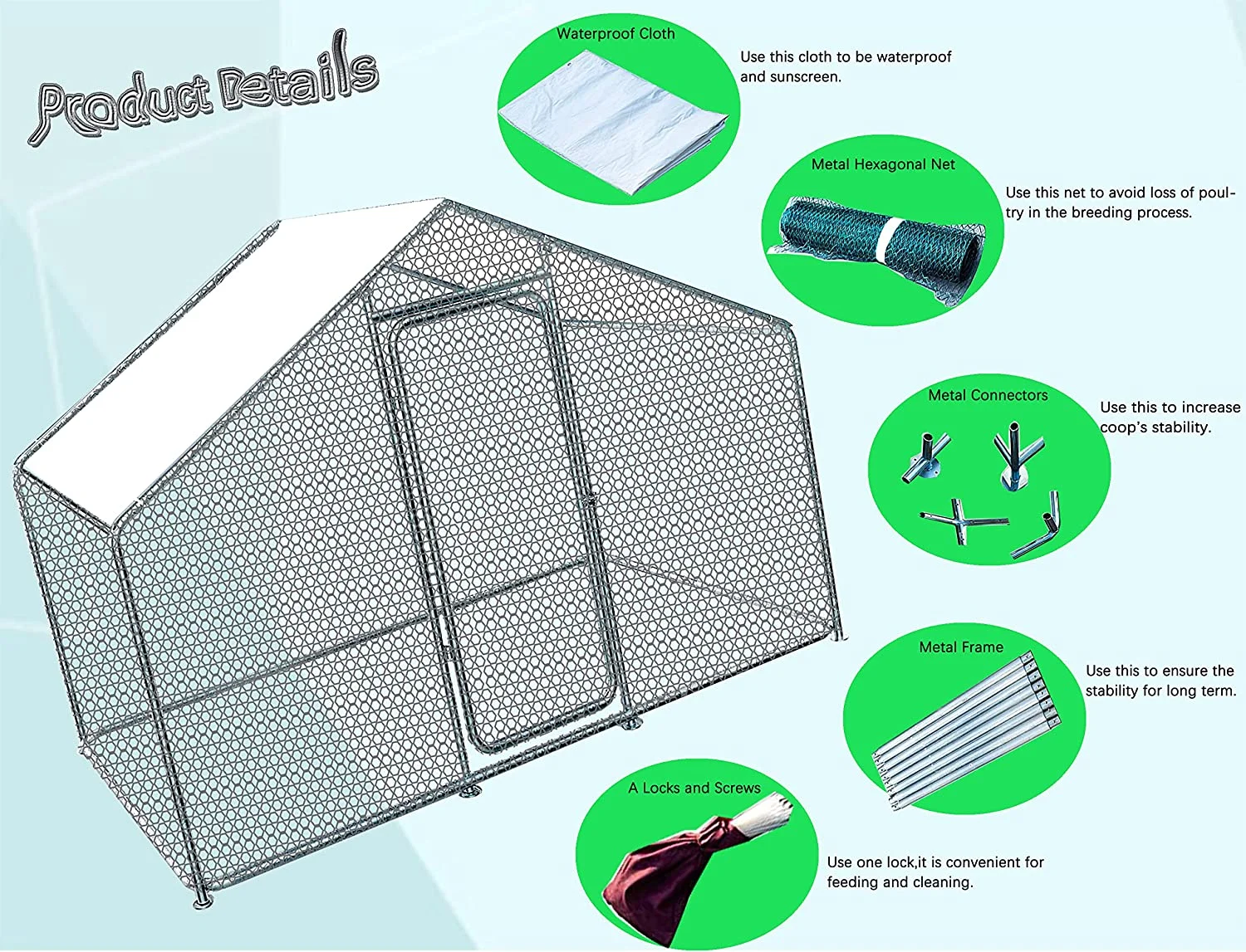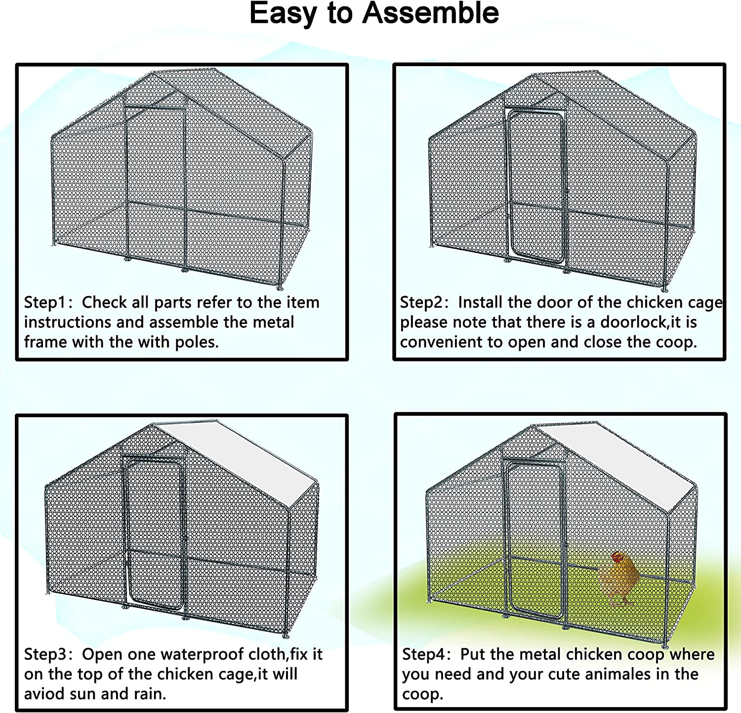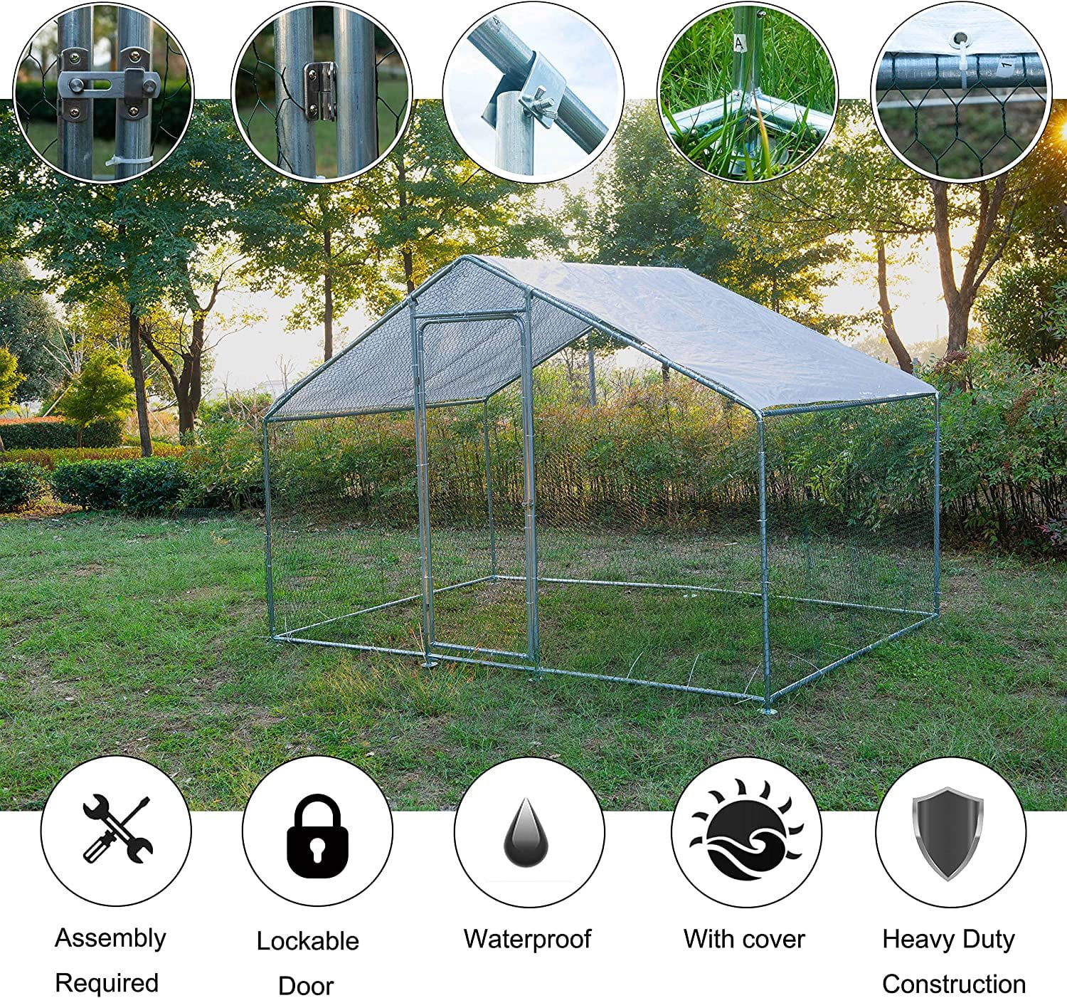 Versatile and Spacious: This walk in metal chicken coop is designed to accommodate animals of various sizes, ranging from chickens and ducks to rabbits and cats. With an overall dimension of 10?? L x 6.6?? W x 6.6?? H, your pets will have plenty of room to play and roam Durable steel construction: Manufactured with a high-quality steel frame, the chicken coop is solid enough for your chicken to have free space in it. And it is not easy to damage, which can prolong the long-term service time. The quick-connect frame allows for easy assembly. large metal coop outdoor chicken rabbit coop Secure and Convenient: The coop features a safety lockable steel door with a latch and steel wire ties to ensure extra safety for your pets. The essential pedestals included in the design make it a comfortable and secure home for any poultry. The door design also allows for easy feeding and cleaning. Easy to Maintain: The galvanized tube is rust-resistant and easy to clean, providing a clean environment for your pets. The smooth surface can be easily wiped with a wet cloth or some running water, making maintenance a breeze. The coop also provides protection to your pets while giving them plenty of room to forage. Ideal for Outdoor Use: The coop comes with a durable UV and water-resistant cover that protects your pets from the weather and other outdoor elements. Its galvanized design ensures protection from rust, corrosion, and fading, making it weatherproof and highly durable. This makes it a great option for outdoor use.