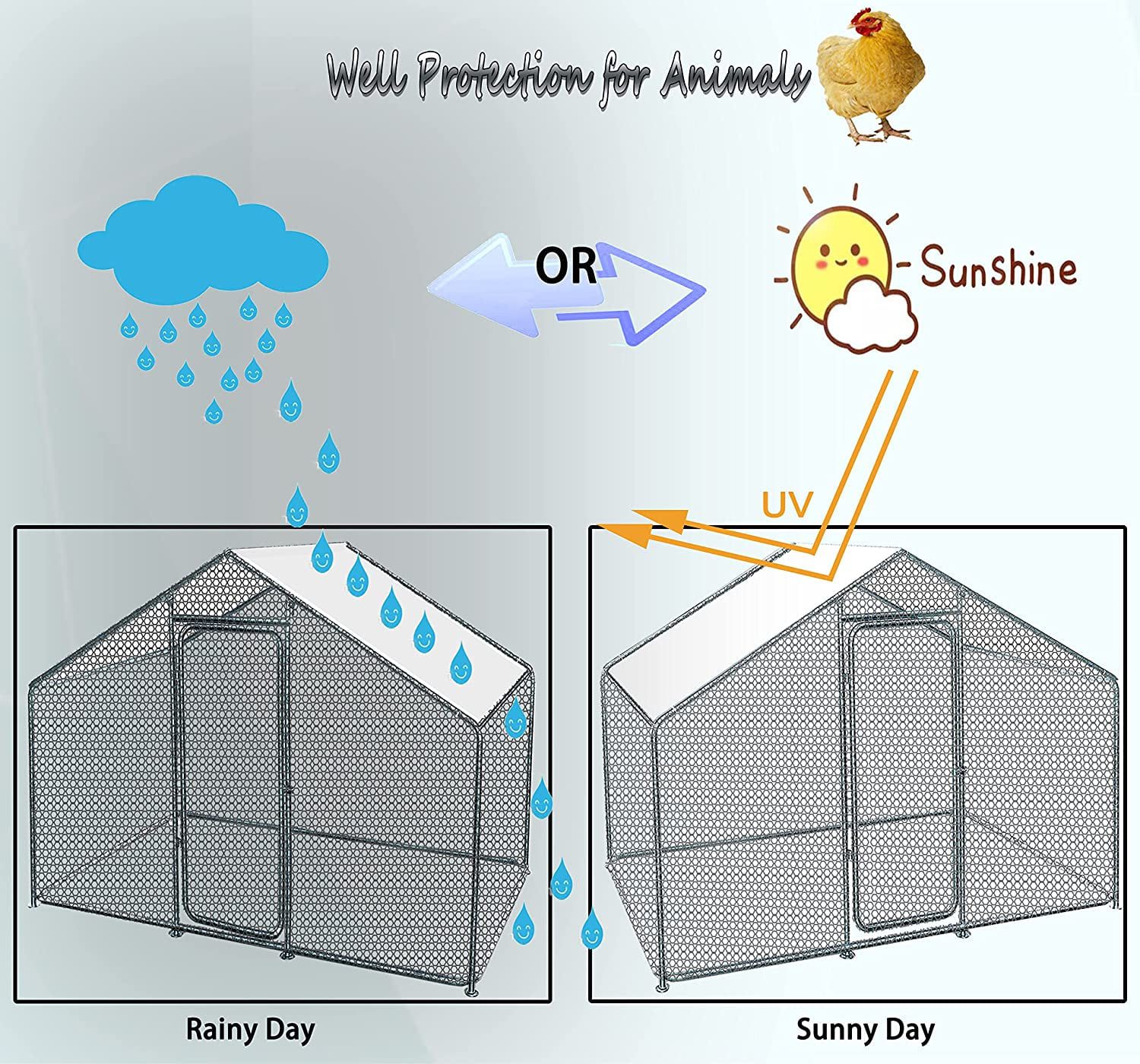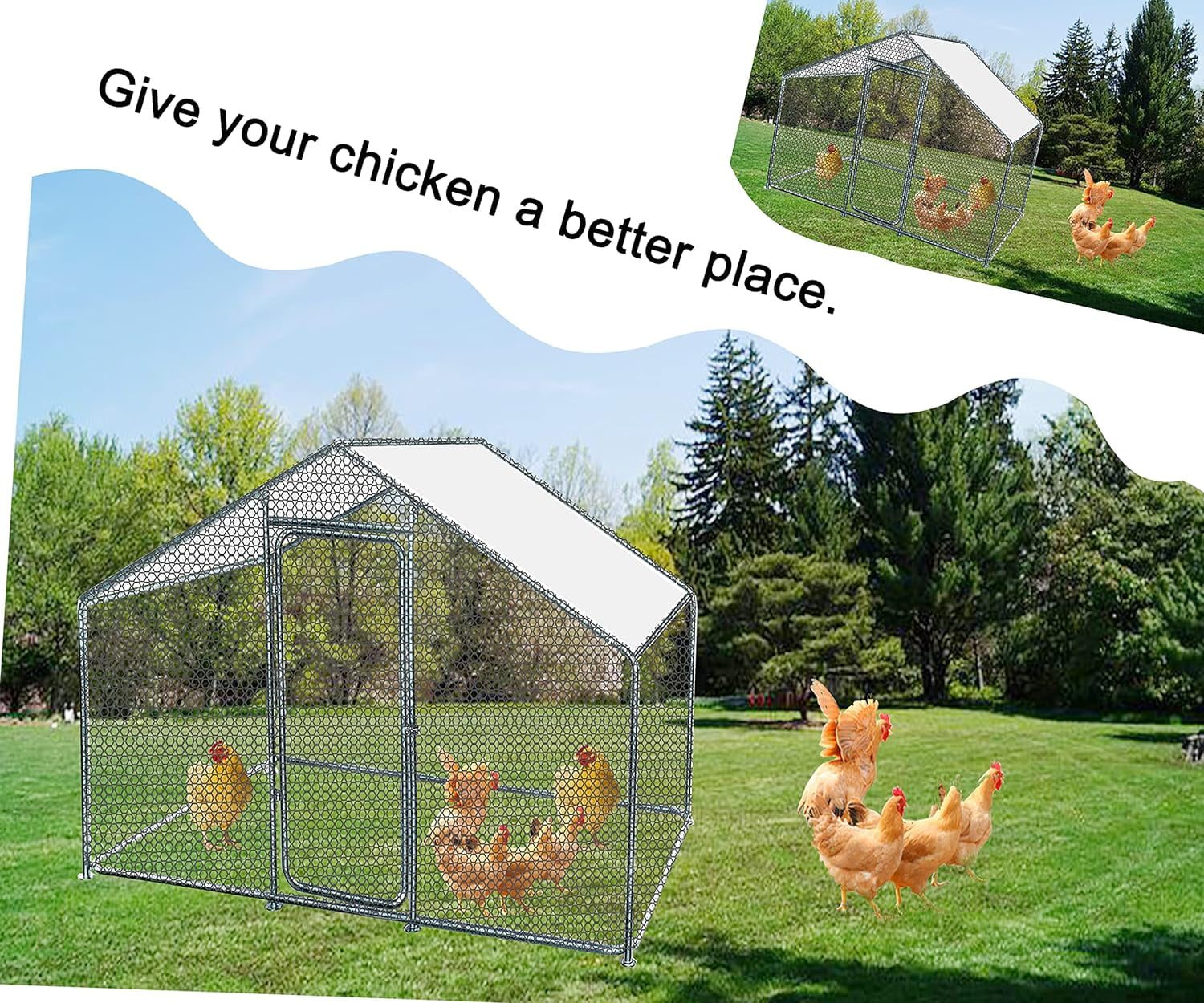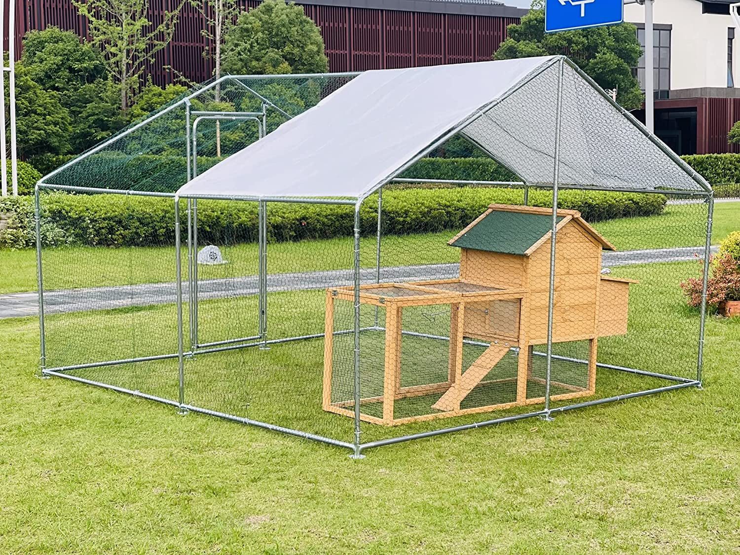 Versatile and Spacious: This walk in metal chicken coop is designed to accommodate animals of various sizes, ranging from chickens and ducks to rabbits and cats. With an overall dimension of 10?? L x 6.6?? W x 6.6?? H, your pets will have plenty of room to play and roam Durable steel construction: Manufactured with a high-quality steel frame, the chicken coop is solid enough for your chicken to have free space in it. And it is not easy to damage, which can prolong the long-term service time. The quick-connect frame allows for easy assembly. large metal coop outdoor chicken rabbit coop Secure and Convenient: The coop features a safety lockable steel door with a latch and steel wire ties to ensure extra safety for your pets. The essential pedestals included in the design make it a comfortable and secure home for any poultry. The door design also allows for easy feeding and cleaning. Easy to Maintain: The galvanized tube is rust-resistant and easy to clean, providing a clean environment for your pets. The smooth surface can be easily wiped with a wet cloth or some running water, making maintenance a breeze. The coop also provides protection to your pets while giving them plenty of room to forage. Ideal for Outdoor Use: The coop comes with a durable UV and water-resistant cover that protects your pets from the weather and other outdoor elements. Its galvanized design ensures protection from rust, corrosion, and fading, making it weatherproof and highly durable. This makes it a great option for outdoor use.