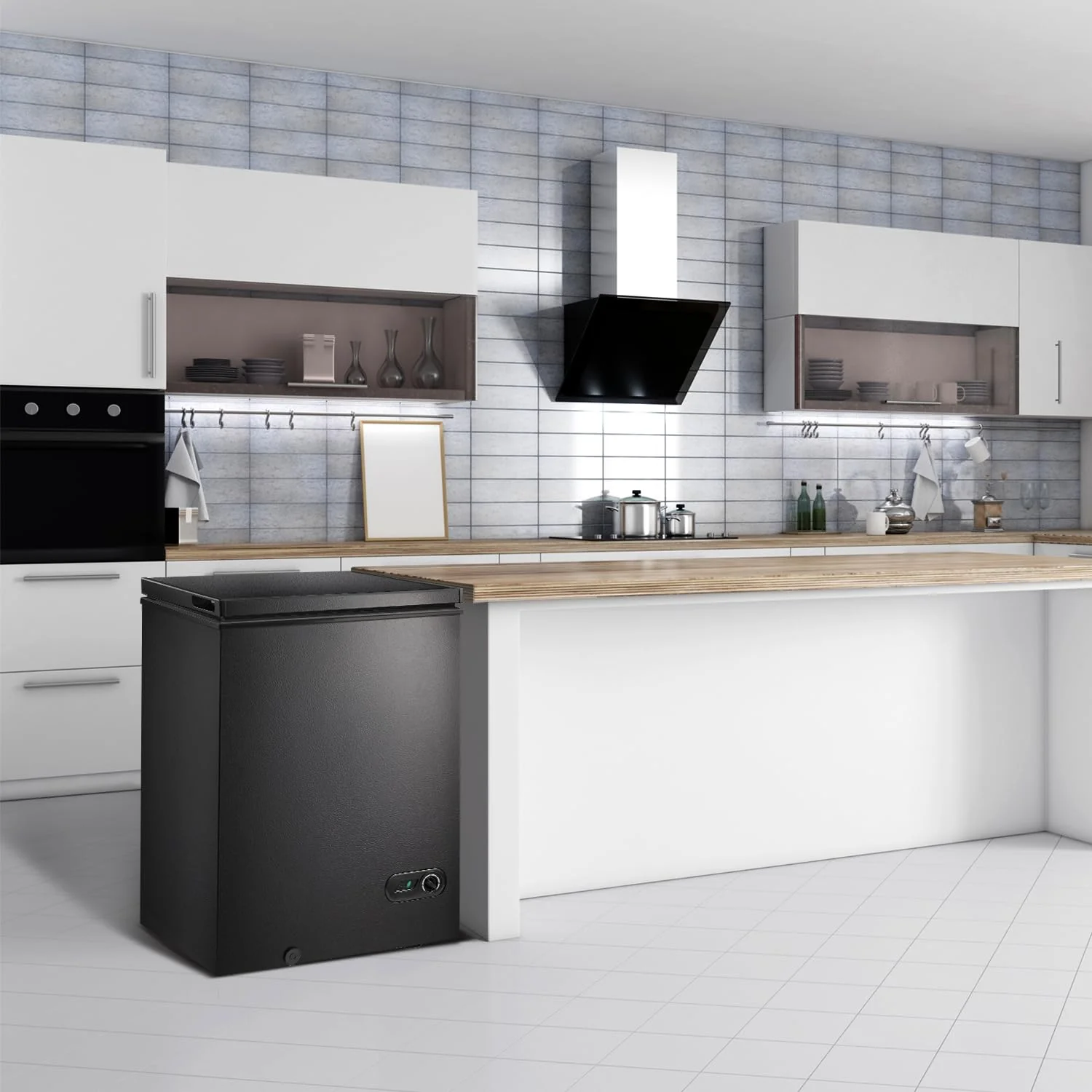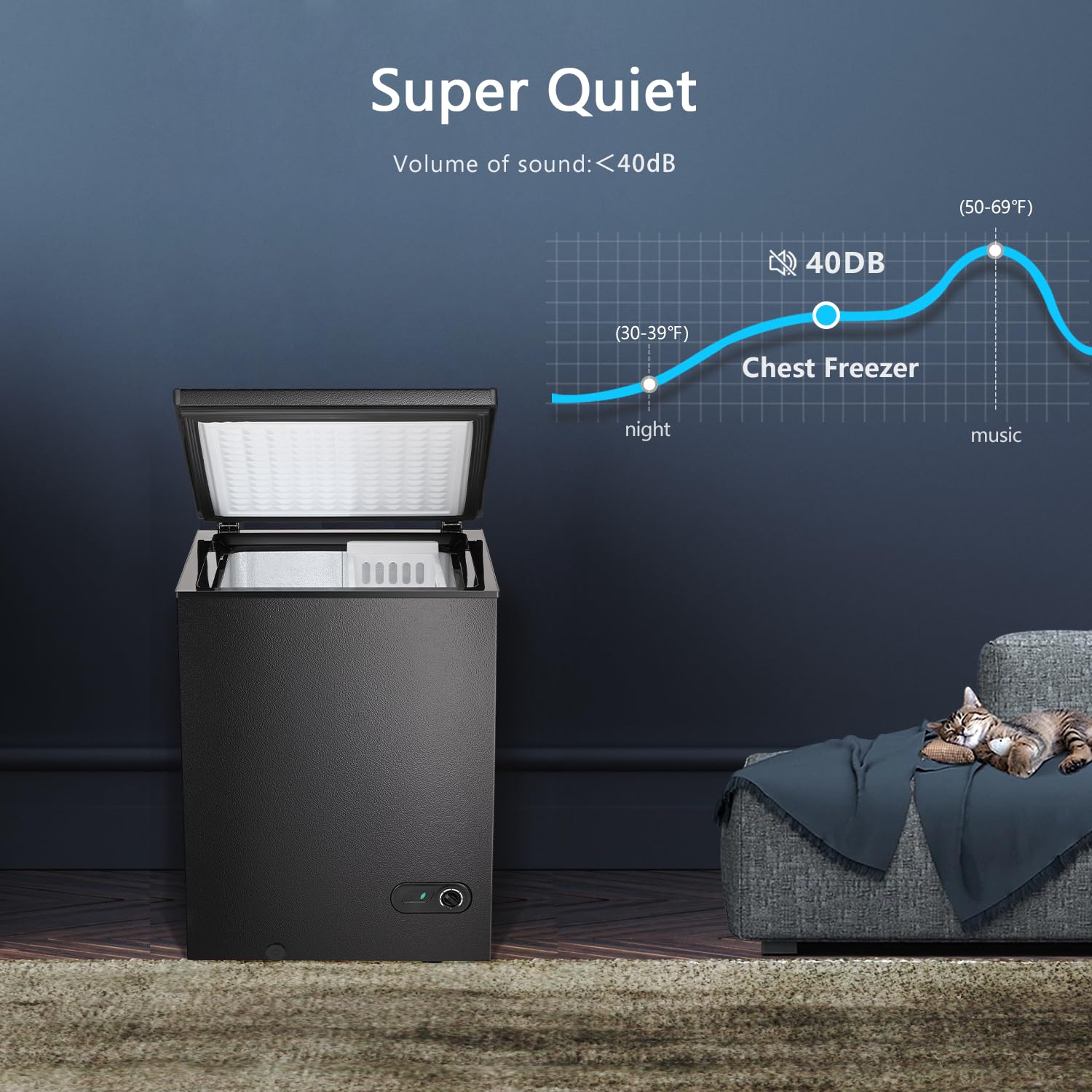 ??3.5 Cu.ft Capacity with 1 Basket??The 3.5 cu.ft chest freezer offers plenty of freezing space for you to store a considerable amount of frozen food, especially those bulky ones, like turkeys, ribs and pizzas. And there is one removable basket provided. You can put small items in this basket and every time you open the freezer, they are always within your reach. ??Thermostat Control & Manual Defrosting??The chest freezer is designed with 7 temperatures for freezing different items according to your needs. It can be adjusted from -7.6?? to 6.8?? (-14??~-22??). And the ??0?? on thermostat dial means shutting down the compressor to stop cooling. Besides, you can defrost with the shovel provided. ??Flip-up Lid with Sealing Strip??This deep chest freezer has a flip-up lid that is connected by premium hinges for smooth lift. And the lid is integrated with sealing strips to achieve better thermal insulation effect. ??Efficient & Quiet Cooling System??The chest freezer adopts an energy-efficient compressor that only consumes 0.6 kWh per day, greatly saving your electricity bill. What’s more, the compressor works at a noise level ?P 40 dB, so no matter day or night, it will not affect your normal work and rest. ??Compact size & Wide Application??The overall dimension of this deep freezer is 21.18?? x 22.05?? x 32.6?? (L x W x H). It has a sleek appearance and is suitable for being embedded in various corners to save space. You can put it in your apartment, garage, basement and more. Technical Details