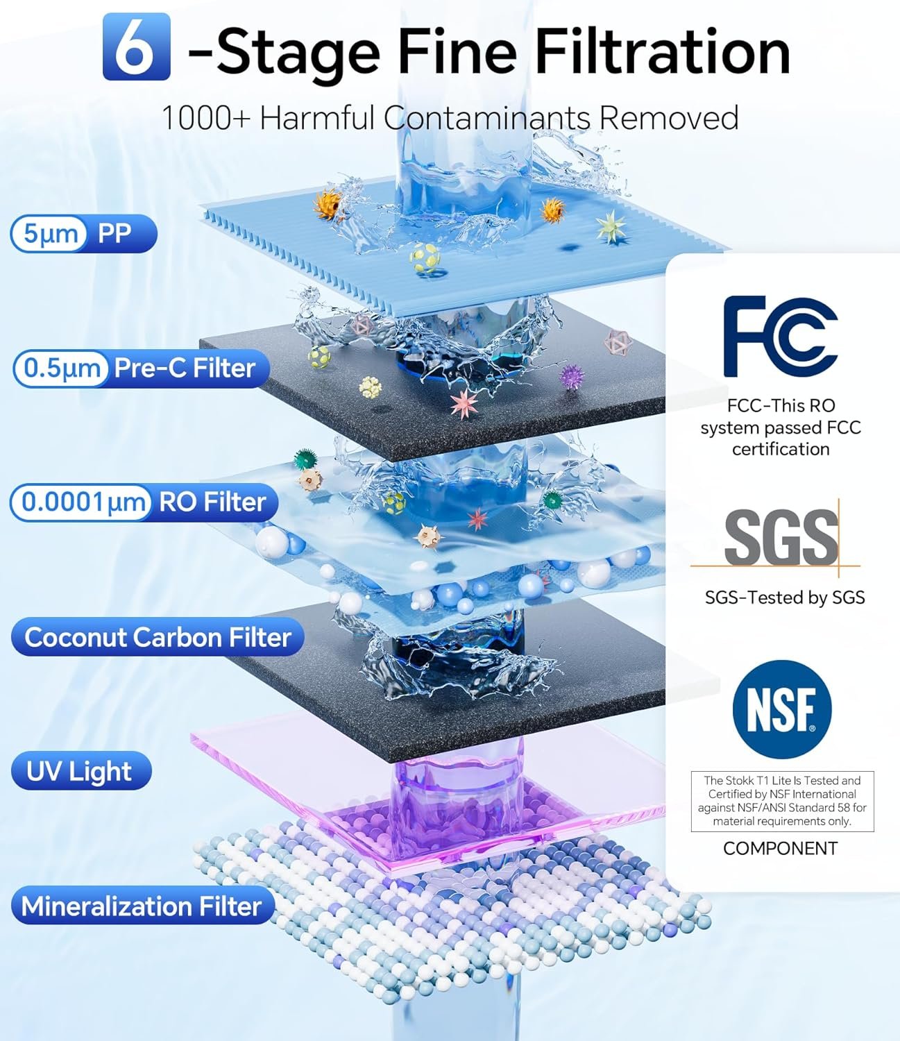 - 6-STAGE FILTRATION & UVC: 6-stage 0.0001??m RO water filtration system removes 1,000+ contaminants with a 99.99% removal rate, including TDS, PFAS, heavy metals (lead, arsenic, aluminum, etc.), fluorides chlorides and more. The built-in UVC avoid secondary pollution caused by long-term non-drinking